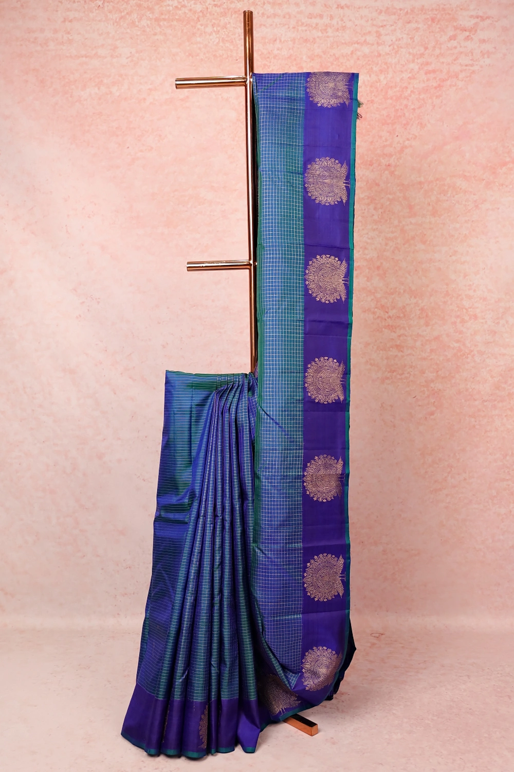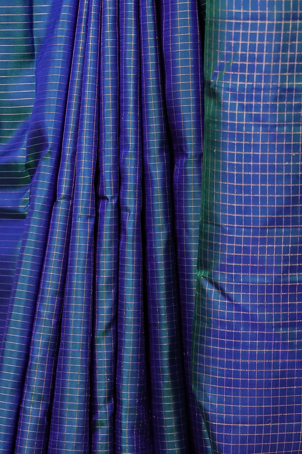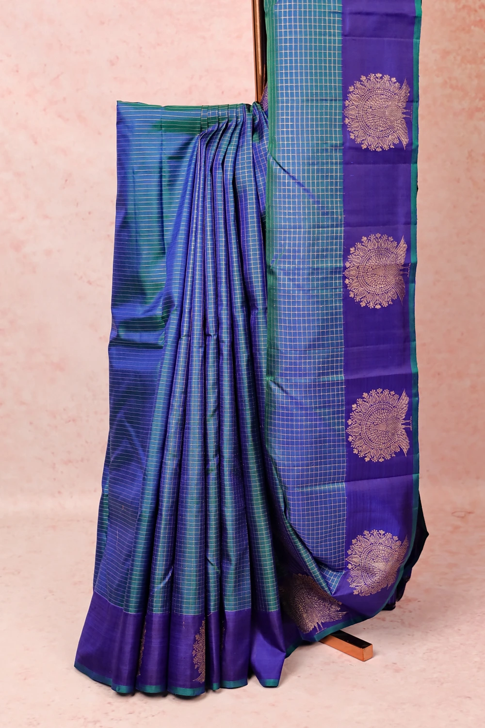 Peacock Green Kancheepuram Silk Check Saree with Peacock border. Includes Unstitched Blouse