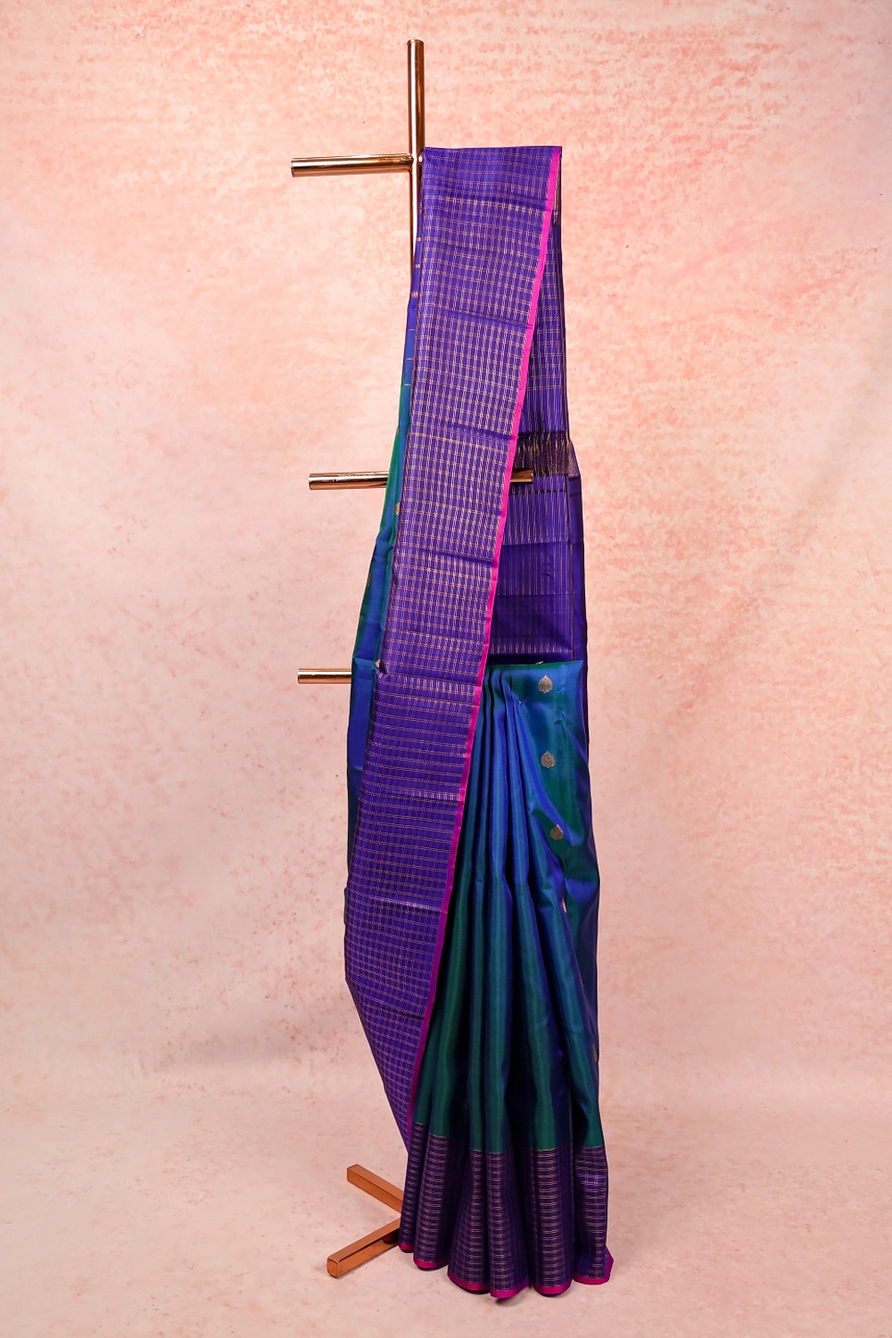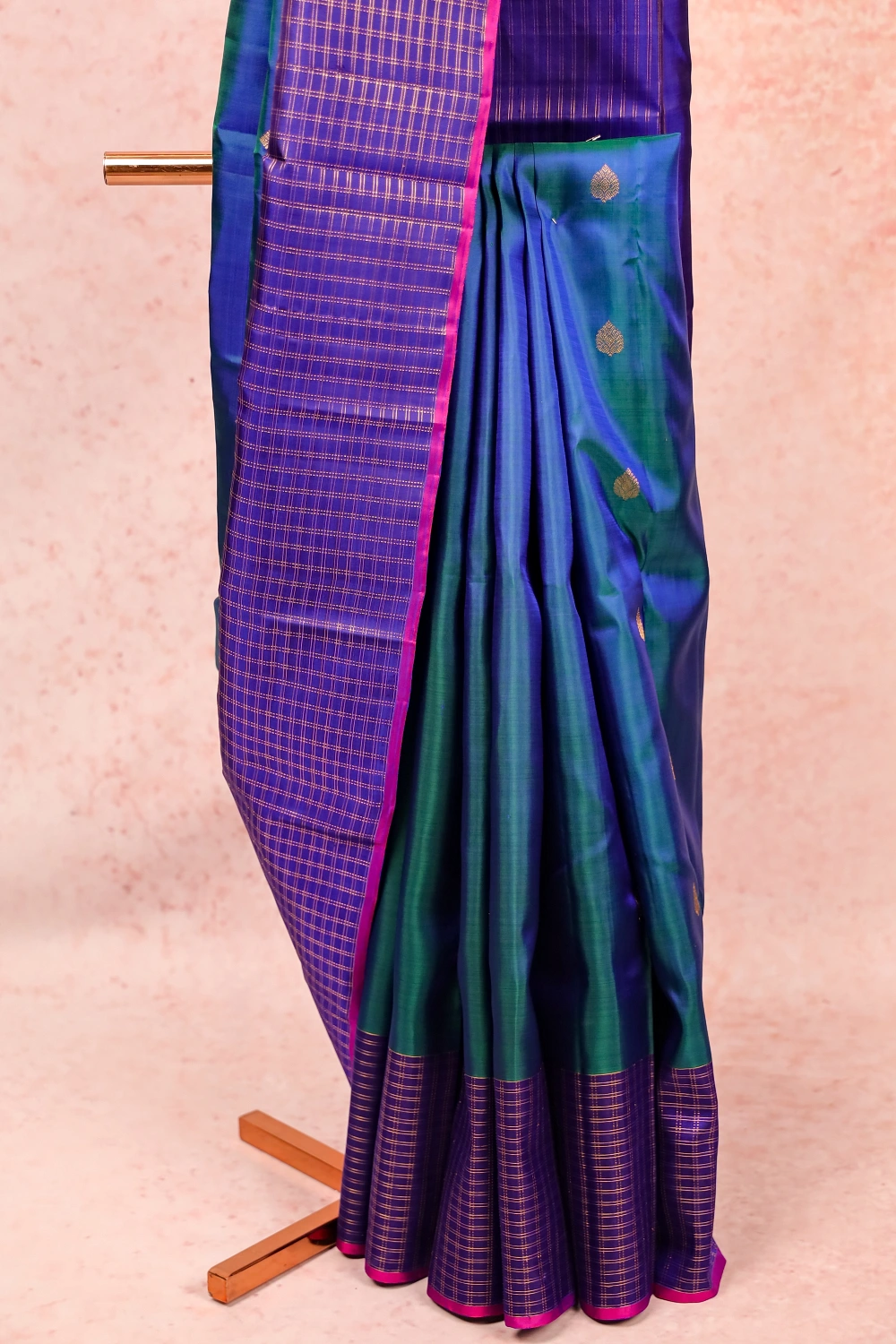 Peacock Green Traditional Kancheepuram Silk Butta Saree with Checks Border. Includes Unstitched Blouse