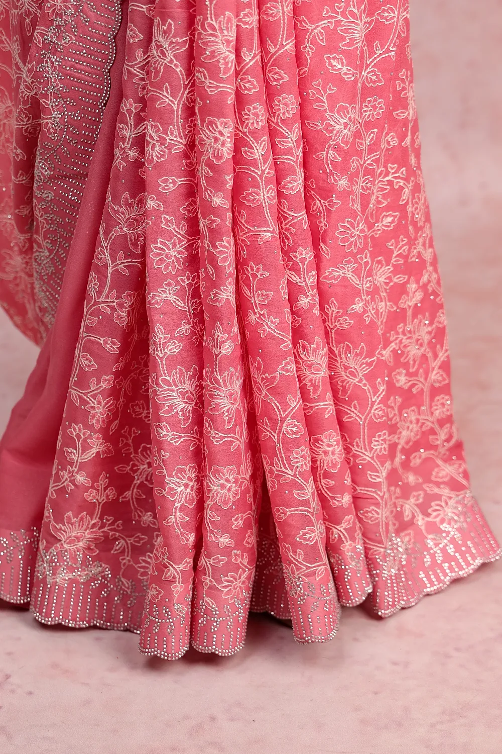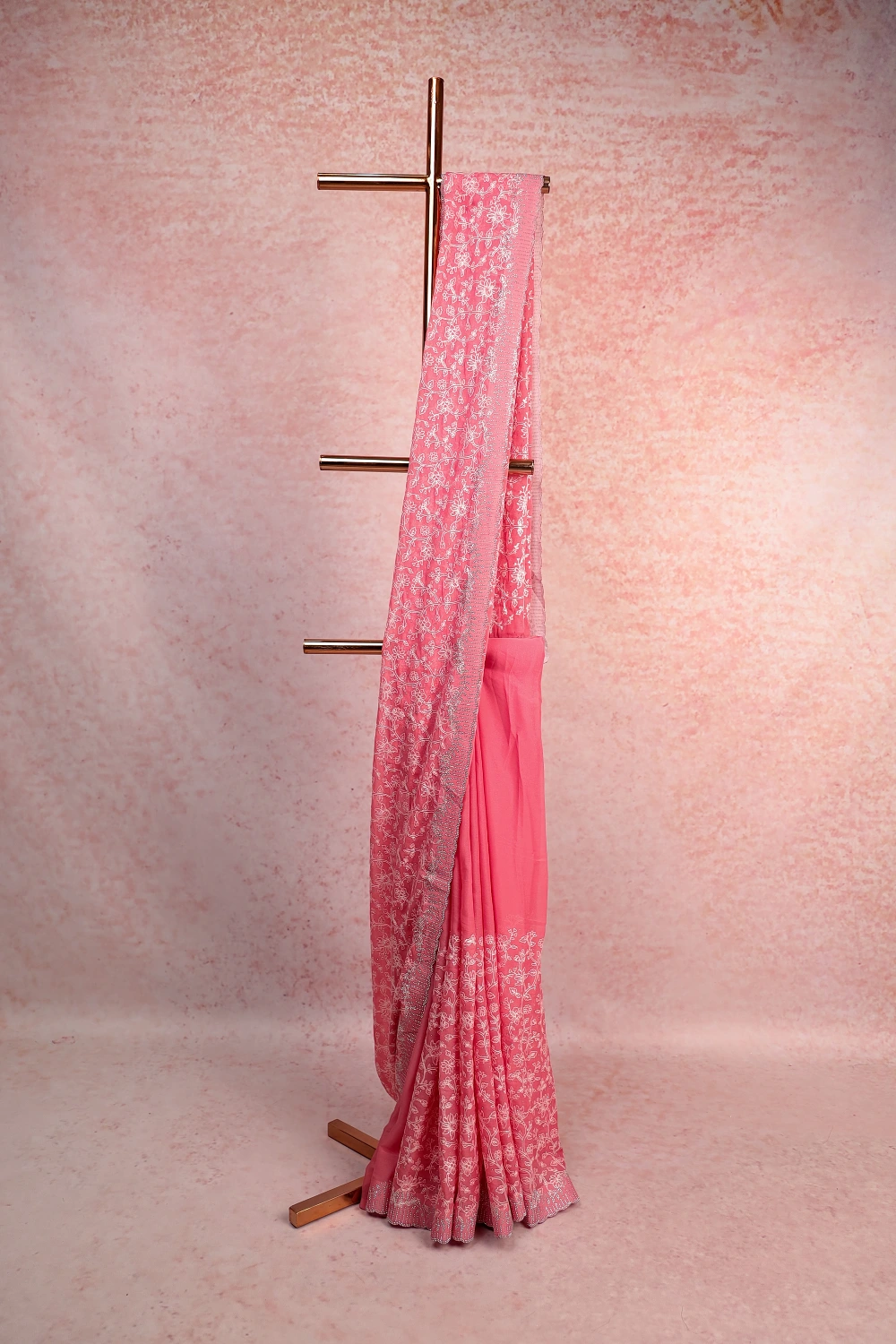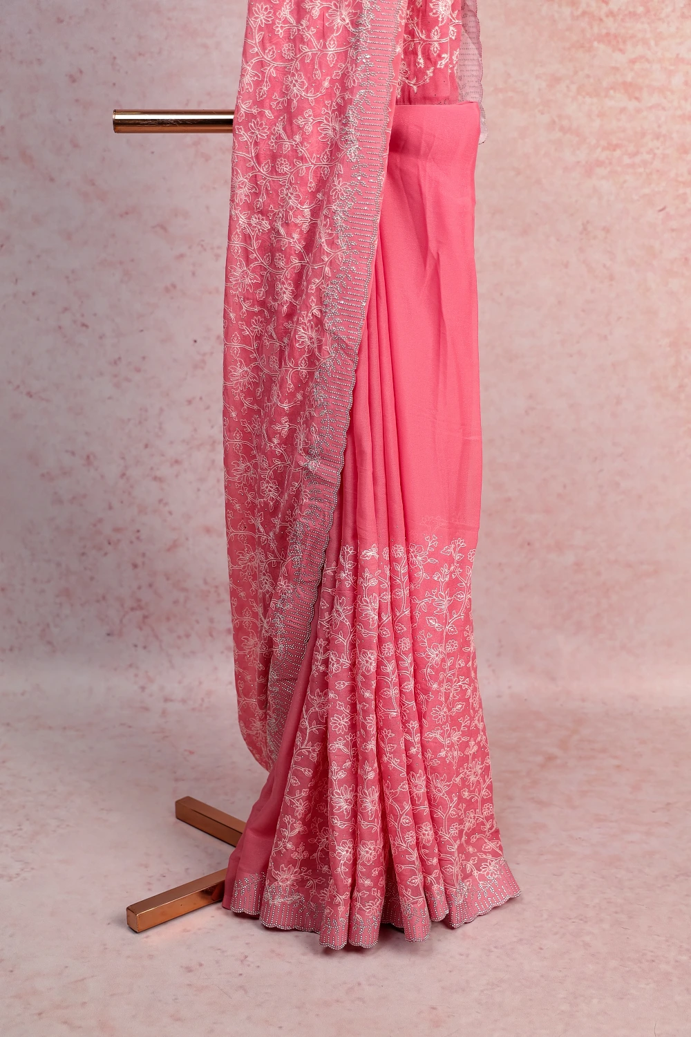 Pink Crush Embroidery Saree with Scalp Border. Includes Un stitched Blouse