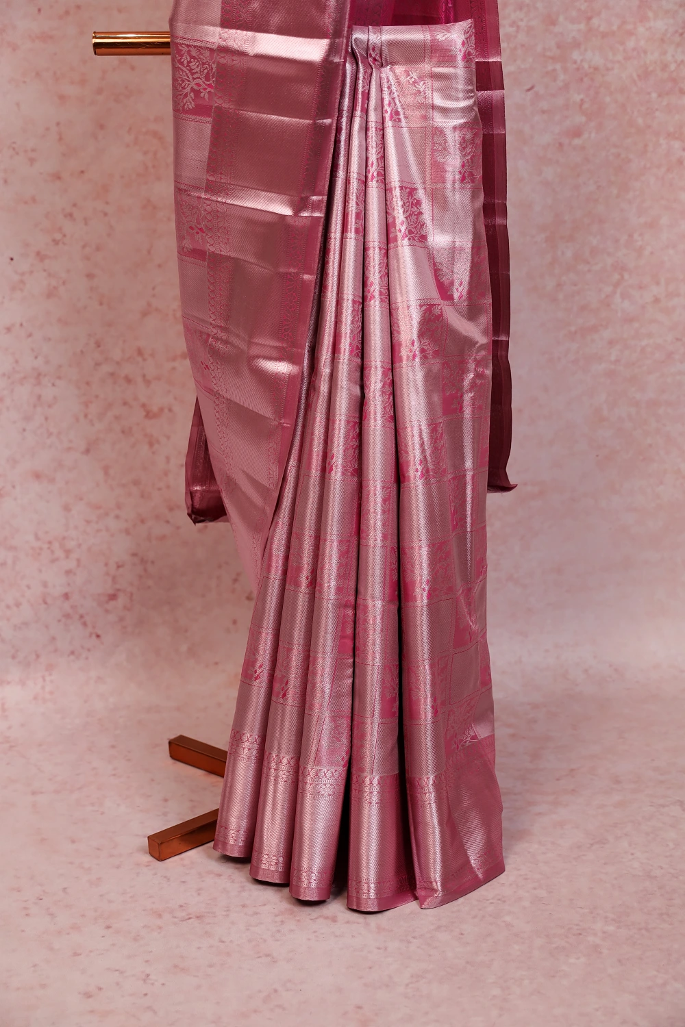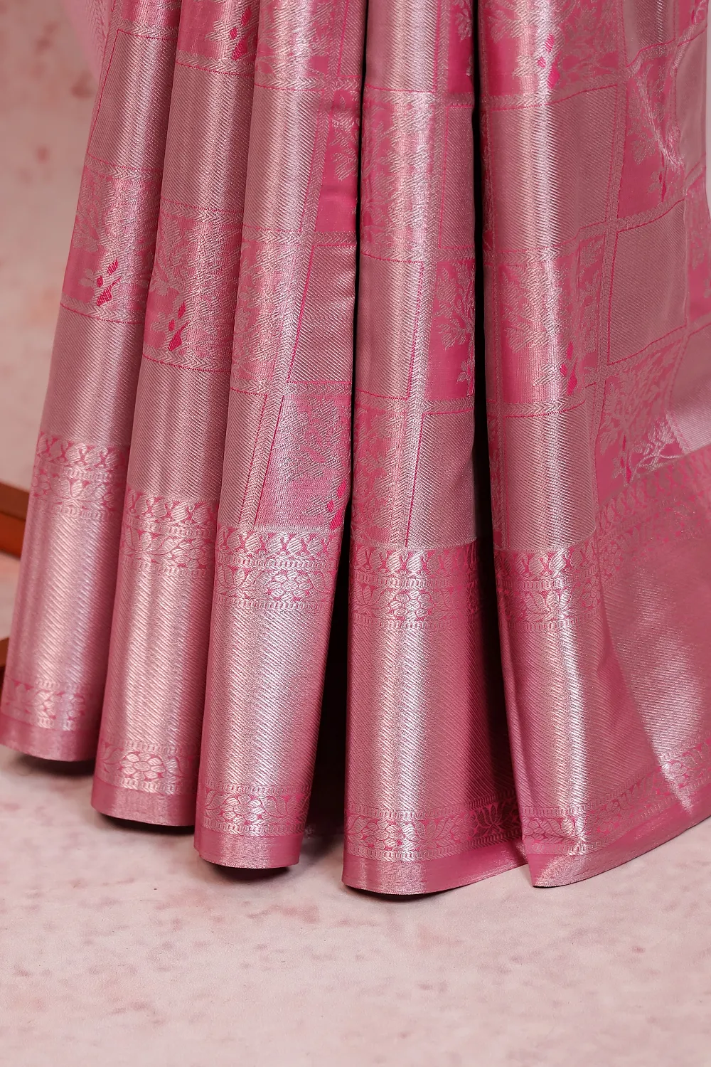 Pink Semi Kancheepuram Tissue Silk Box Design Saree with Designer Border. Includes Unstitched Blouse