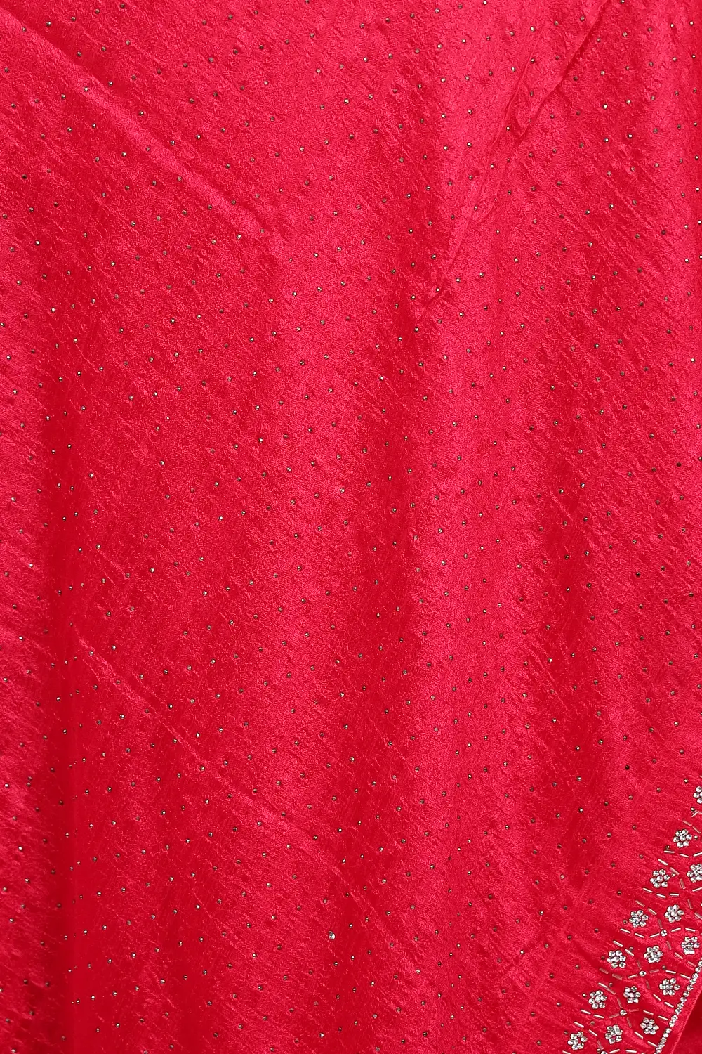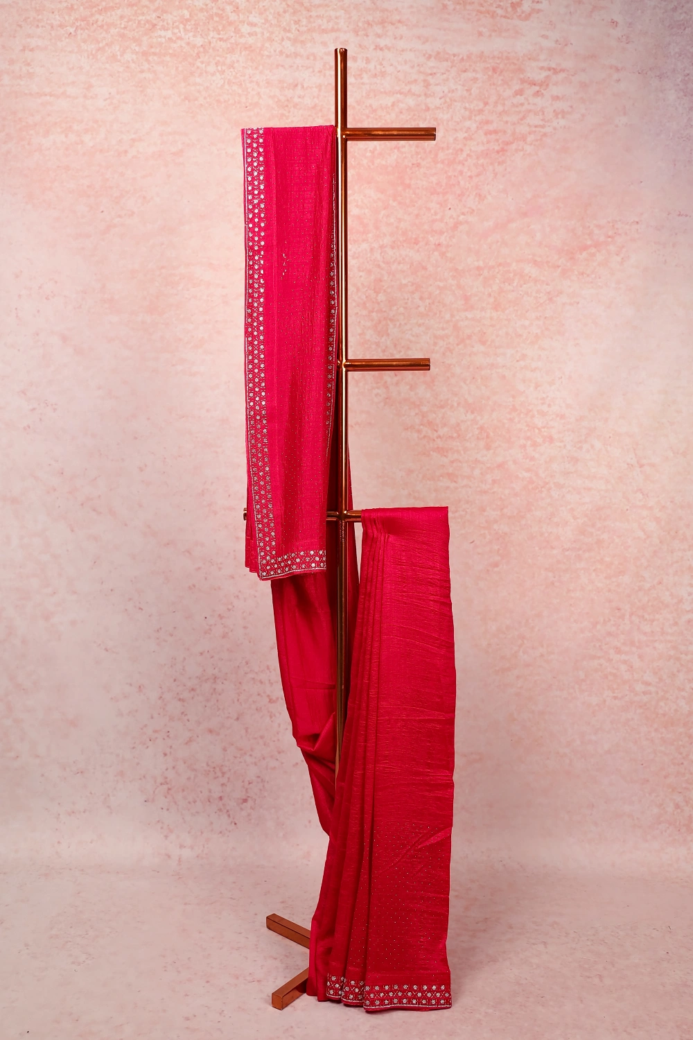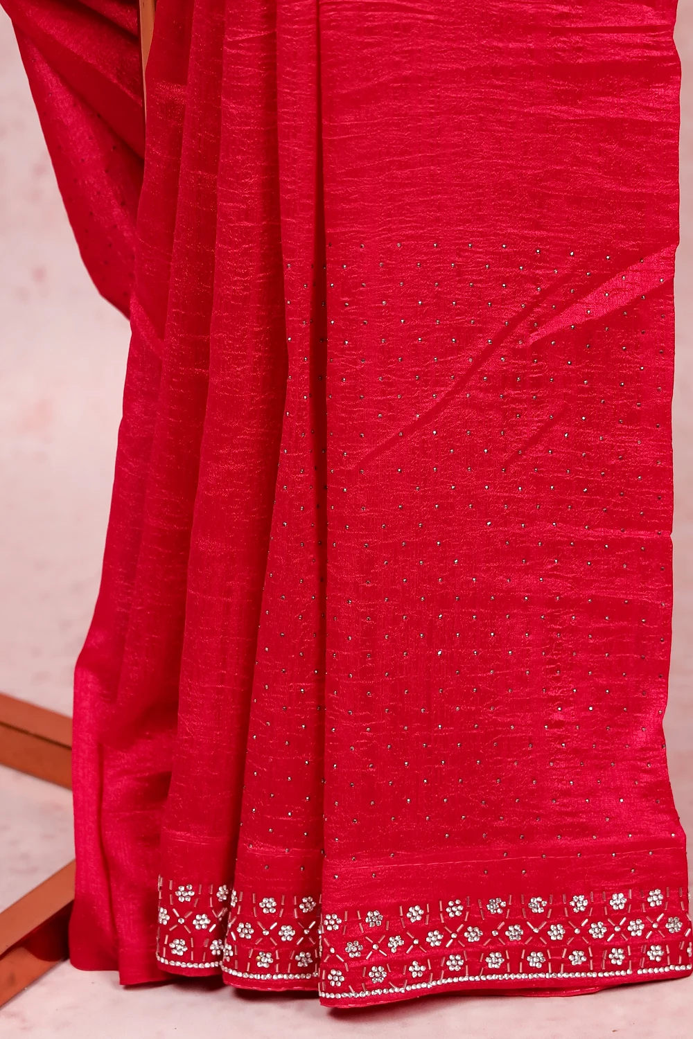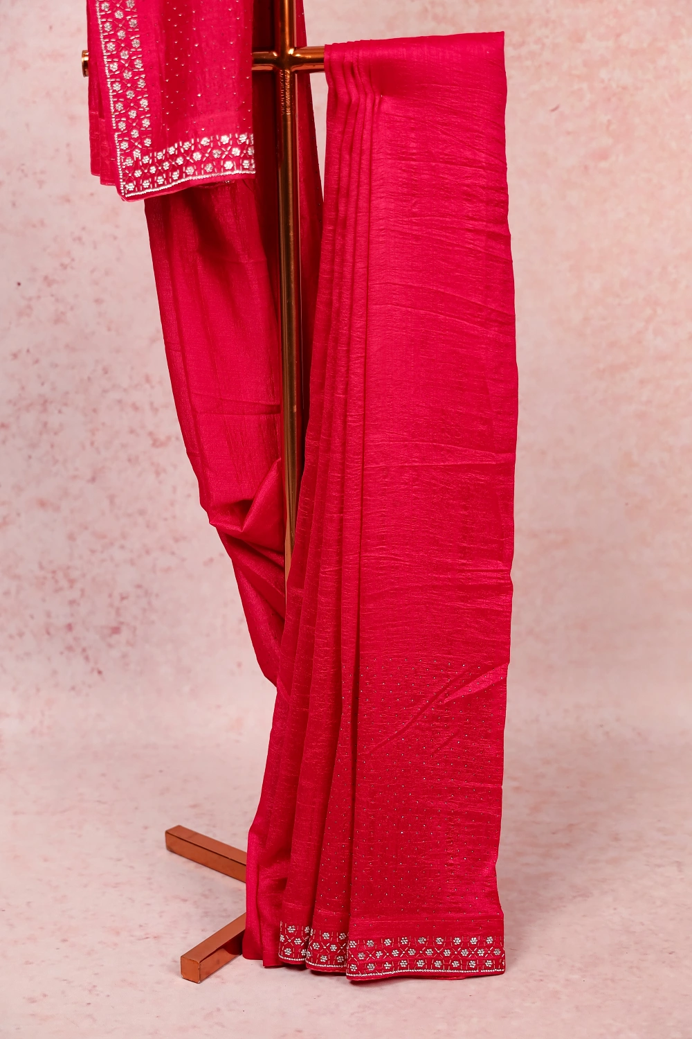 Pink Semi Linen Stone Work Saree with Stone Border. Includes Unstitched Blouse