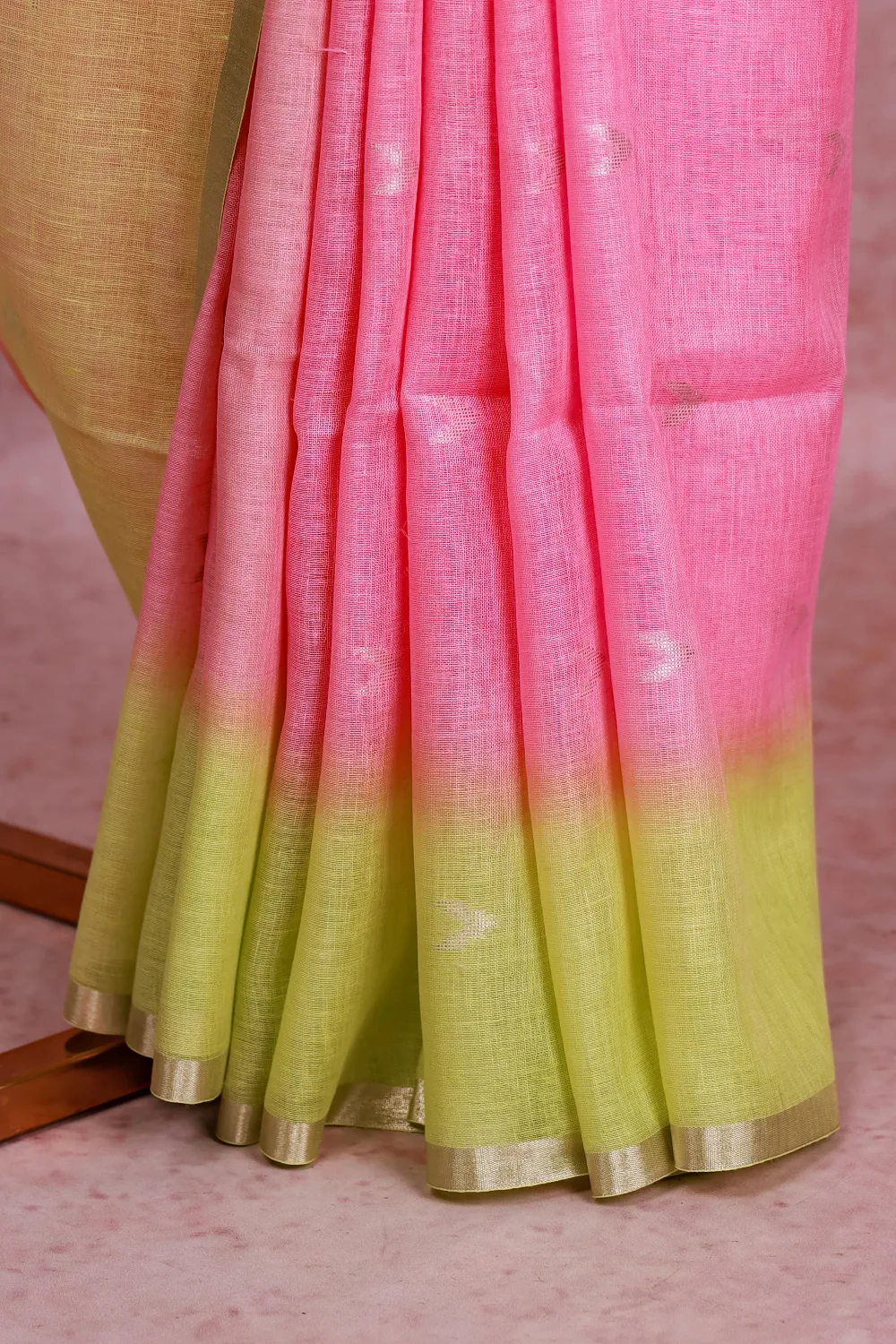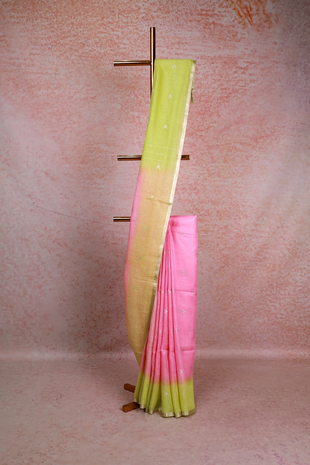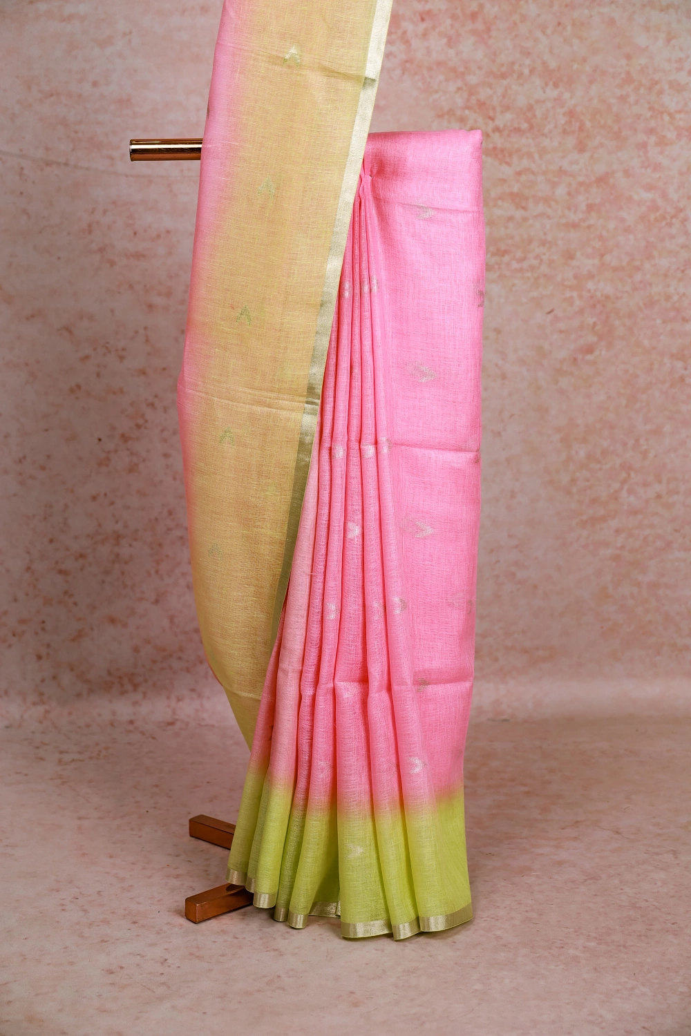 Pink Semi Linen Butta Saree with Butta Border. Includes Unstitched Blouse