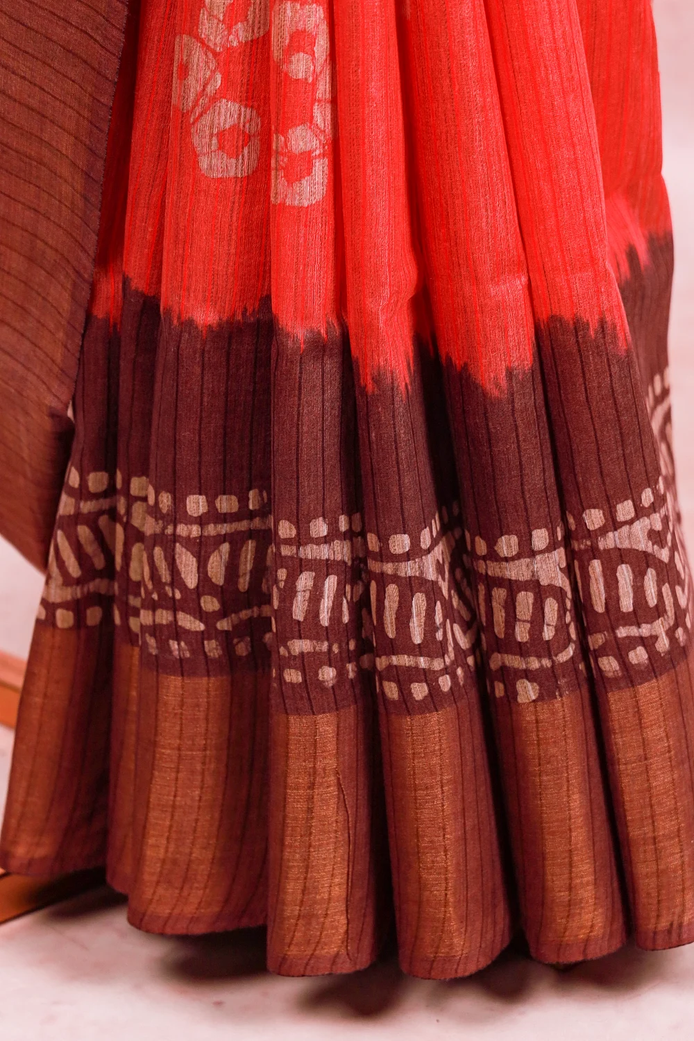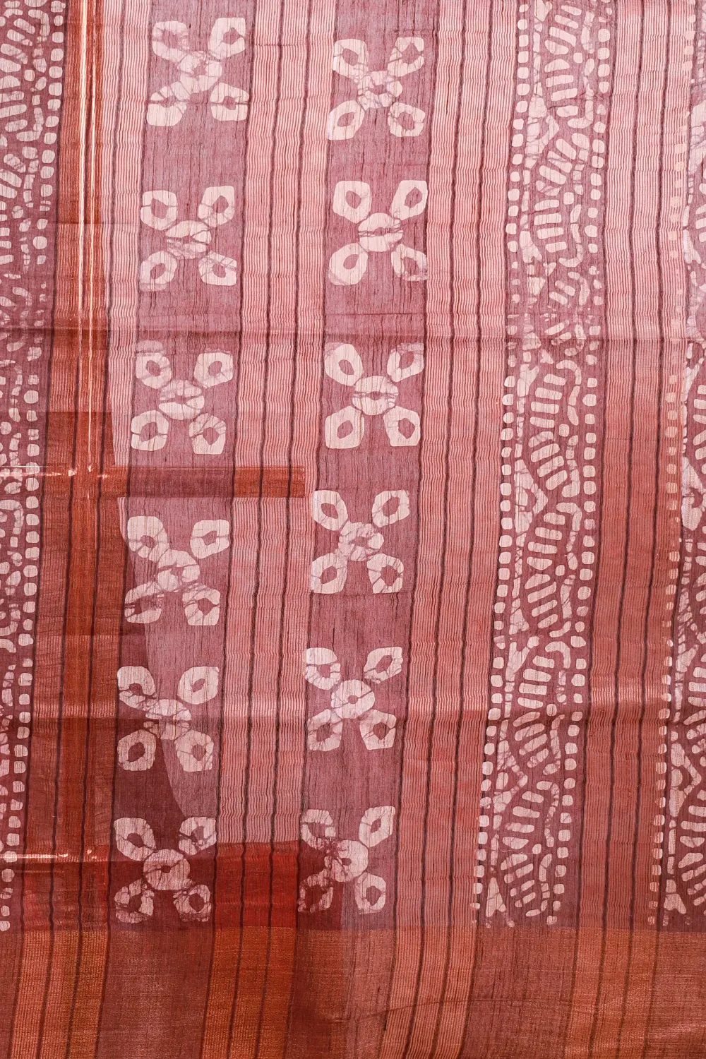 Pink Semi Tussar Bathik Printed Saree With Tissue Border. Includes Unstitched Blouse