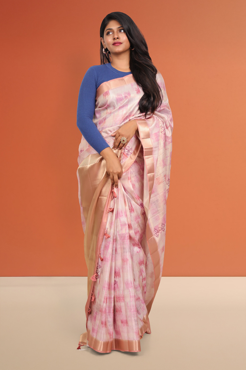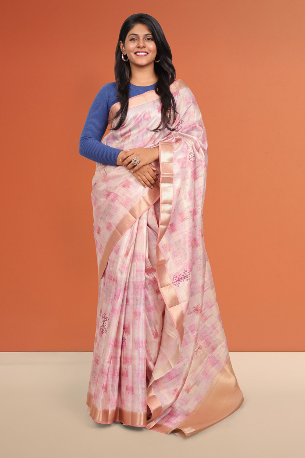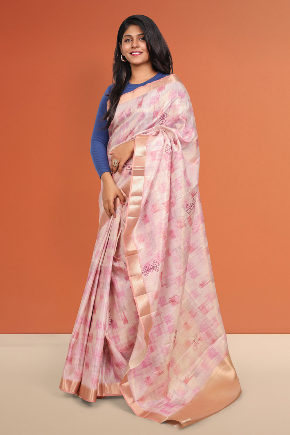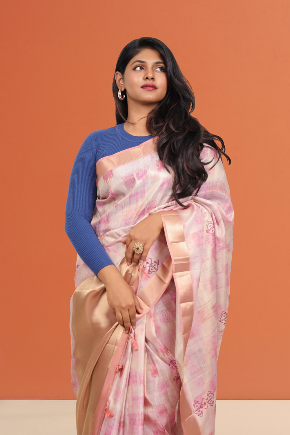 Pink Semi Tussar Printed Saree with Copper border. Includes Unstitched Blouse