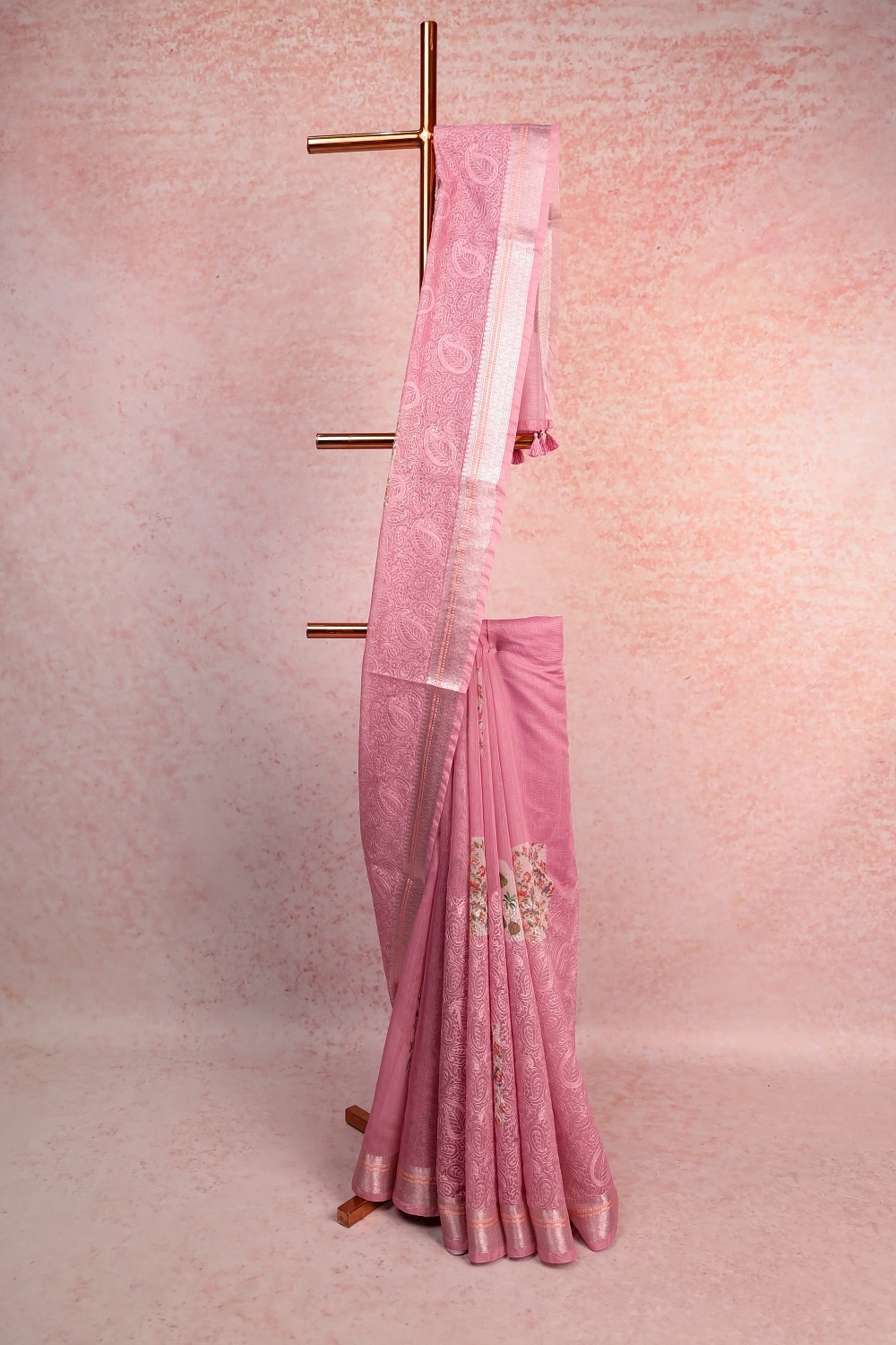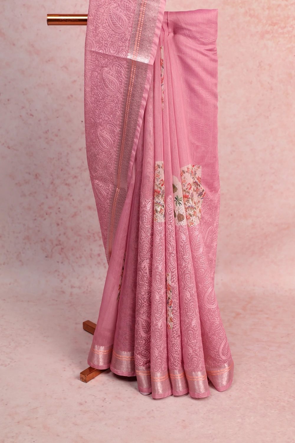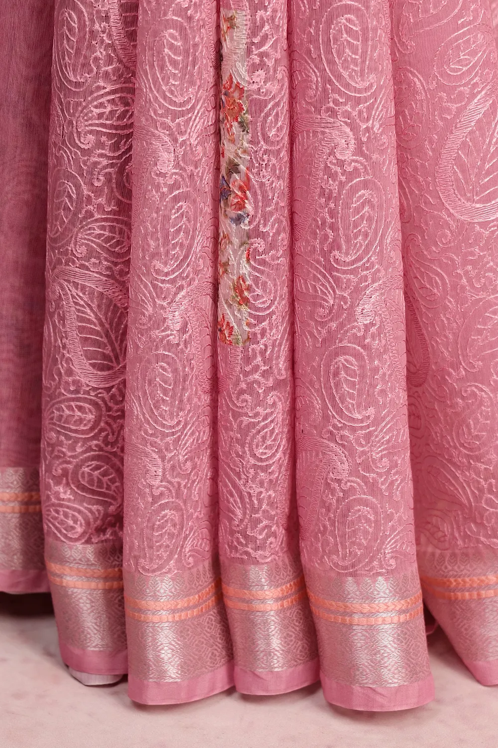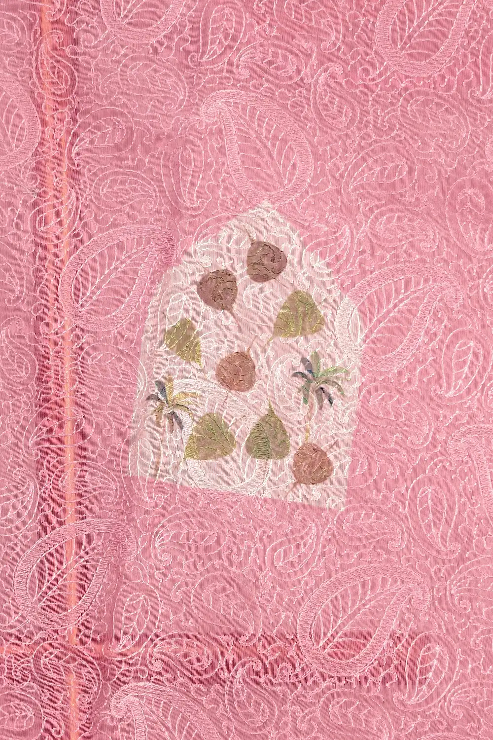 Pink Semi Tussar Embroidary with Self Border. Includes Un stitched Blouse