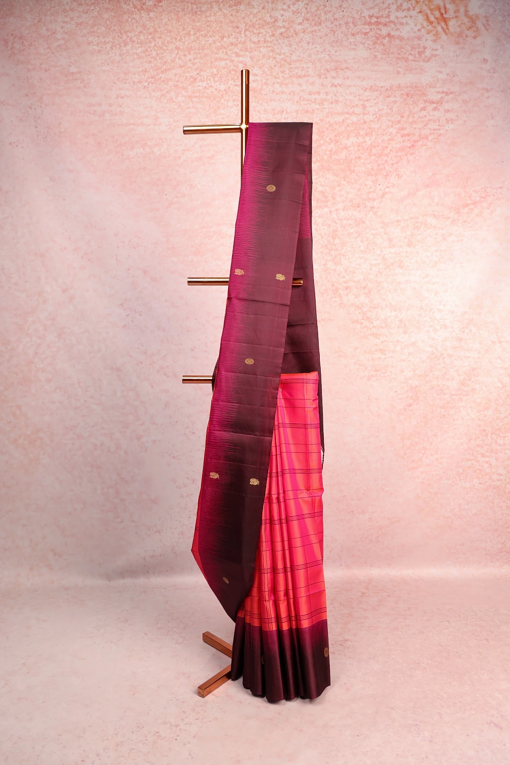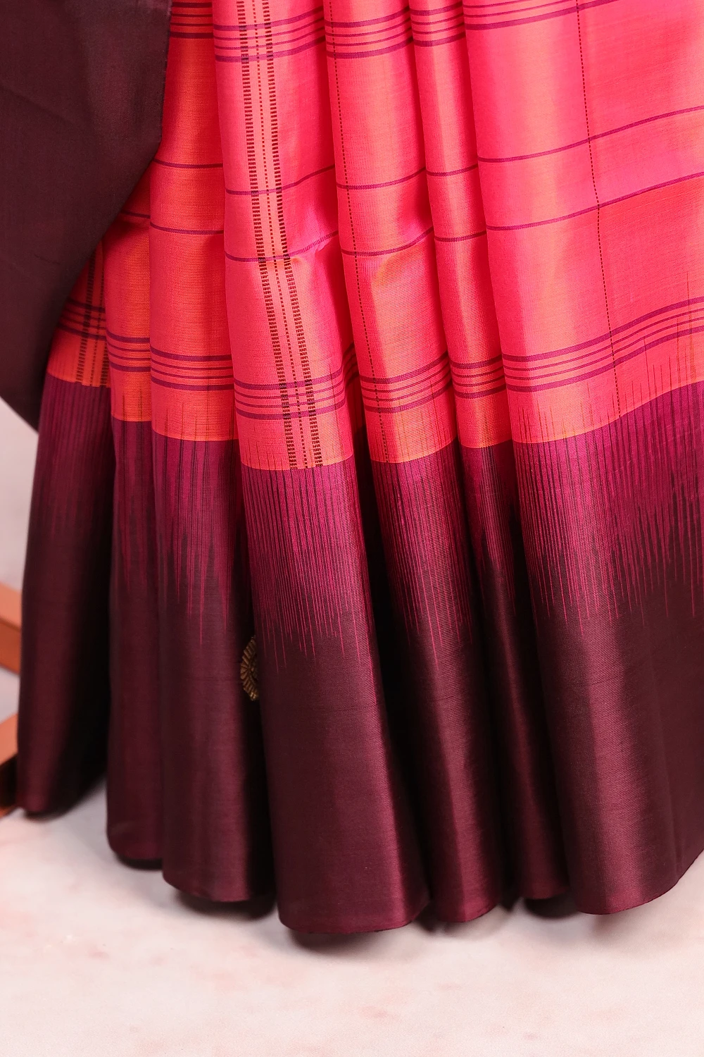 Pinkish Orange Kancheepuram Soft Silk Checks Saree with Plain Border. Includes Un stitched Blouse