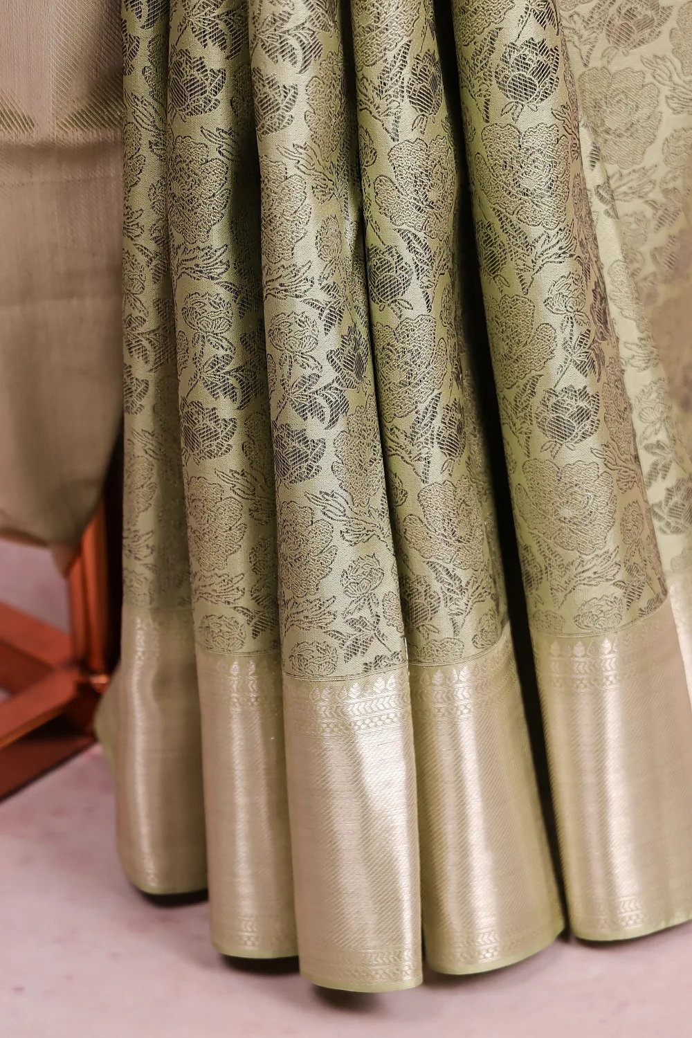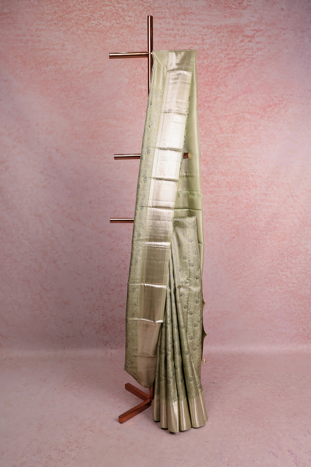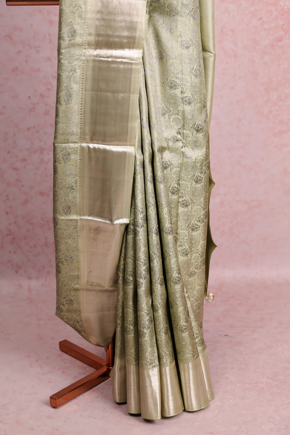 Pista Green Kancheepuram Silk Brocade Saree With Designer Border. Includes Un Stitched Blouse