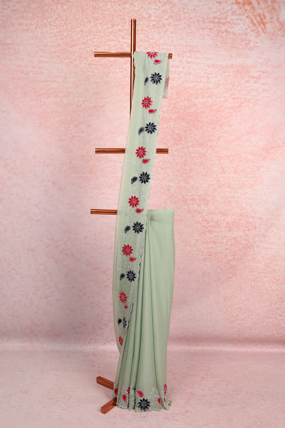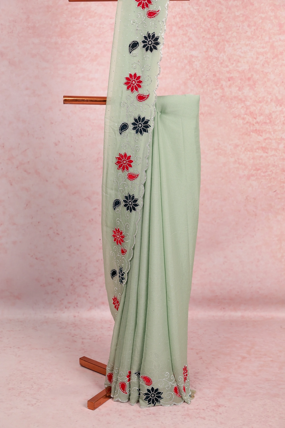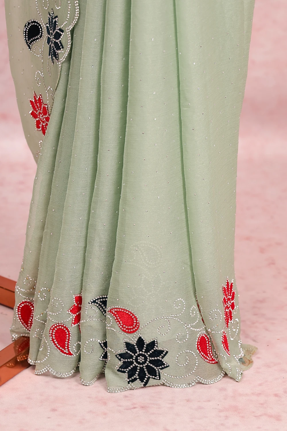 Pista Green Organza Plain Saree With Scallop Border. Includes Un Stitched Blouse