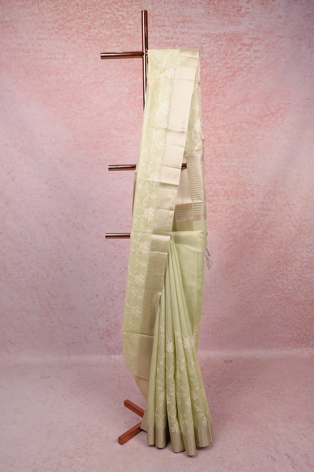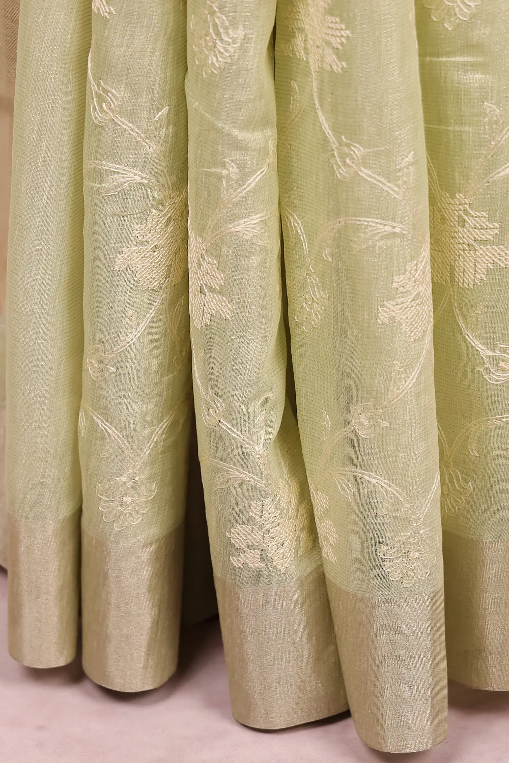 Pista Green Semi Tissue Embroidery Saree with Plain Border. Includes Unstitched Blouse