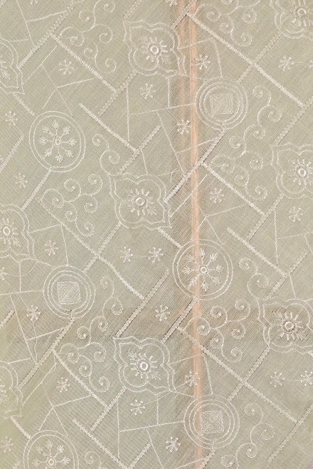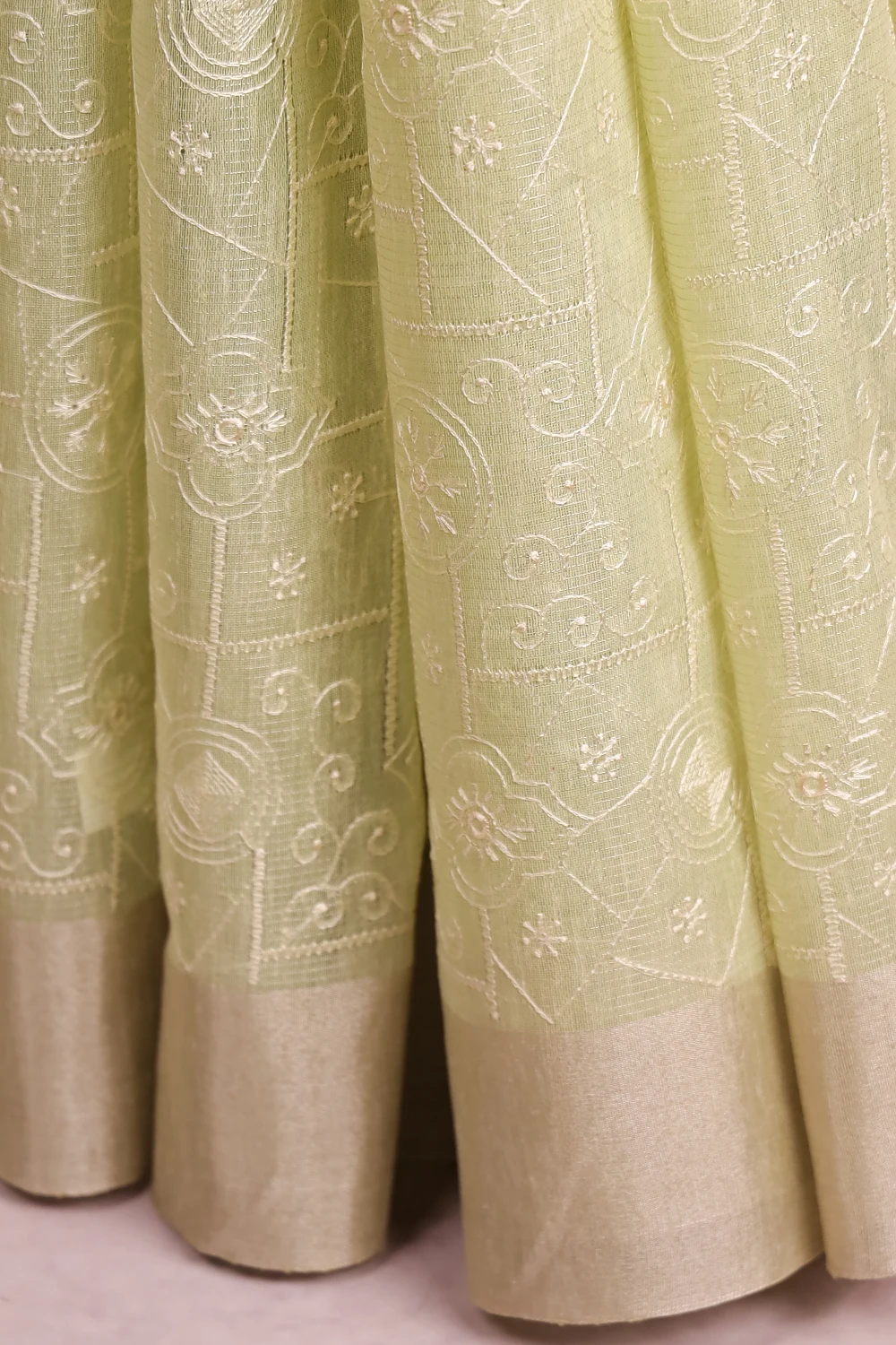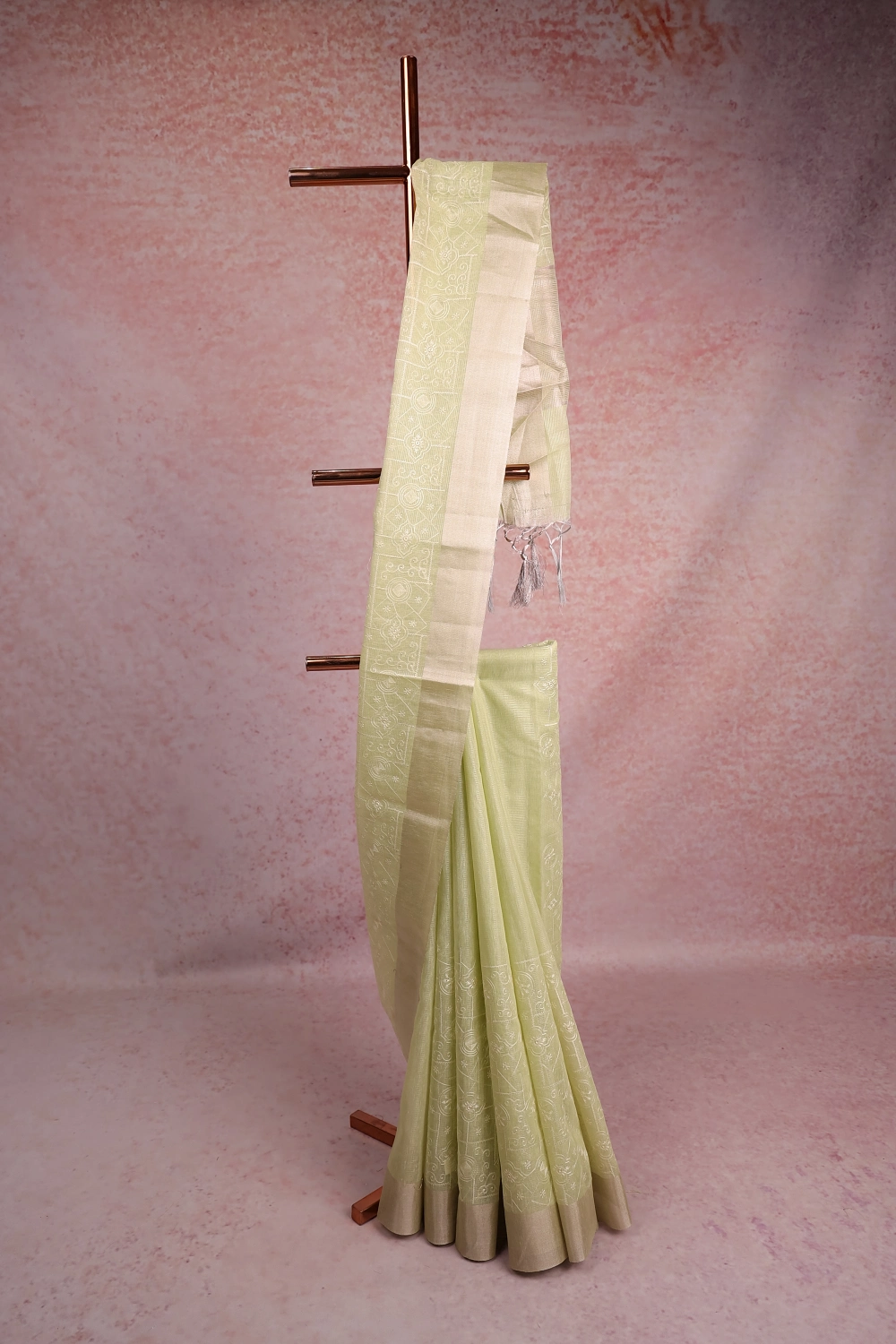 Pista Green Semi Tissue Embroidery Saree with Silver Border. Includes Unstitched Blouse