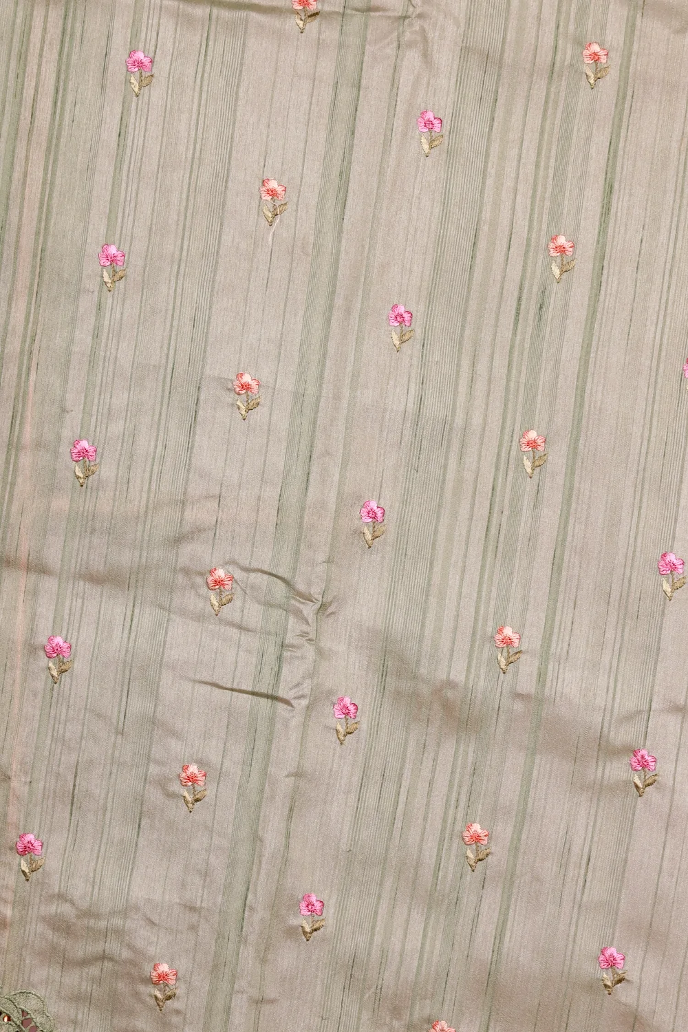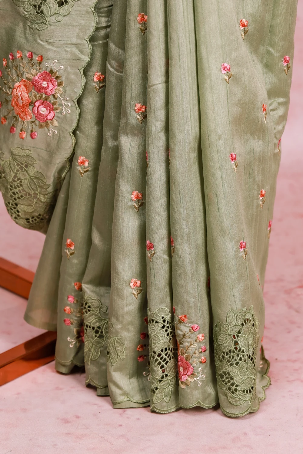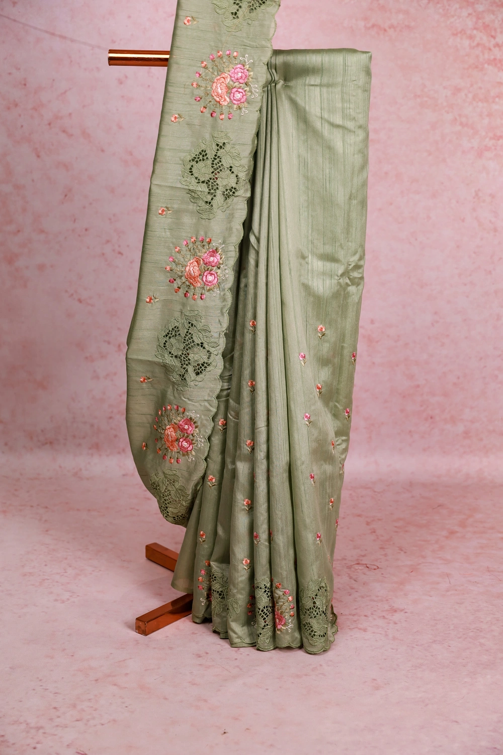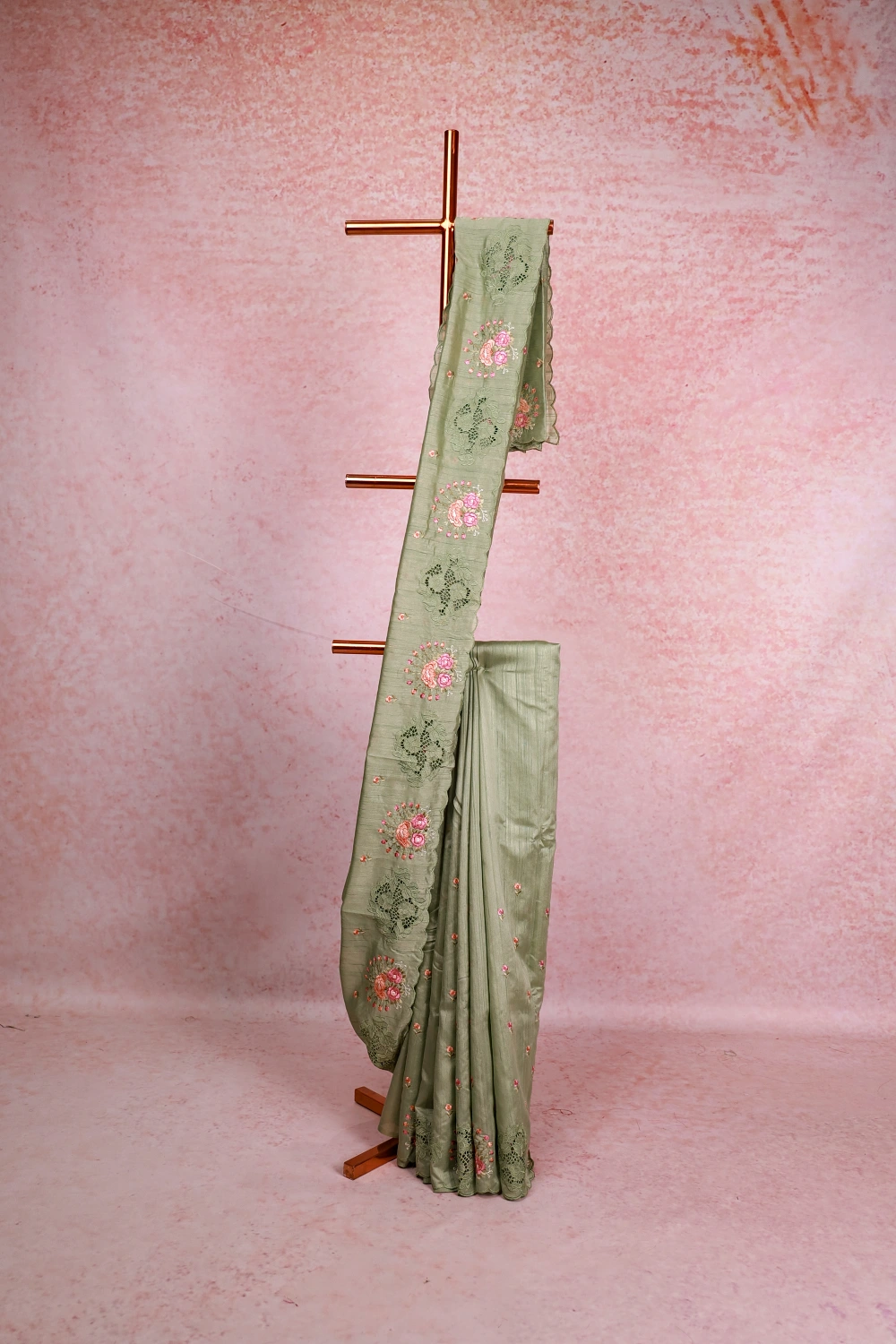 Pista Green Semi Tussar Embroidery With Self Design Saree With Cutt Work Border. Includes Un Stitched Blouse
