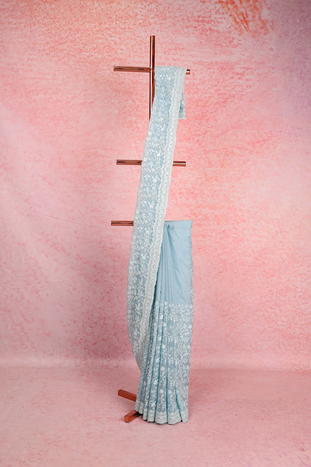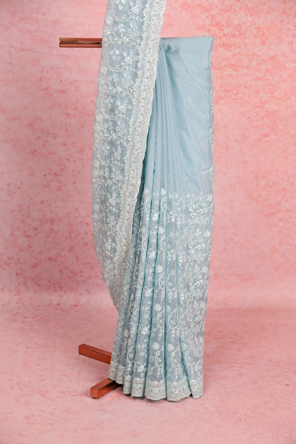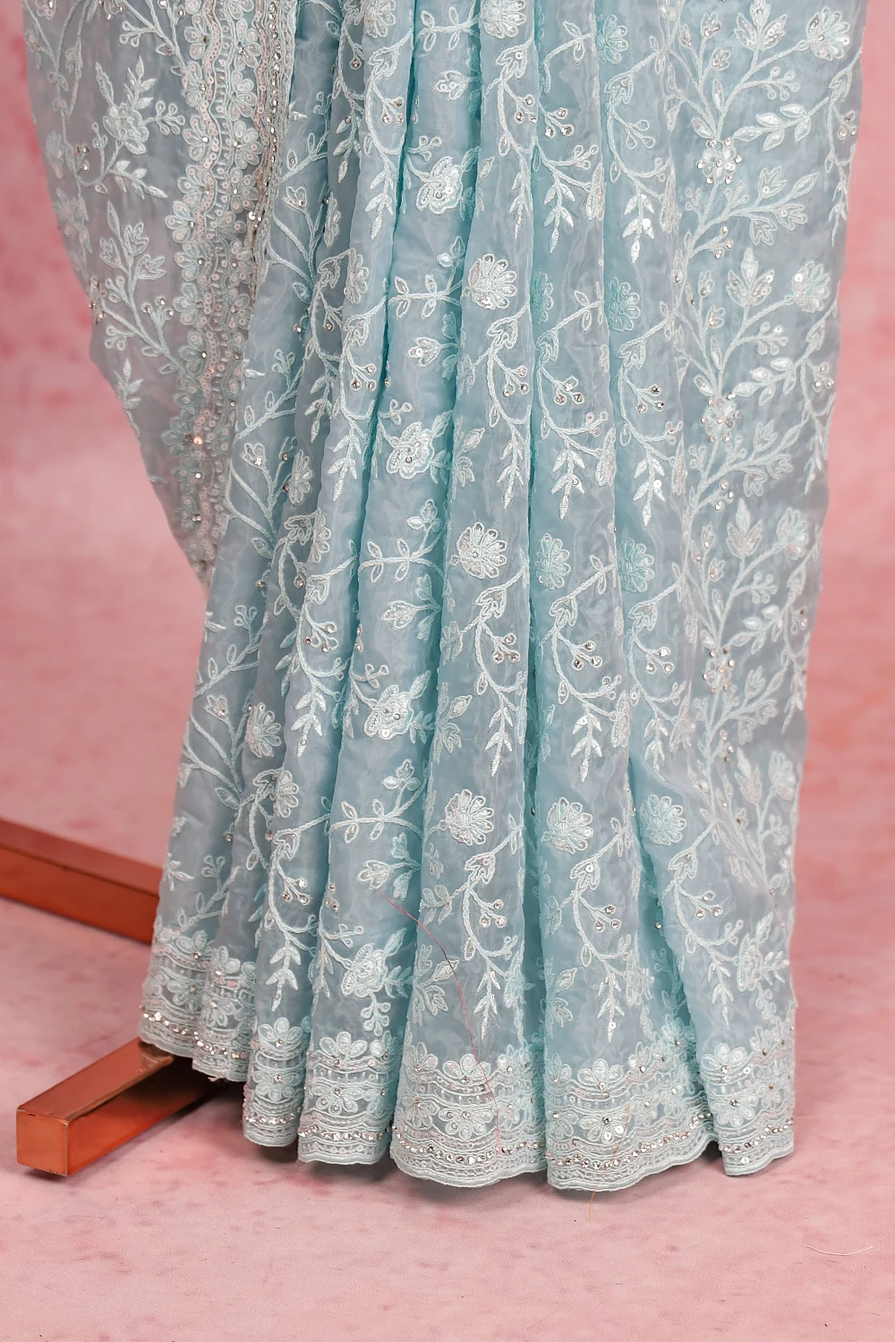 Powder Blue Organza Thread Work Saree with Scallop Border. Includes Unstitched Blouse