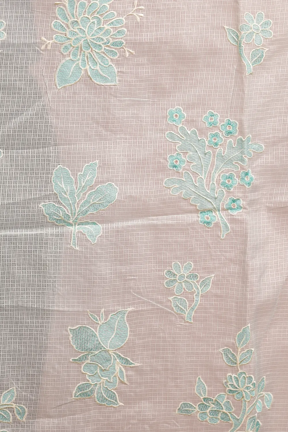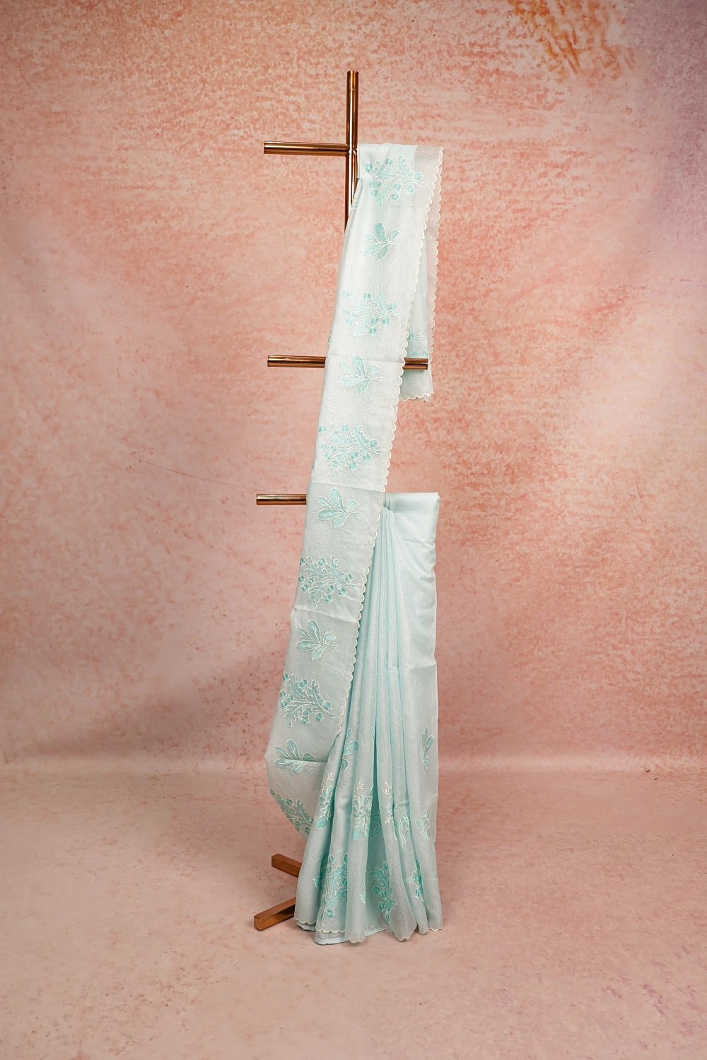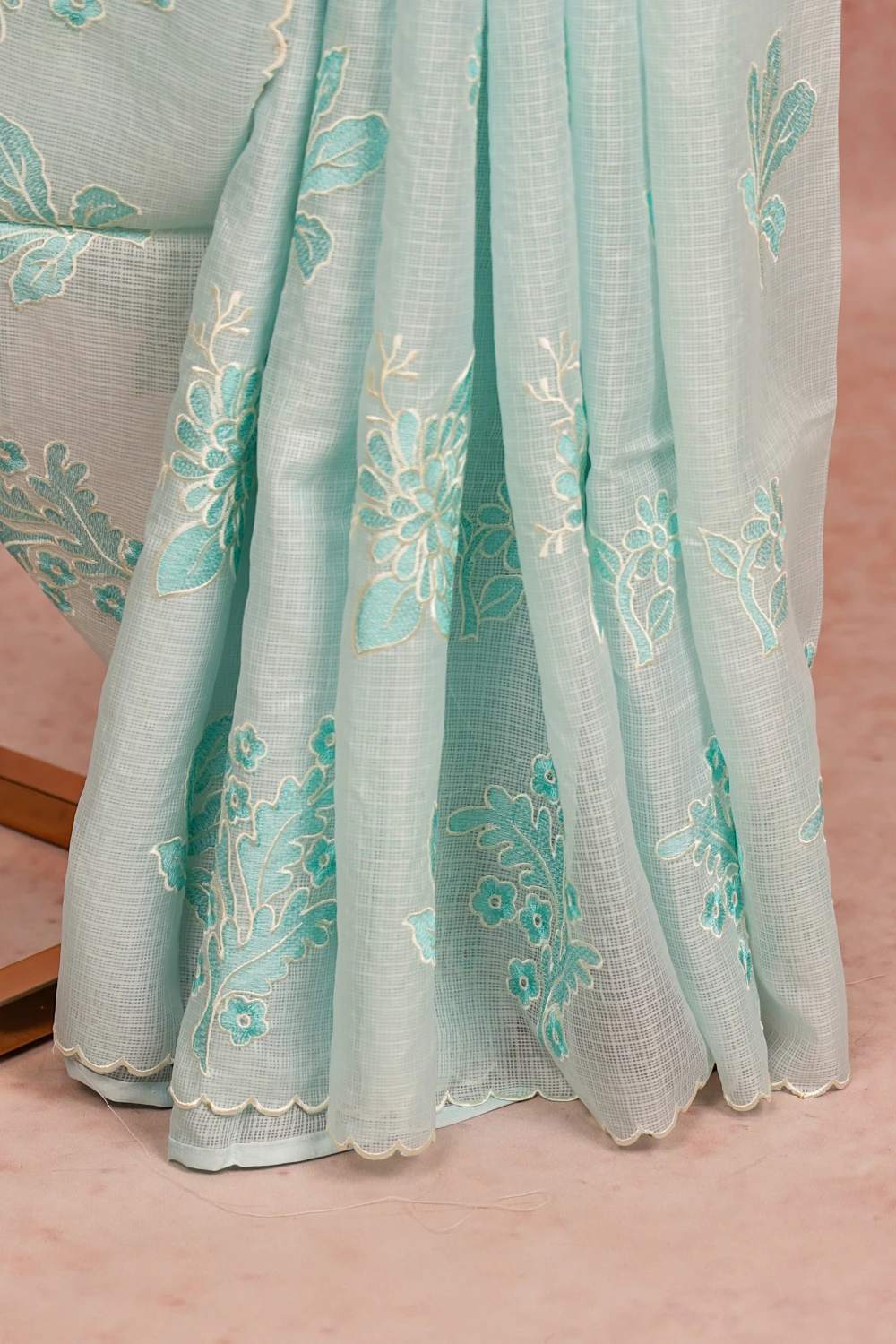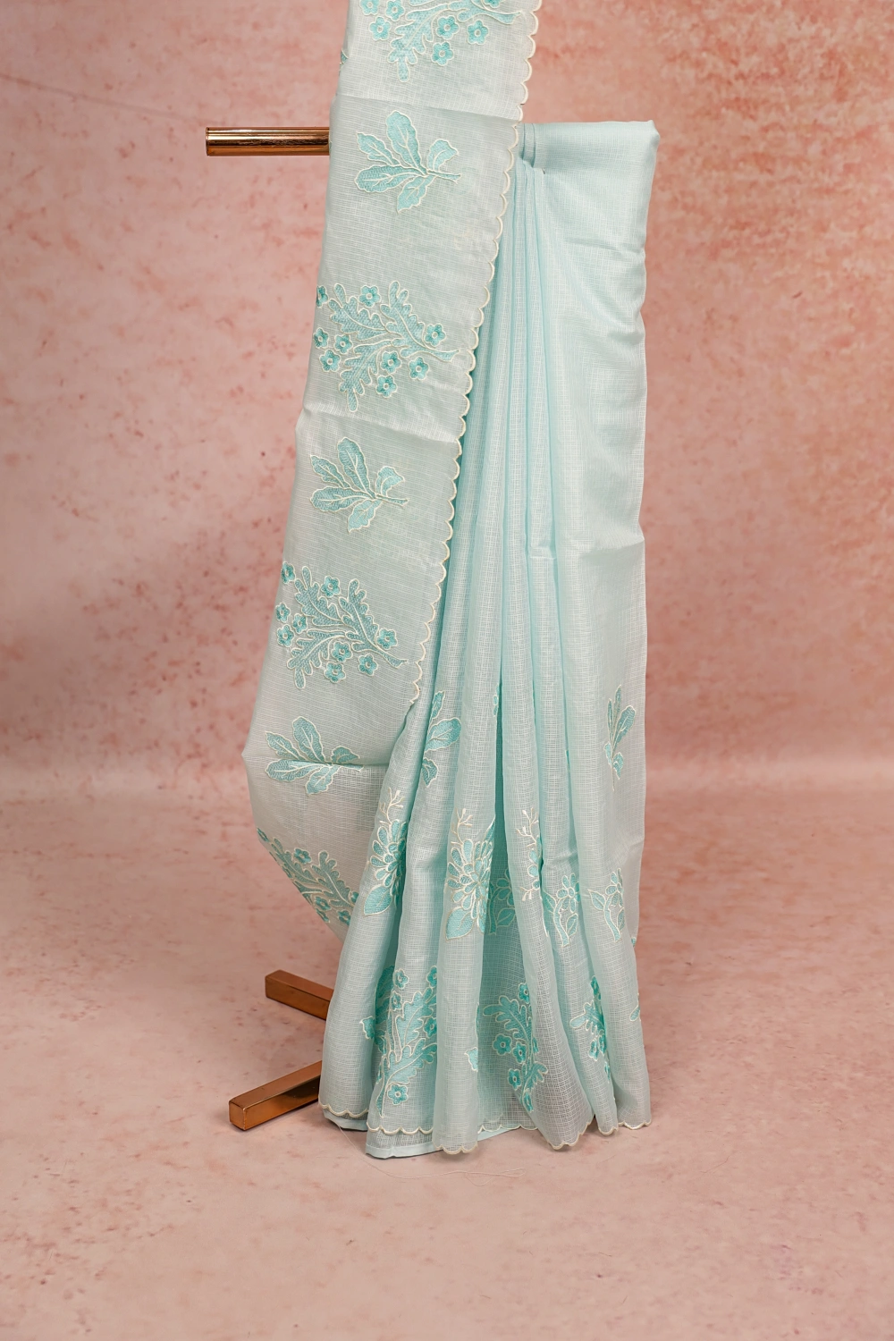Powder Blue Silky Kota Thread Work Saree With Scallop Border. Includes Unstitched Blouse
