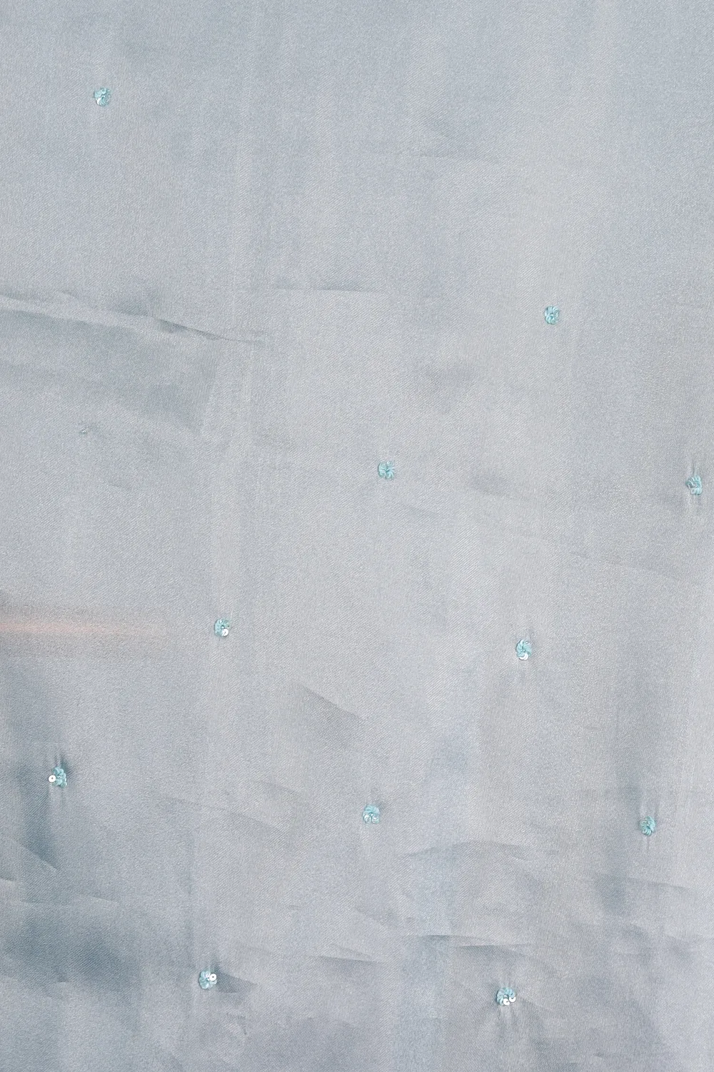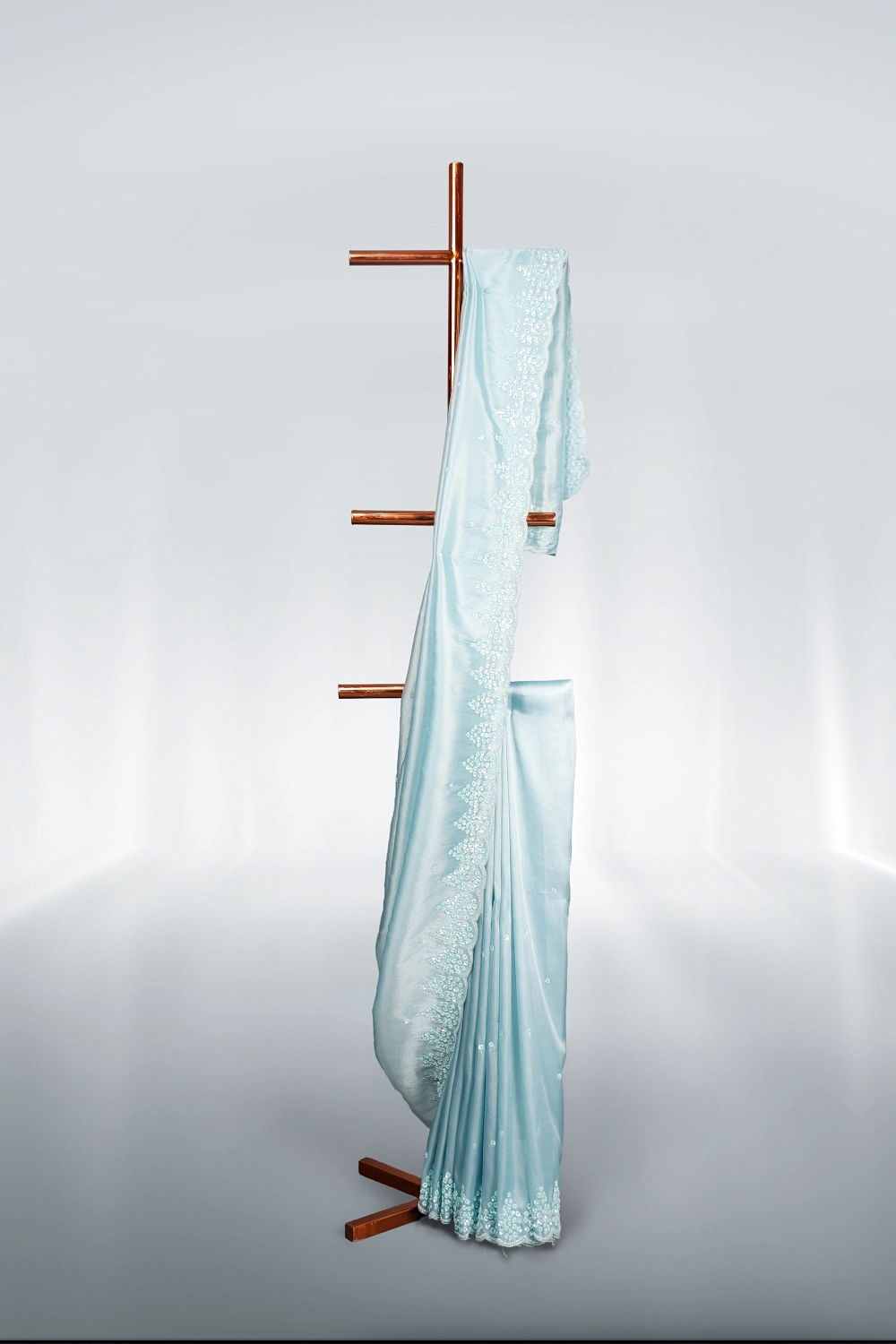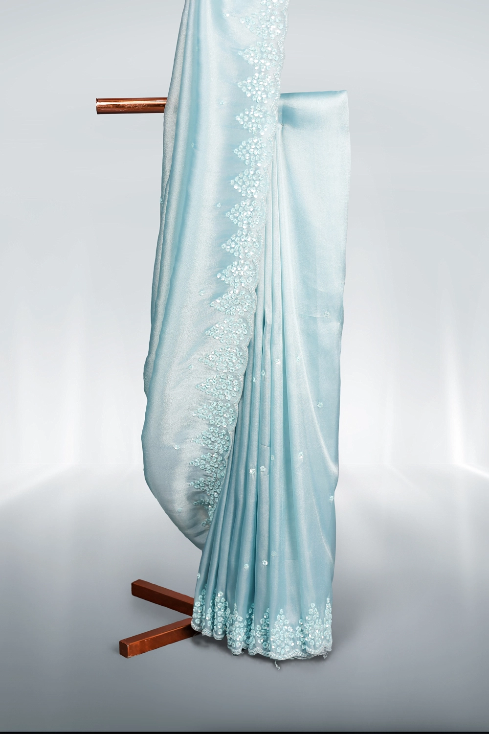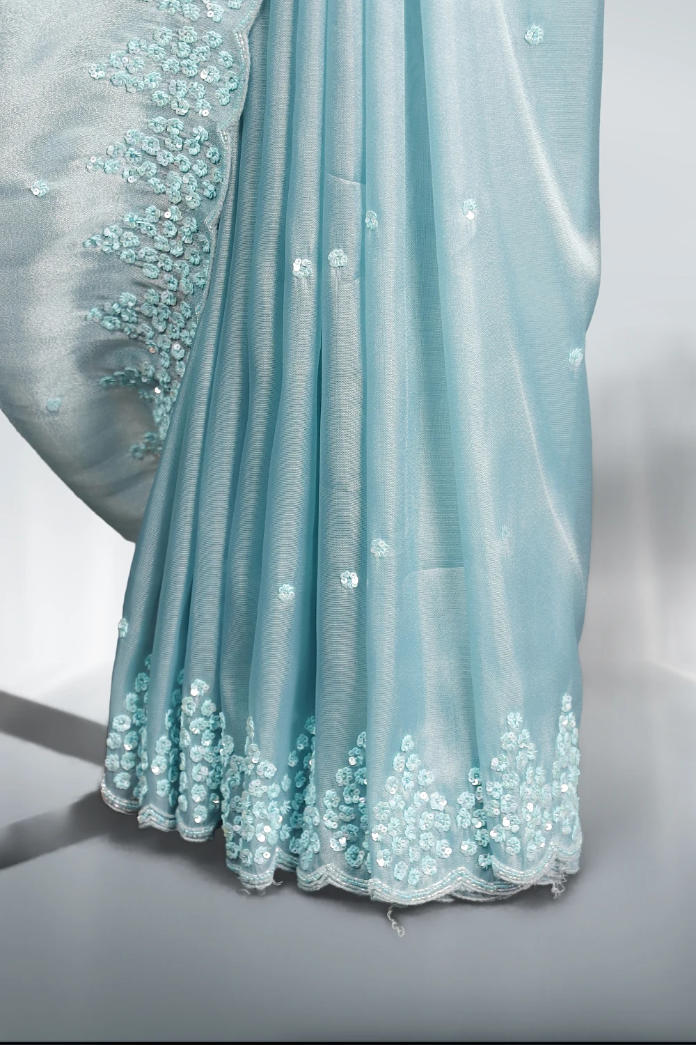 Powder Blue Tissue Organza Sequines Saree With Scallop Border. Includes Un Stitched Blouse