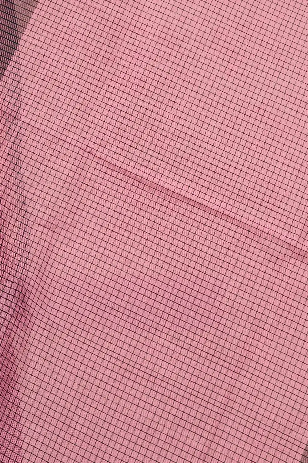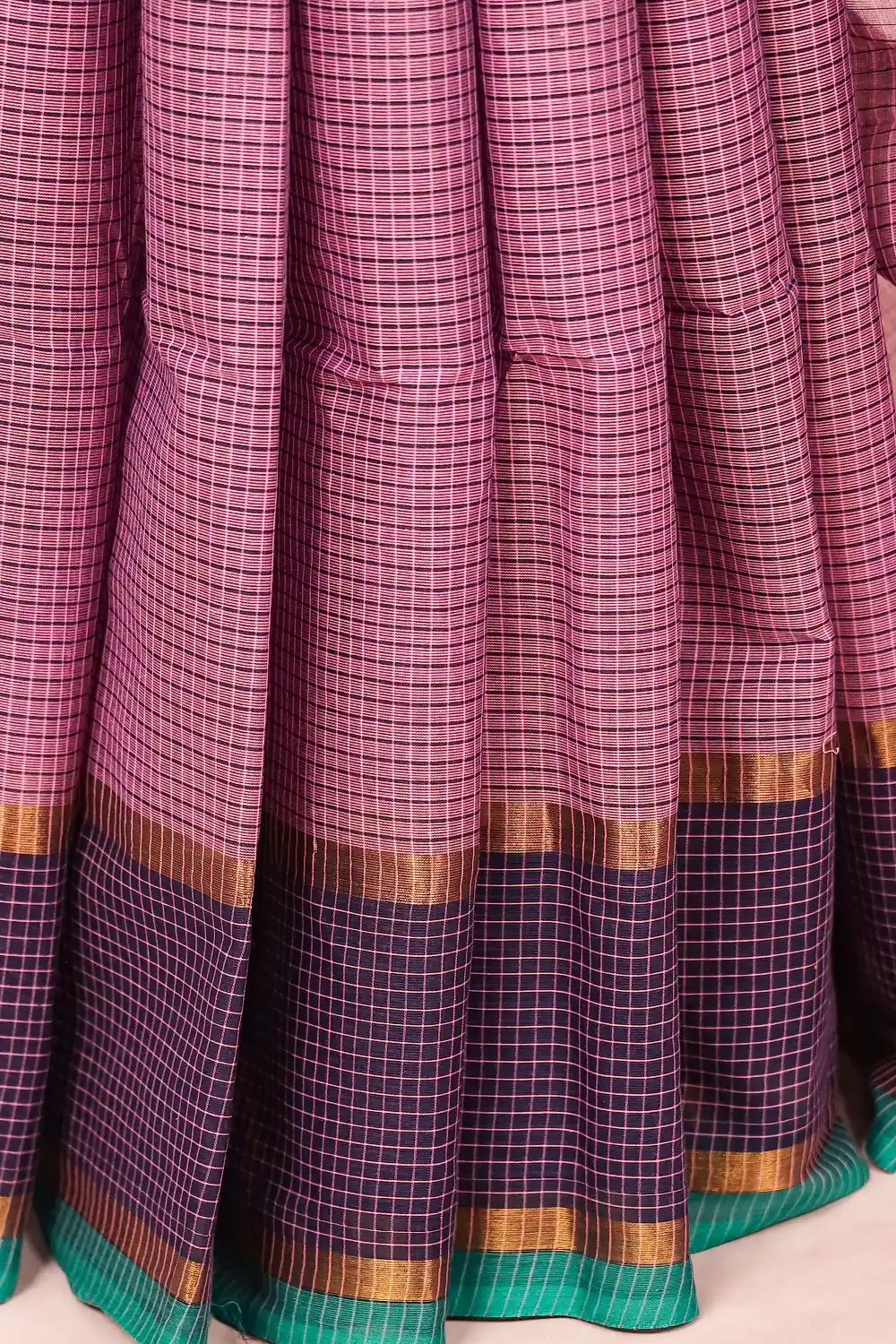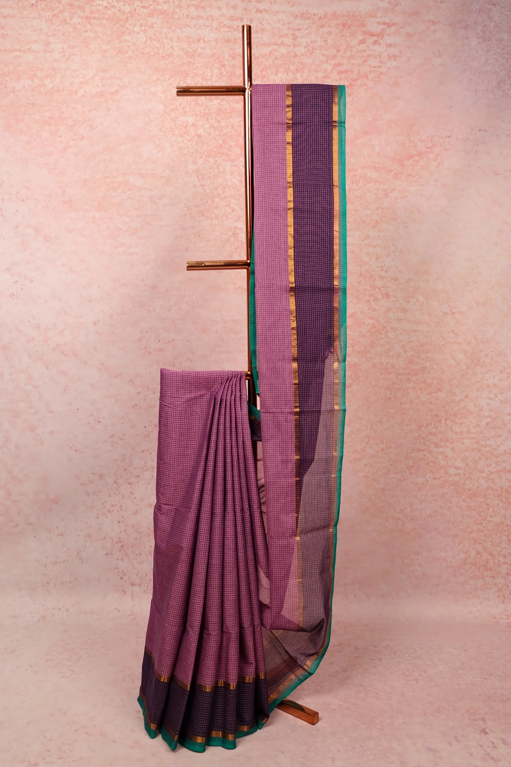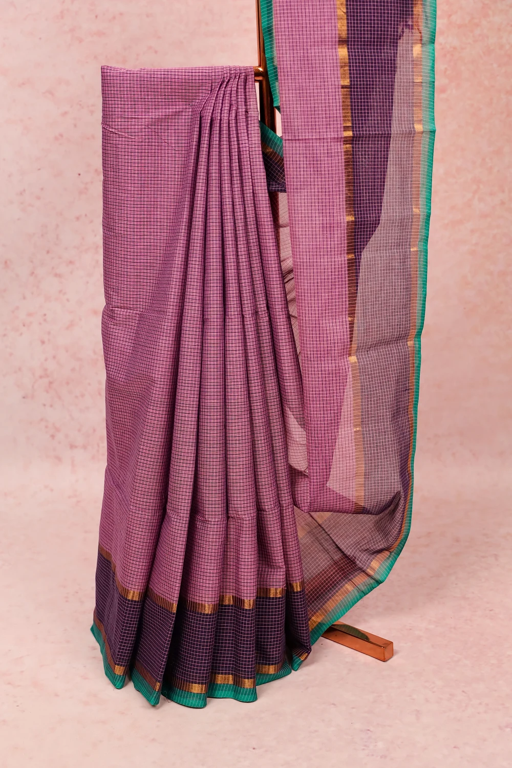 Purple Cotton Check Saree with Check Border. Includes Unstitched Blouse.
