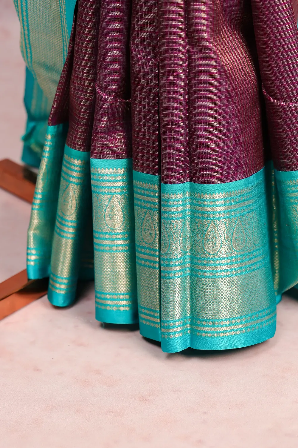 Purple Kancheepuram Silk Checks Saree with Designer Border. Includes Unstitched Blouse
