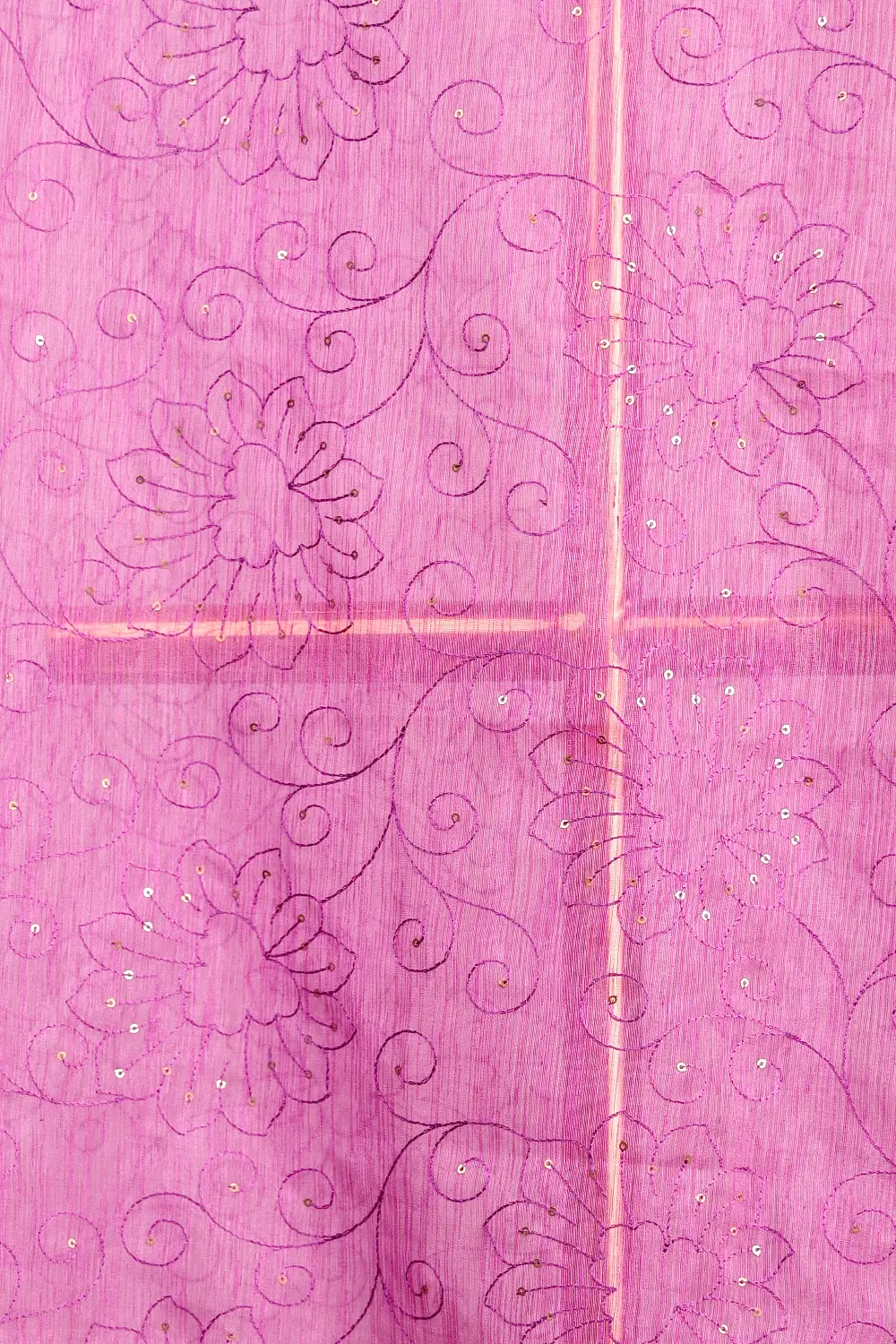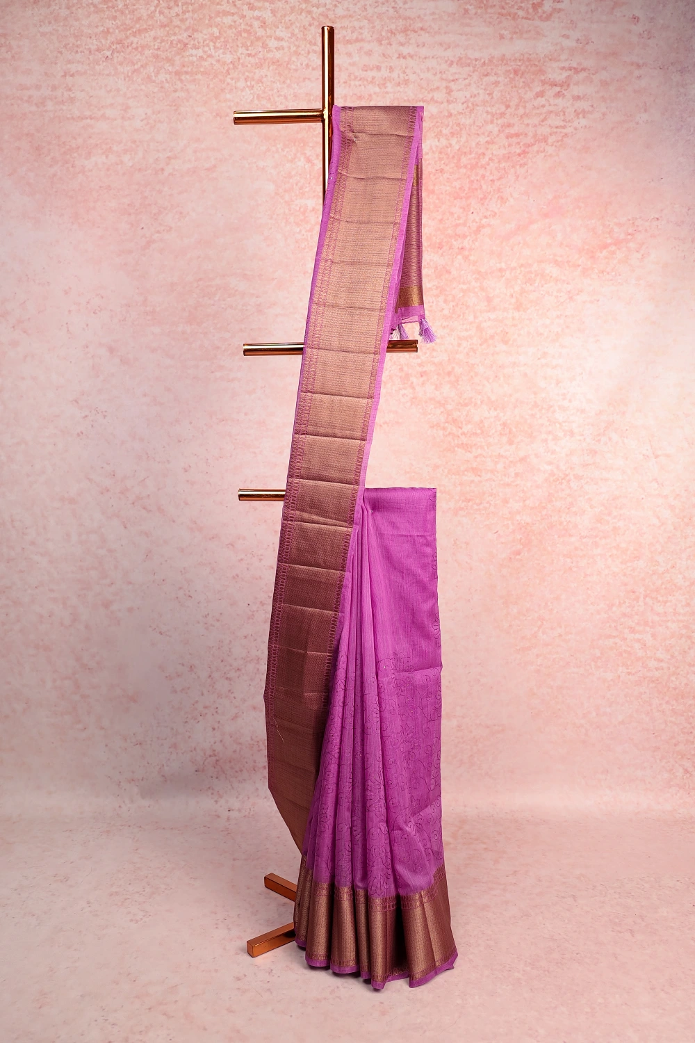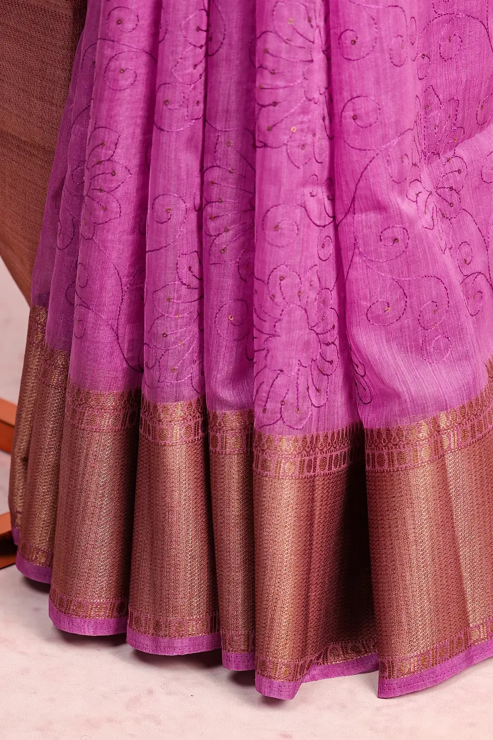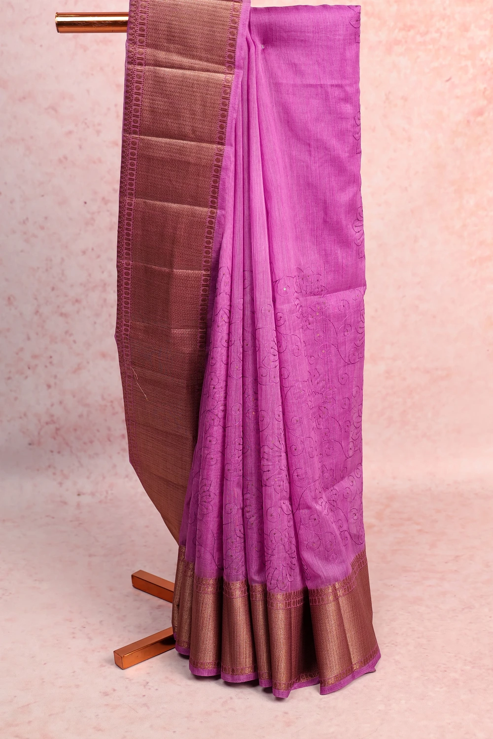 Purple Semi Jute Embroidery Saree with Golden Border. Includes Un stitched Blouse
