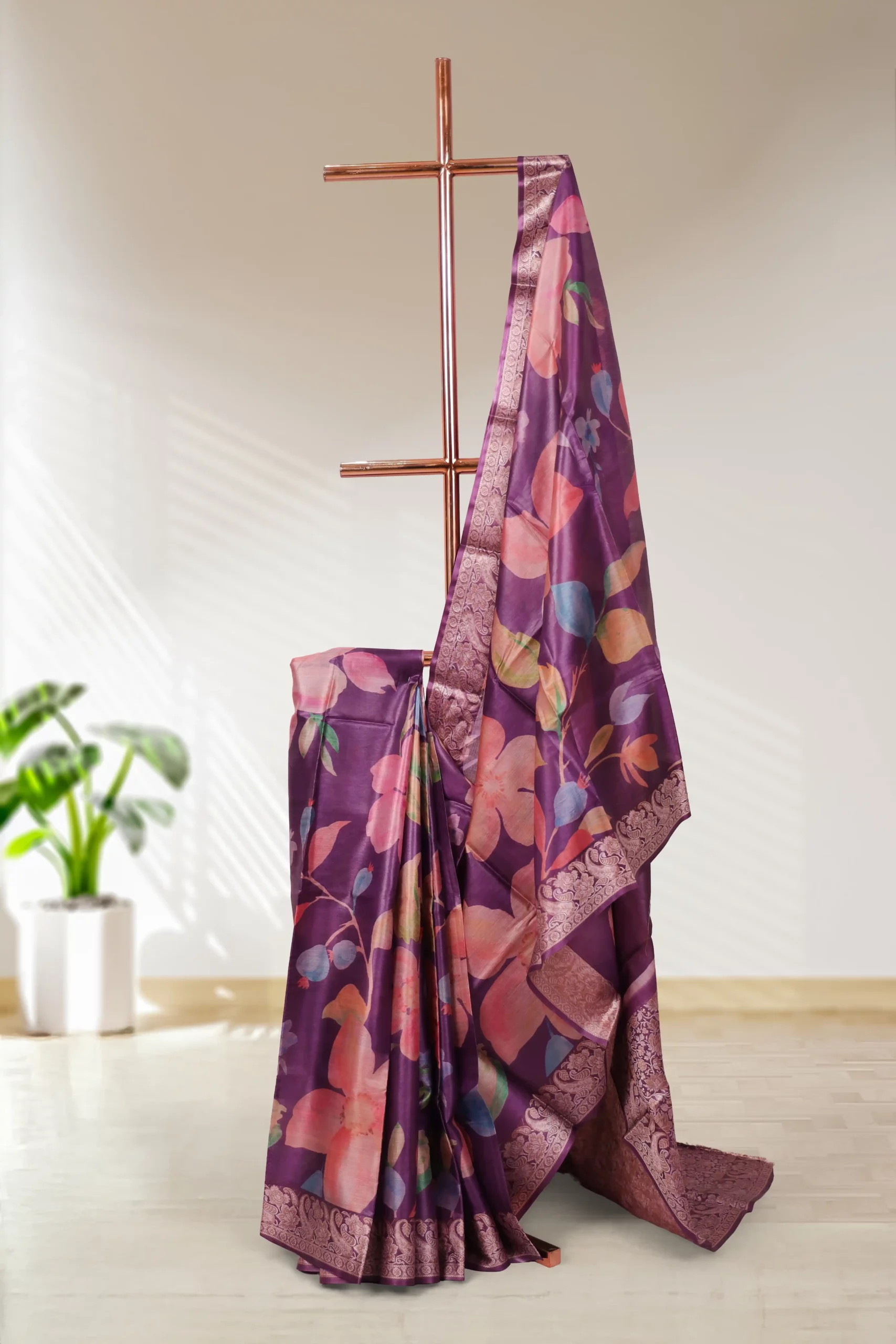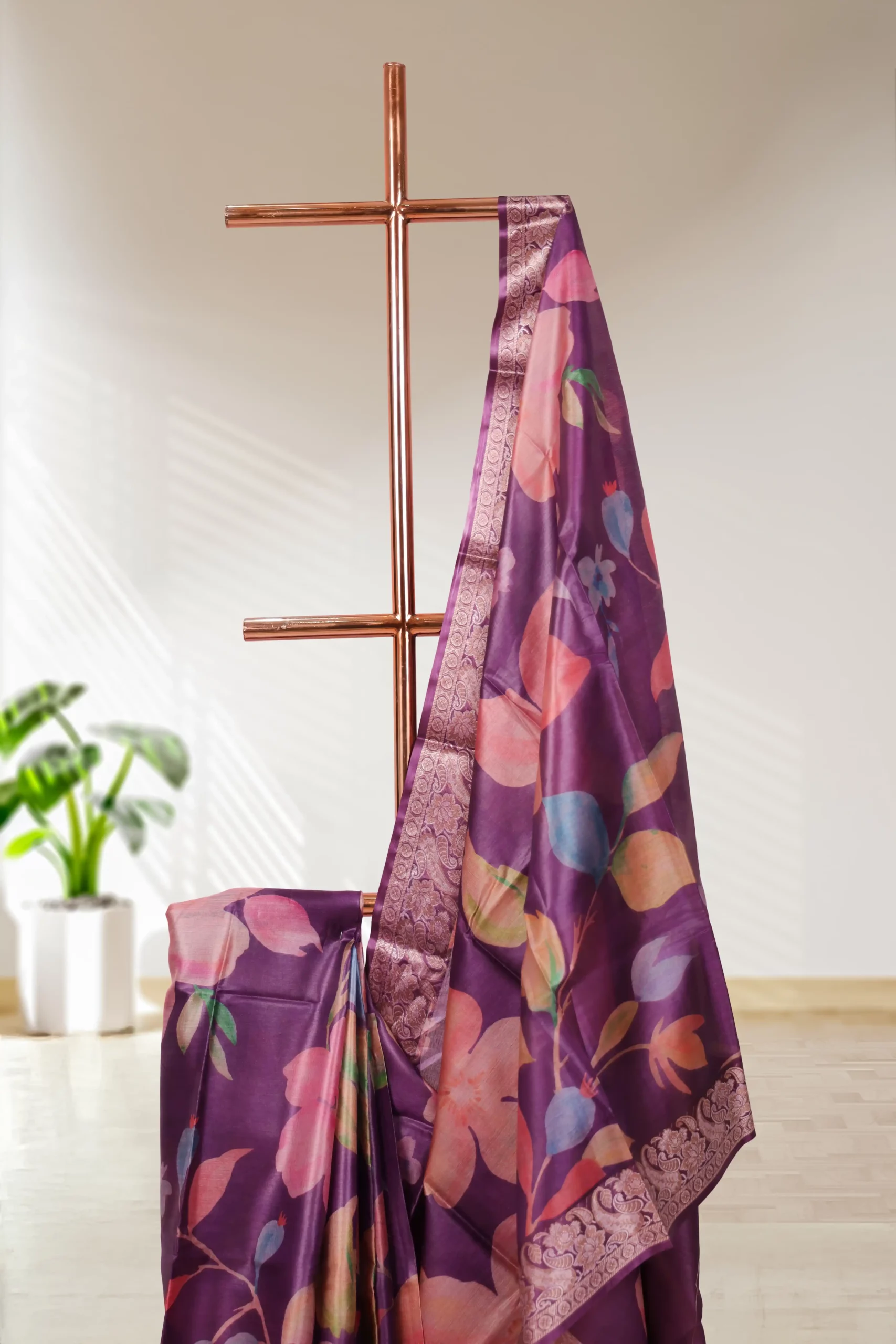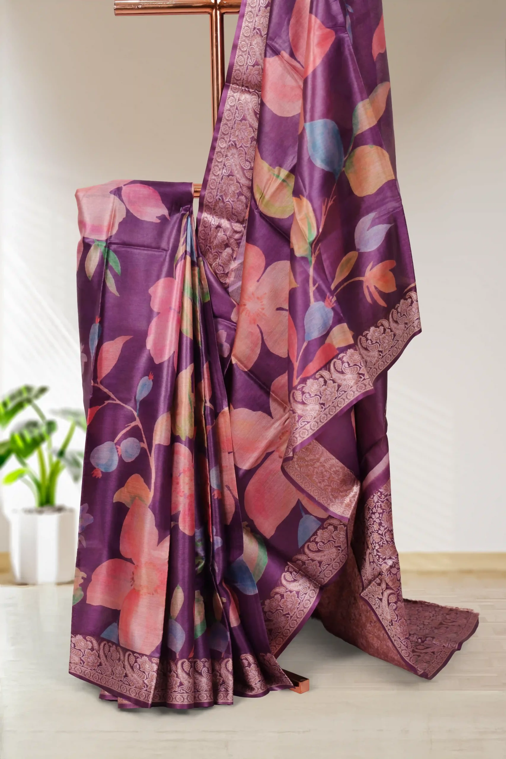 Purple Tussar Silk Printed Saree with Designer border. Includes Unstitched Blouse