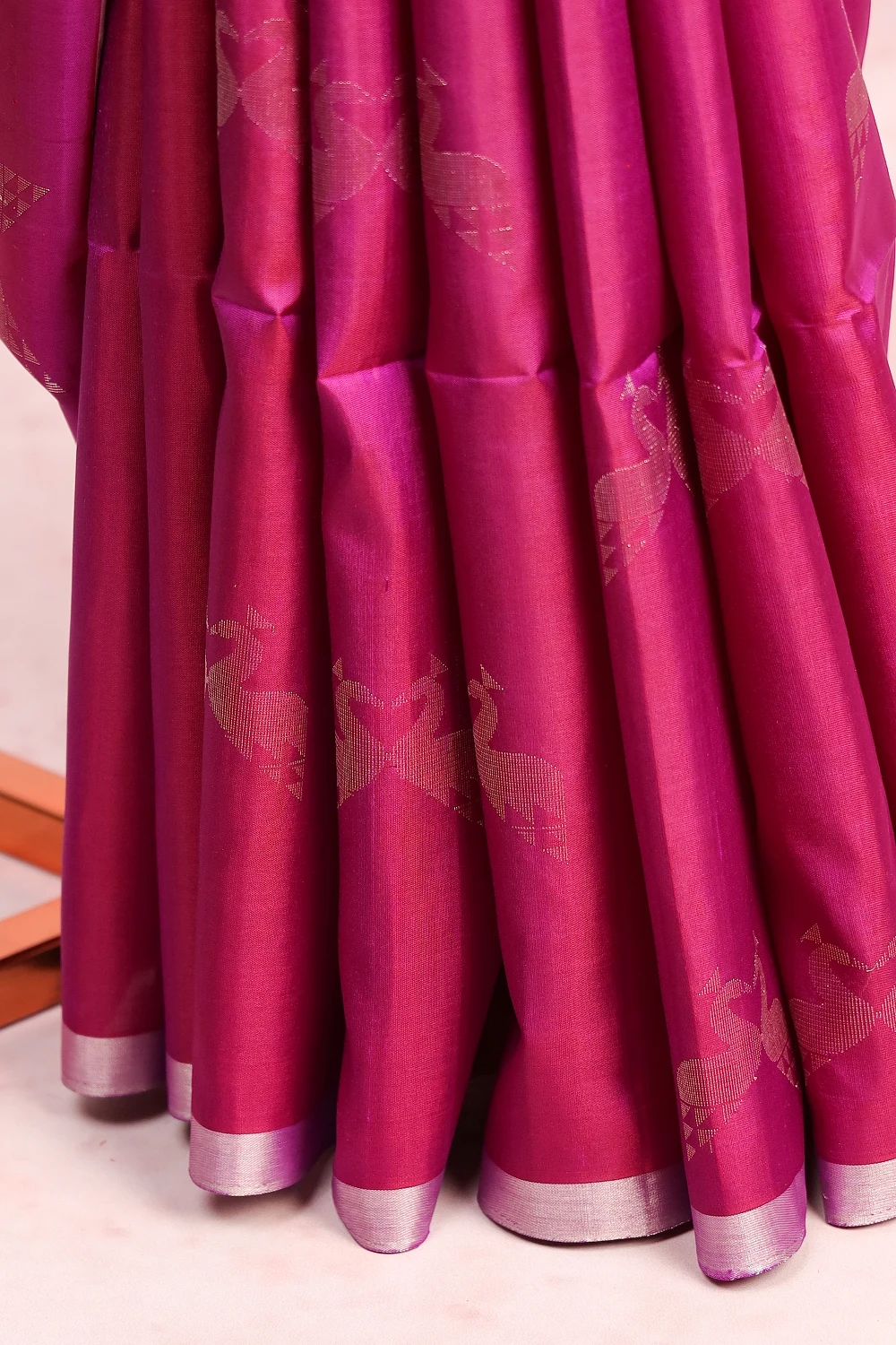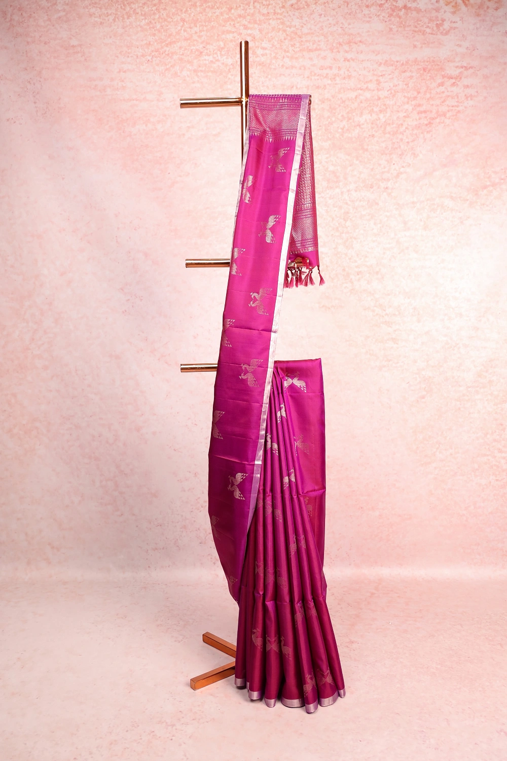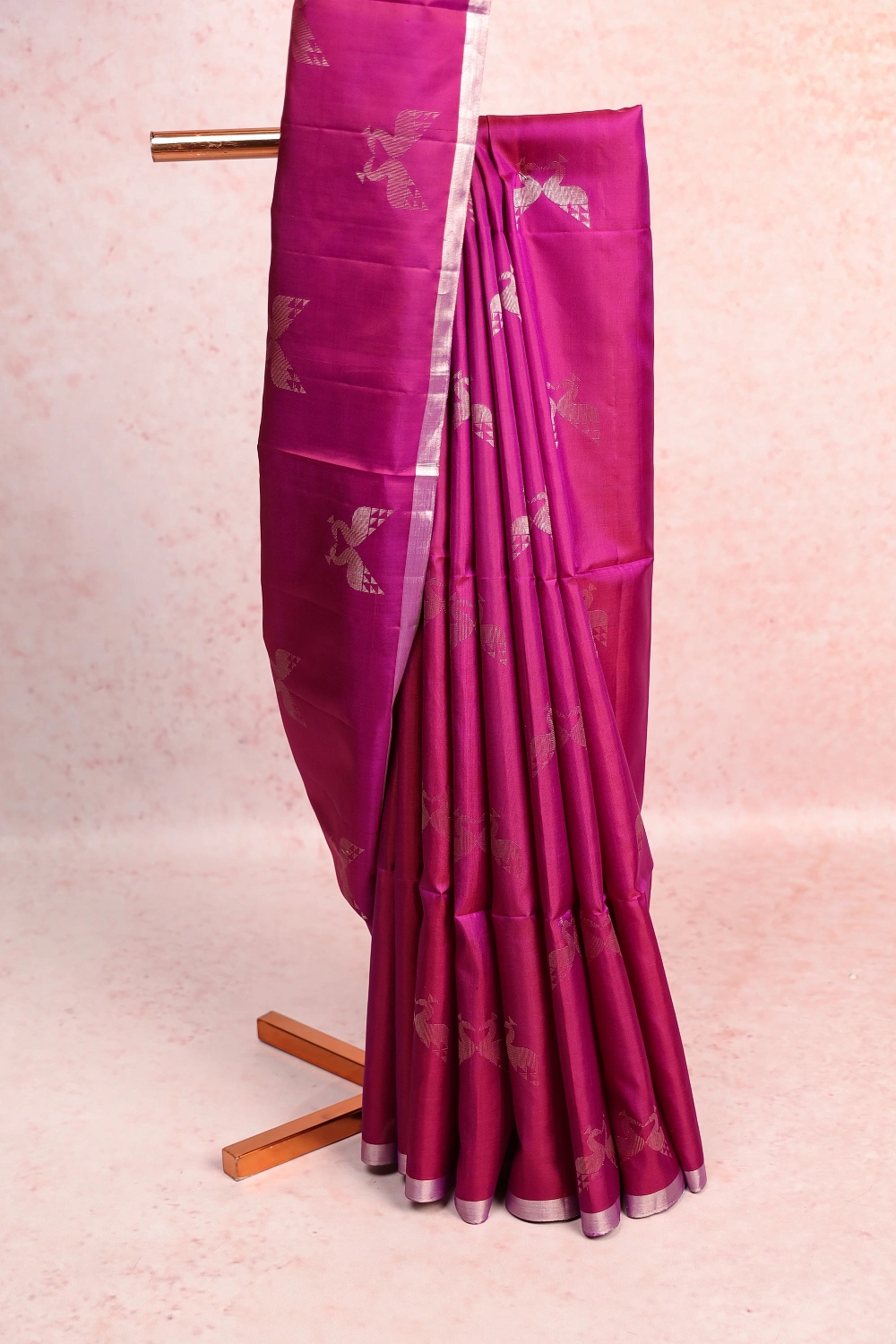 Purple Wine Kancheepuram Soft Silk Birds Design Saree with Piping Border. Includes Un stitched Blouse