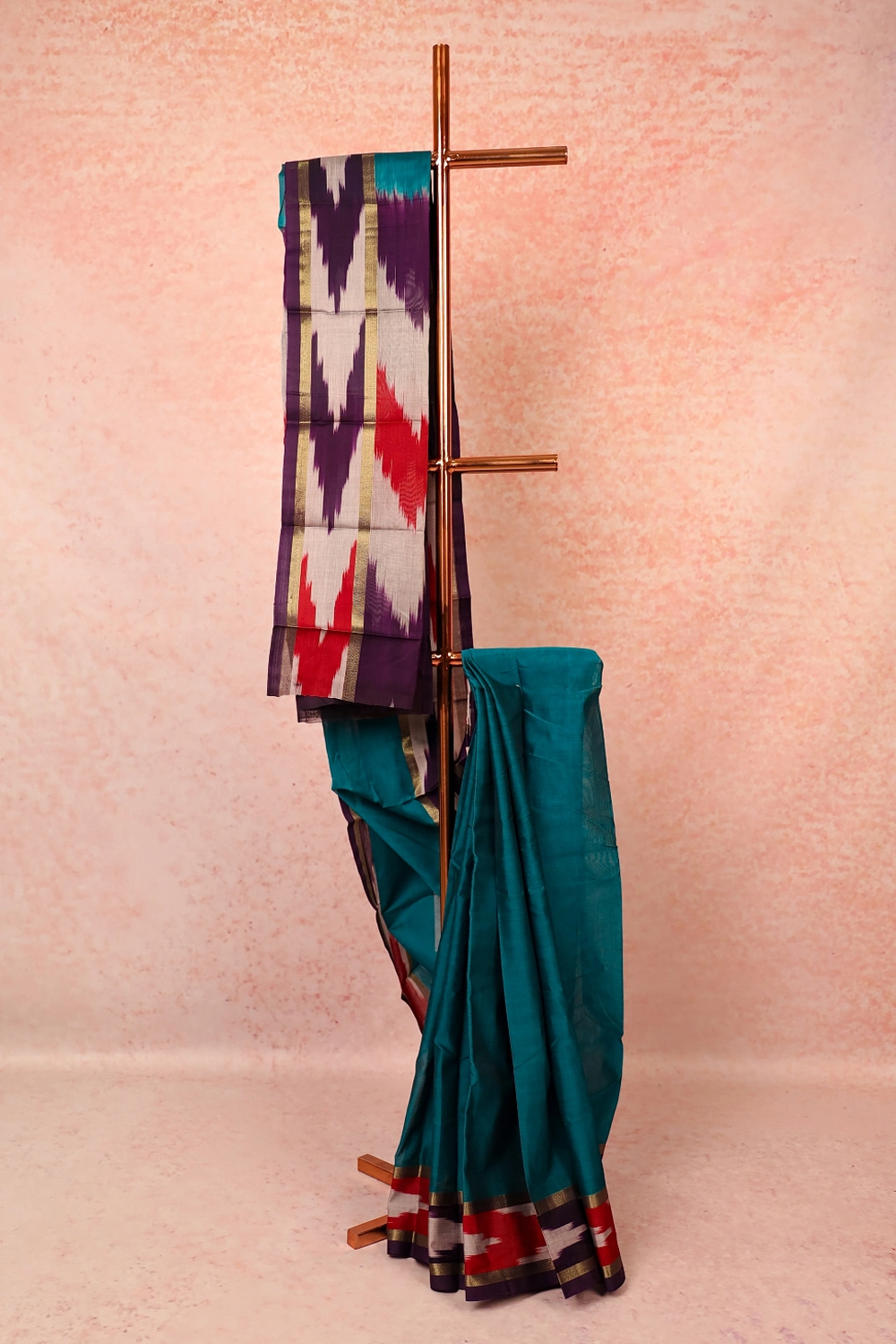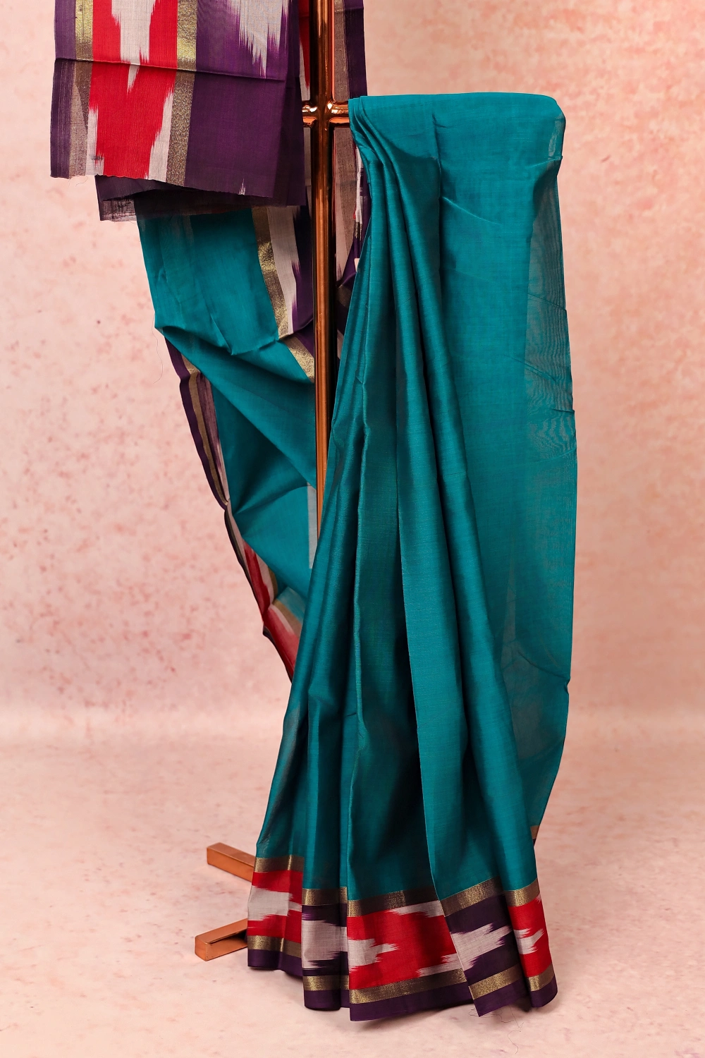 Rama Green Cotton Plain Body Saree with Pochampally border. Includes Unstitched Blouse