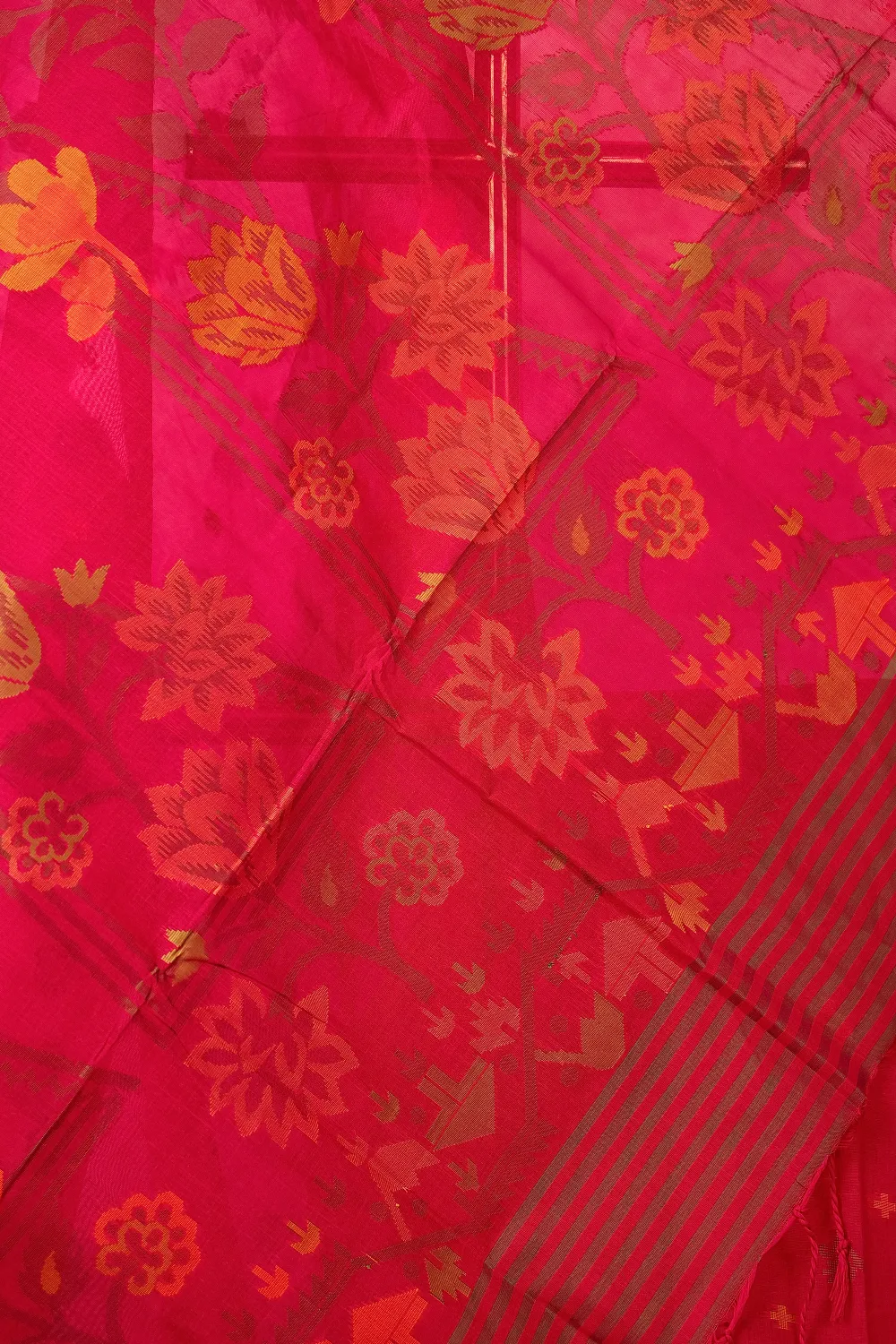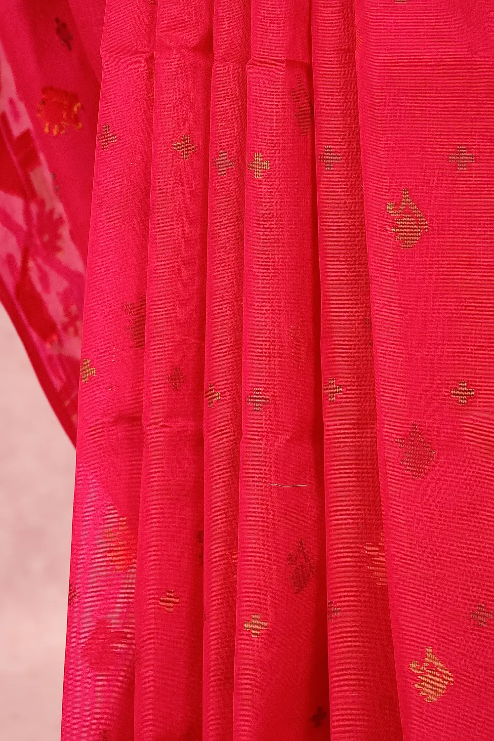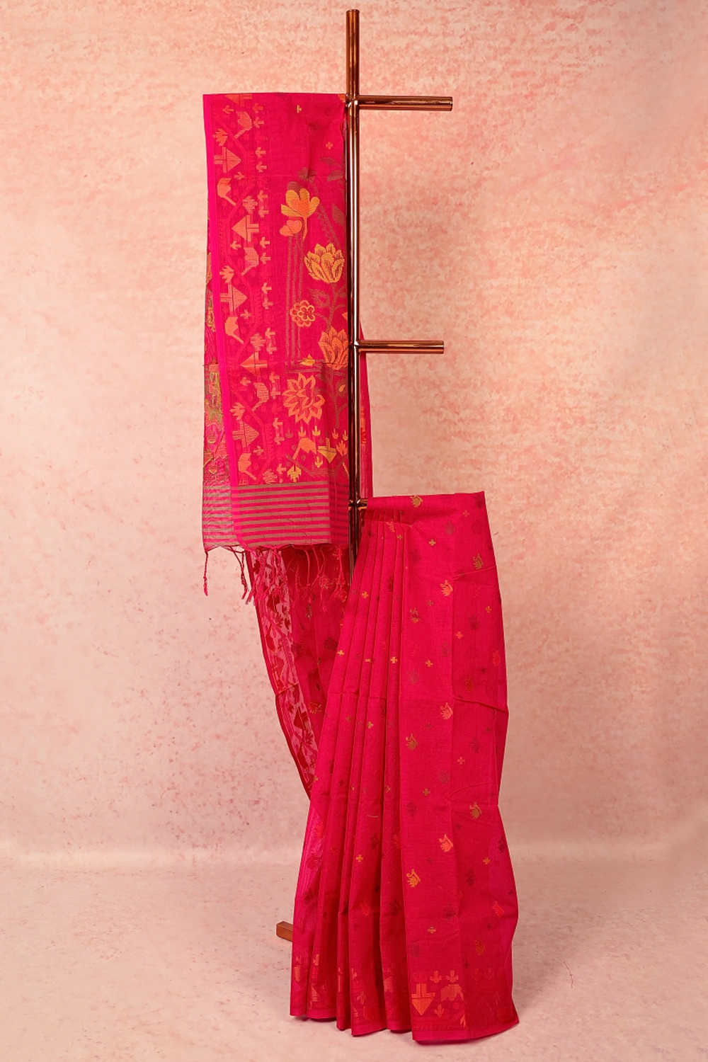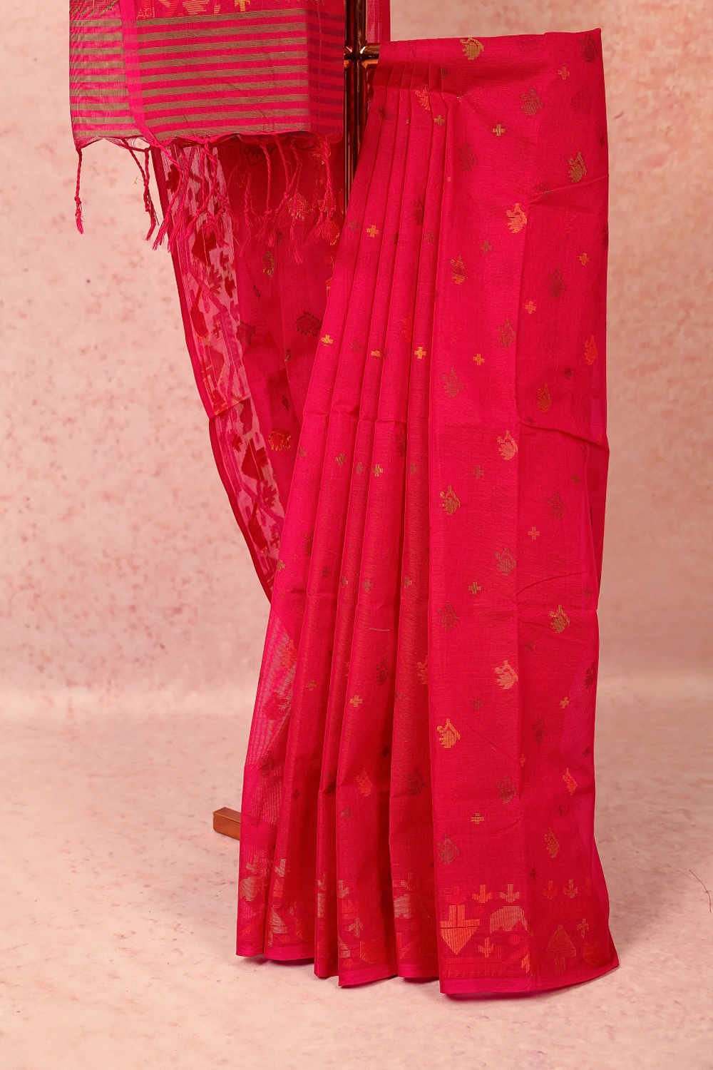 Rani Pink Cotton Embroidery Saree with Thread border. Includes Unstitched Blouse