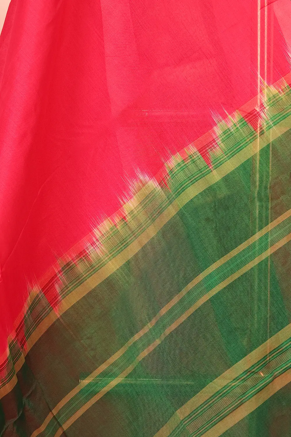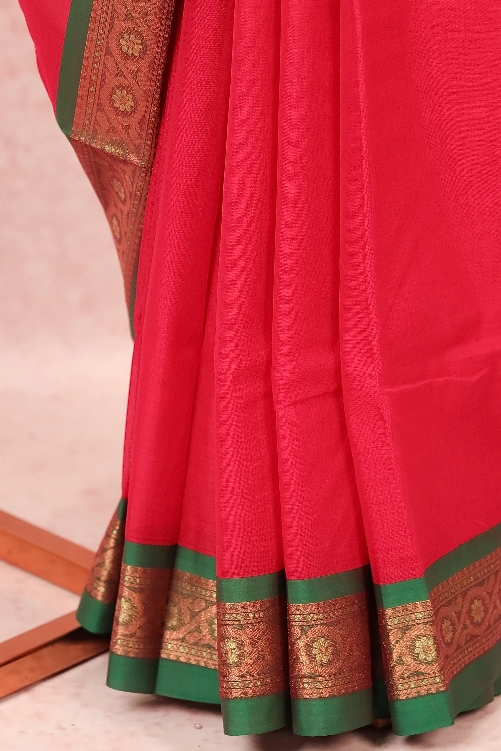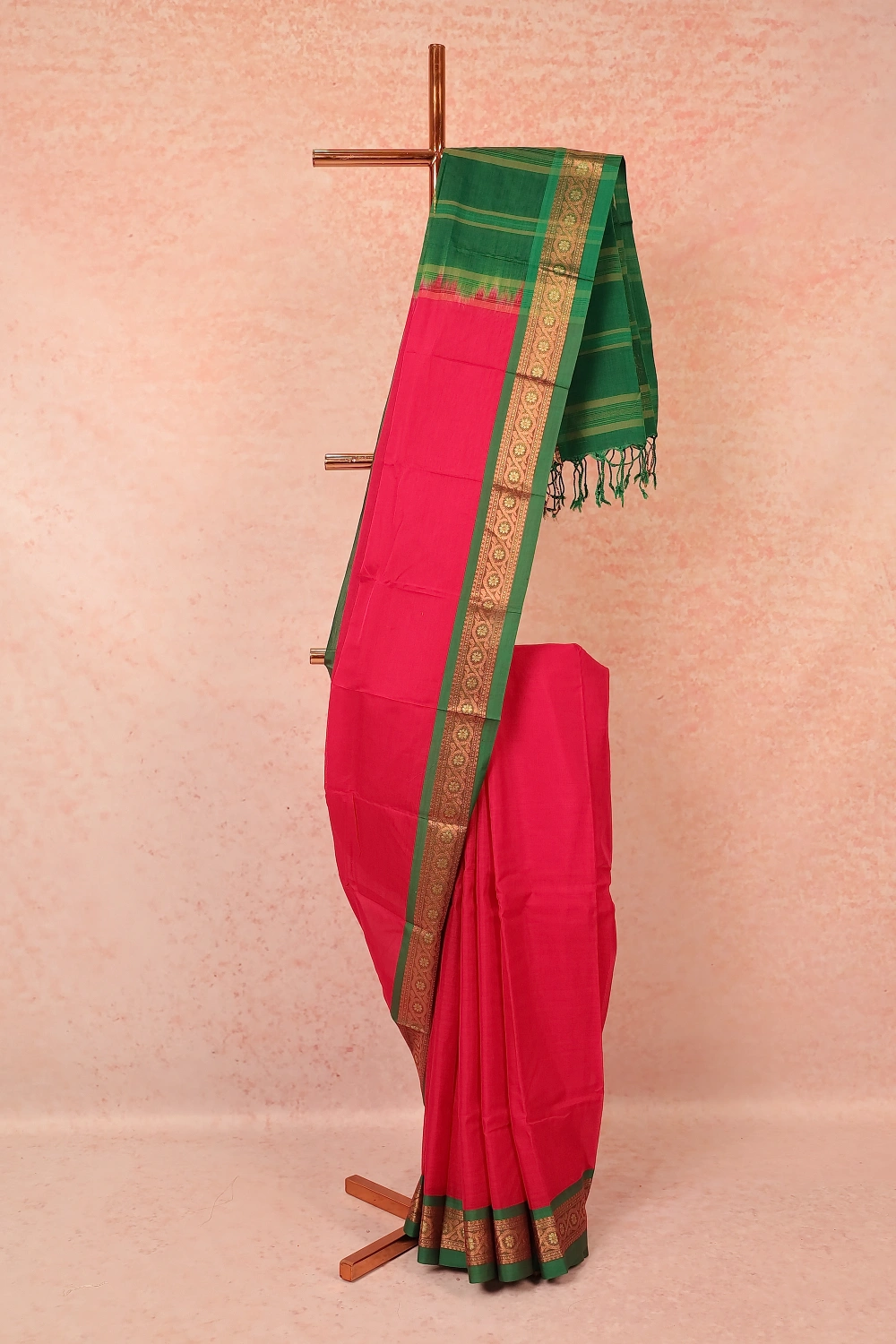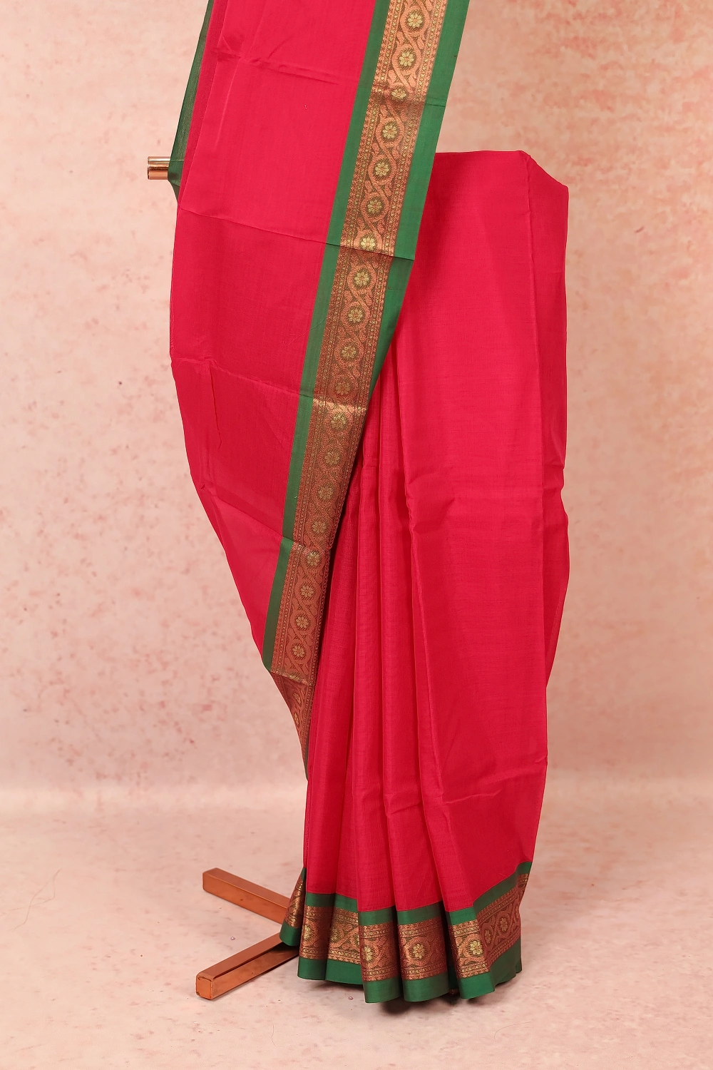 Rani Pink Cotton Plain Body Saree with Designer border. Includes Unstitched Blouse