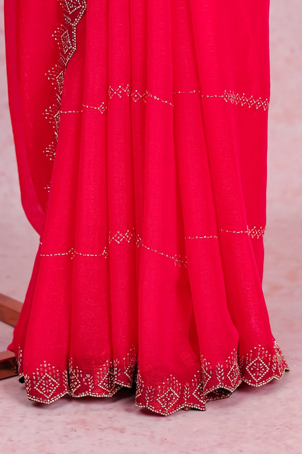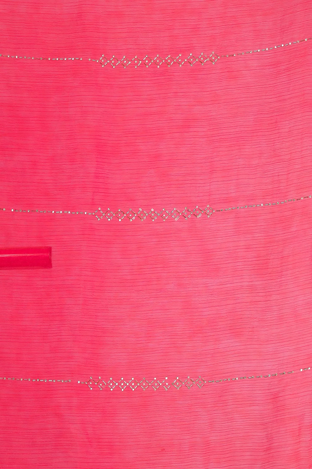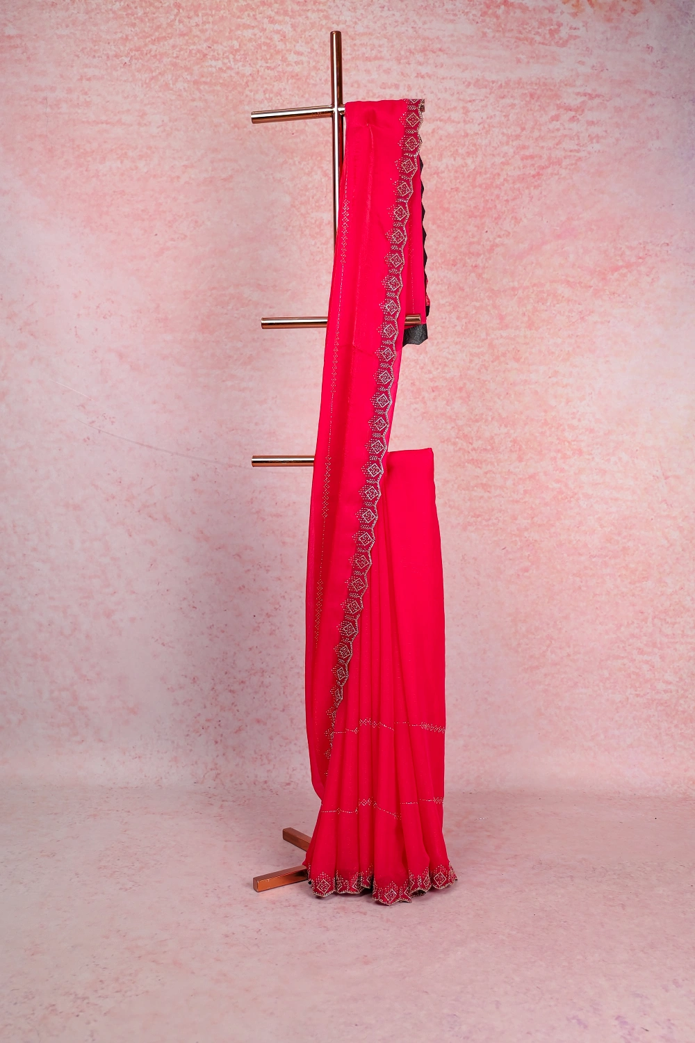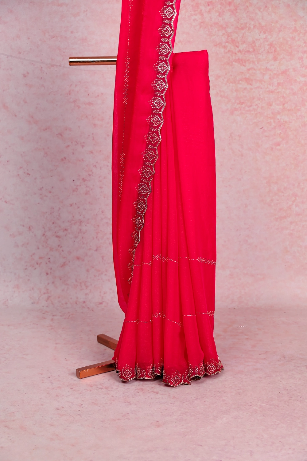 Rani Pink Organza Stone Work Saree with Scallop Border. Includes Unstitched Blouse