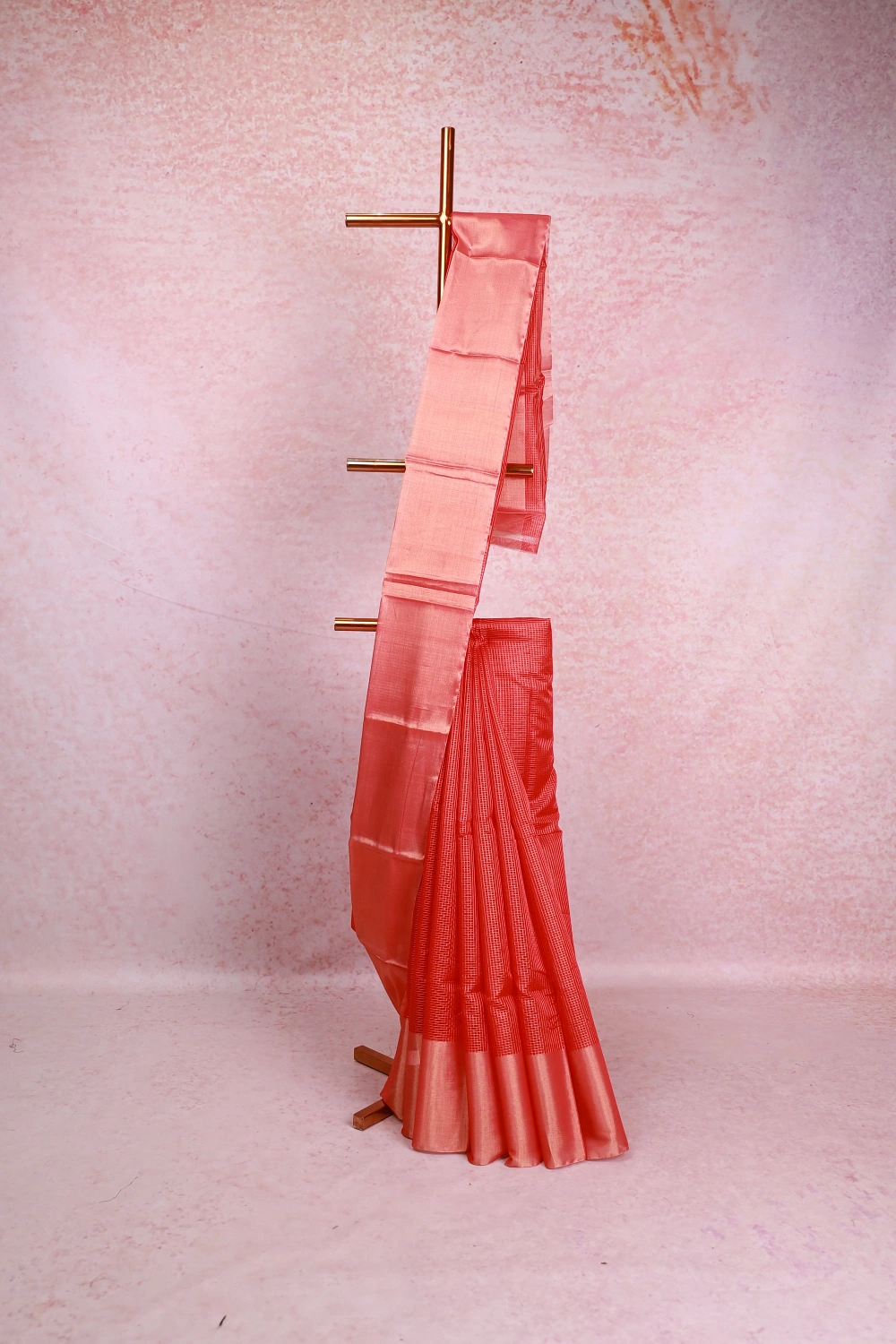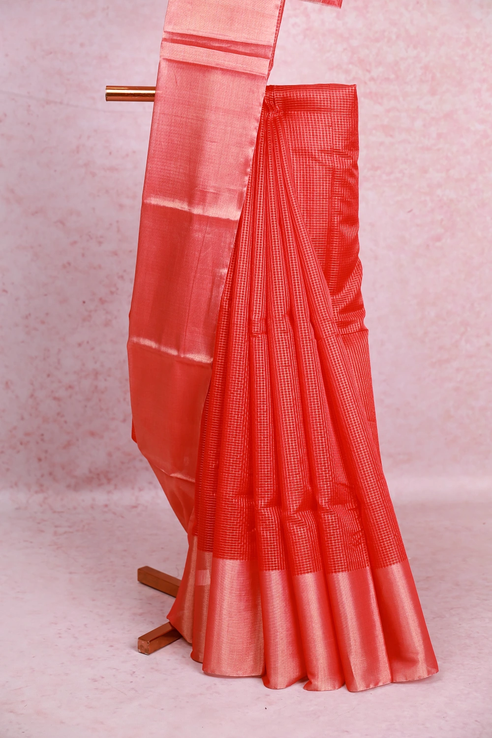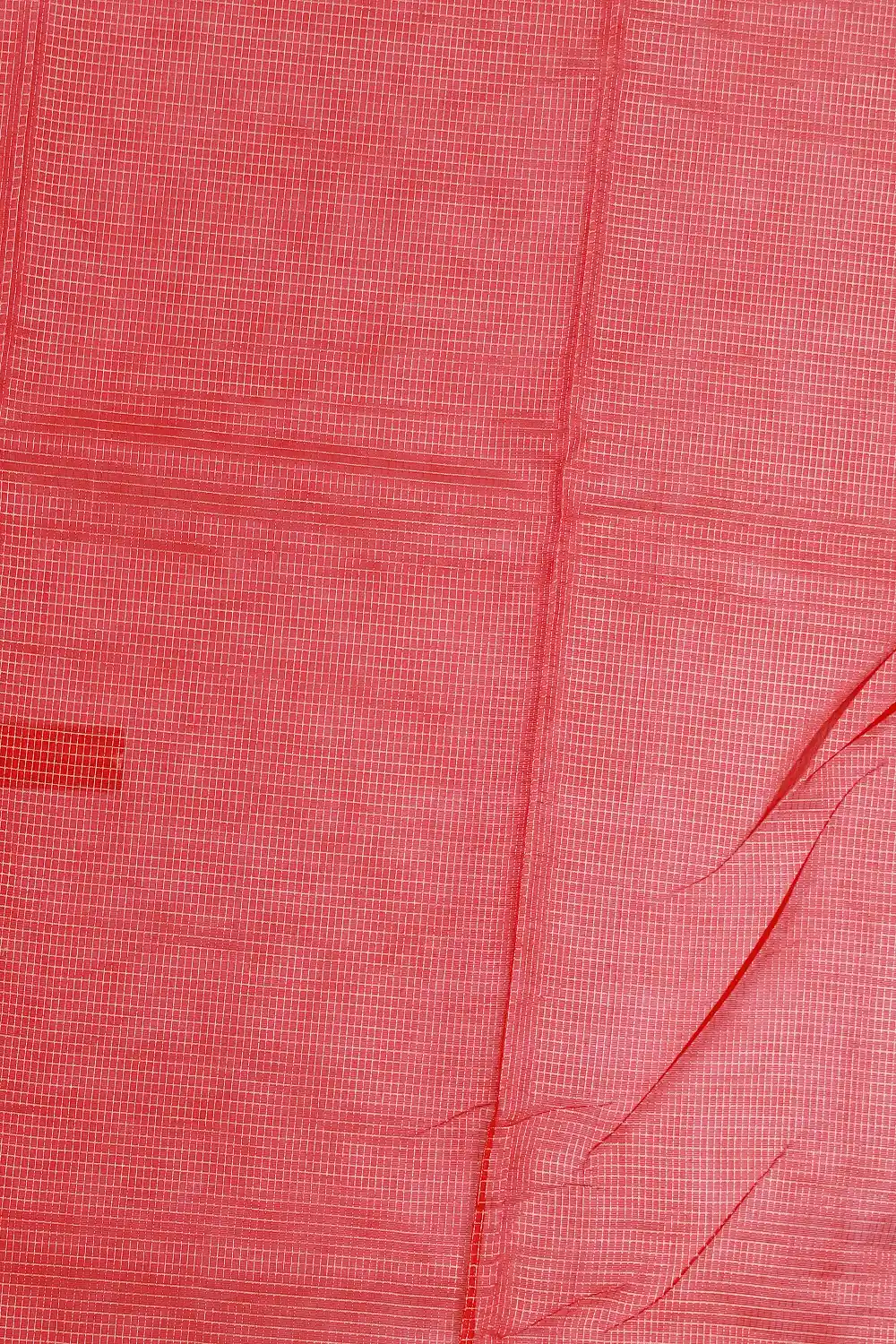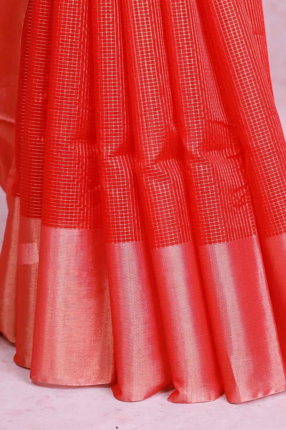 Red Cotton Small Checks Saree With Zari Border. Includes Unstitched Blouse
