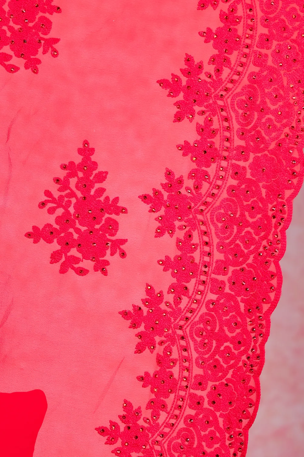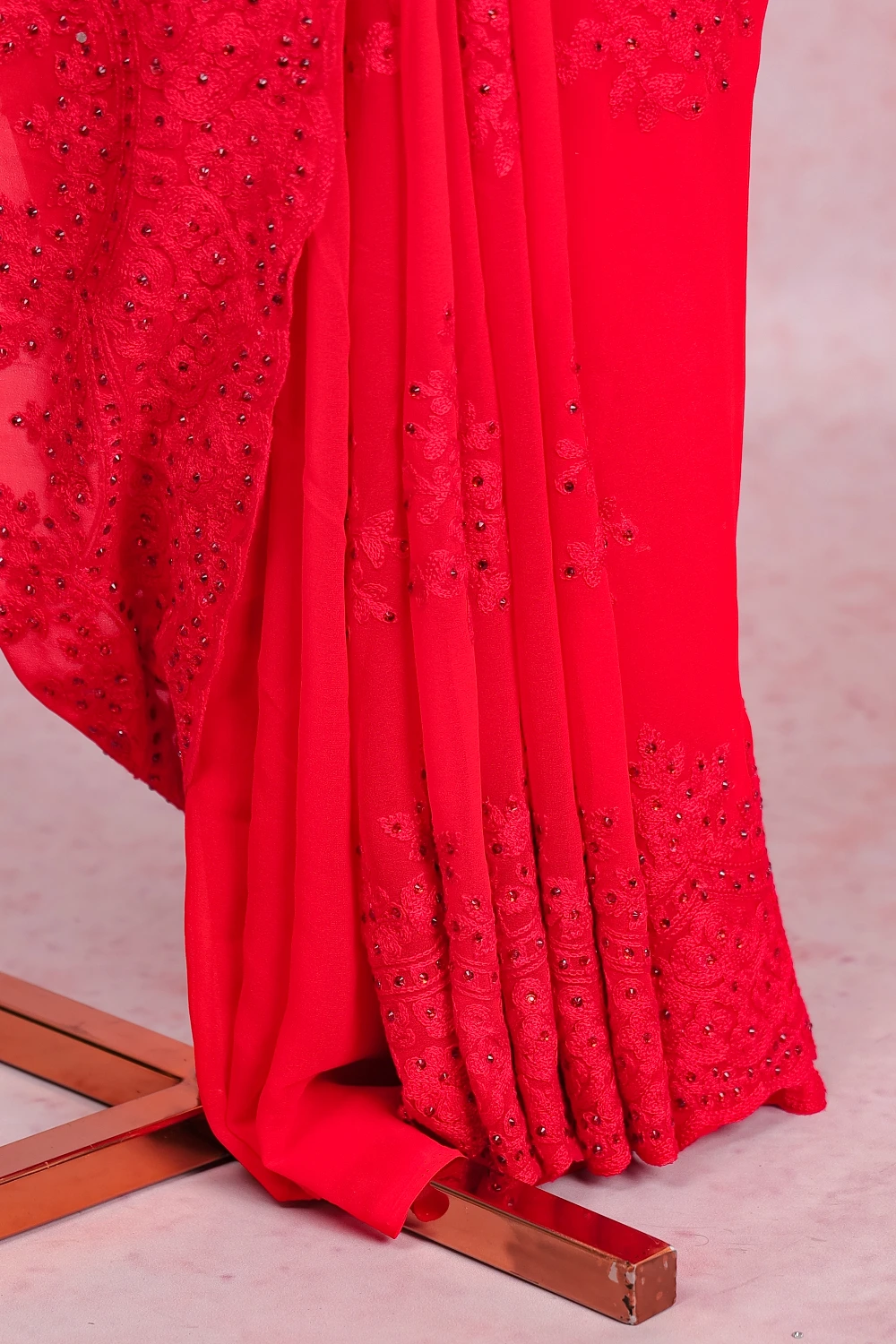 Red Geogette Chicken Work Saree with Scallop Border. Includes Unstitched Blouse