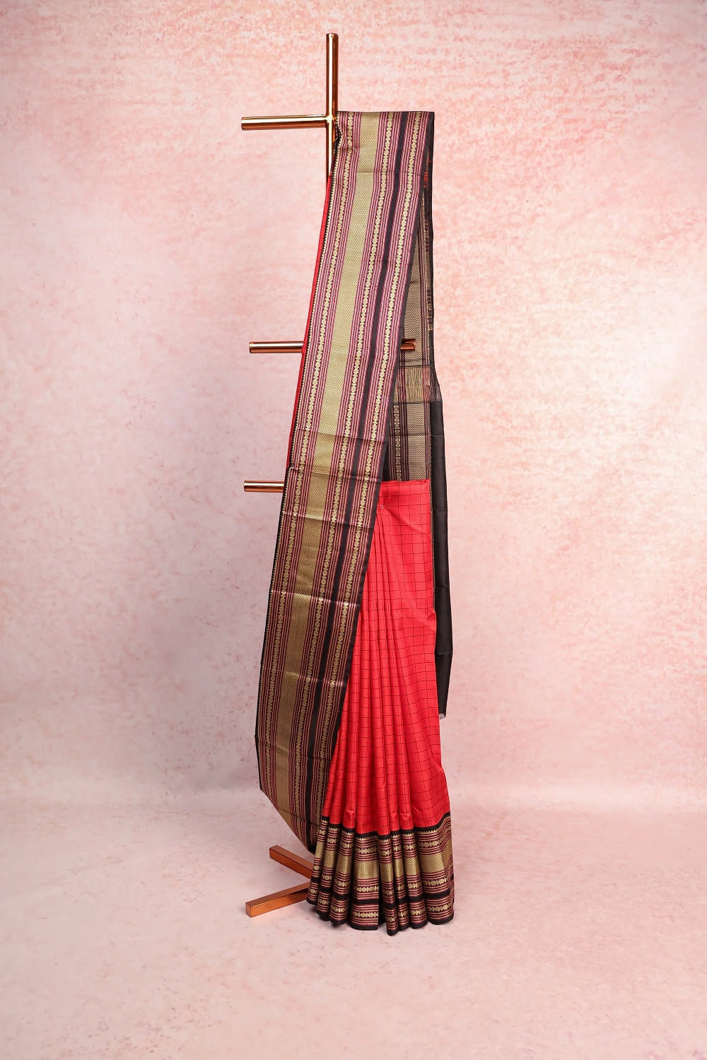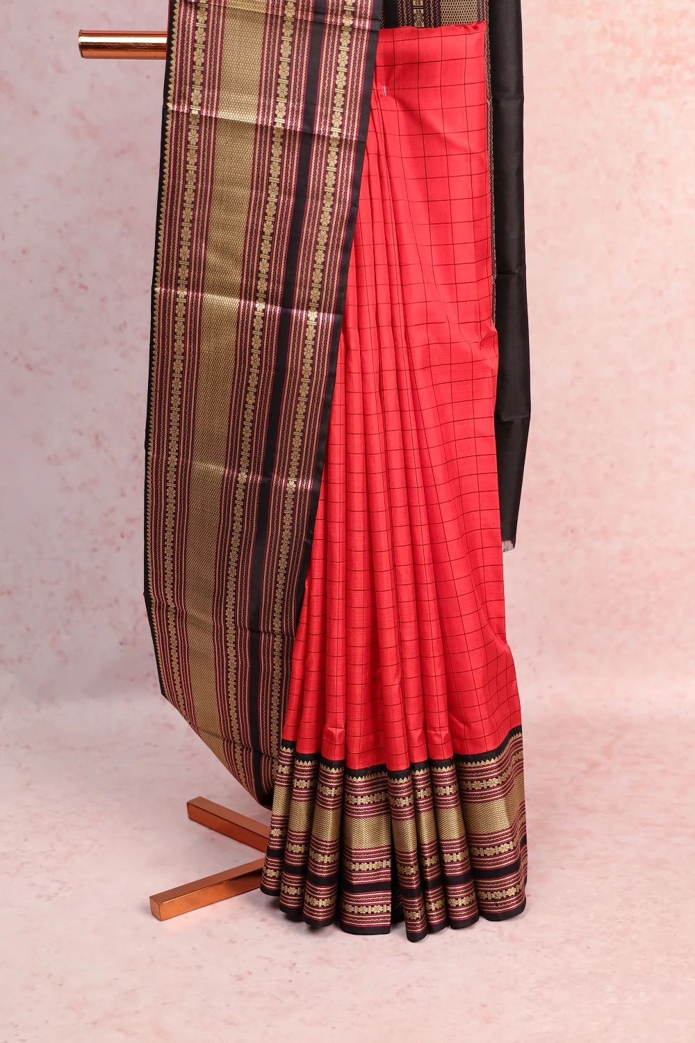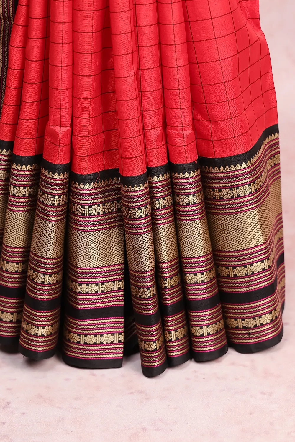 Red Kancheepuram Silk Check Saree with Thread Border. Includes Un stitched Blouse