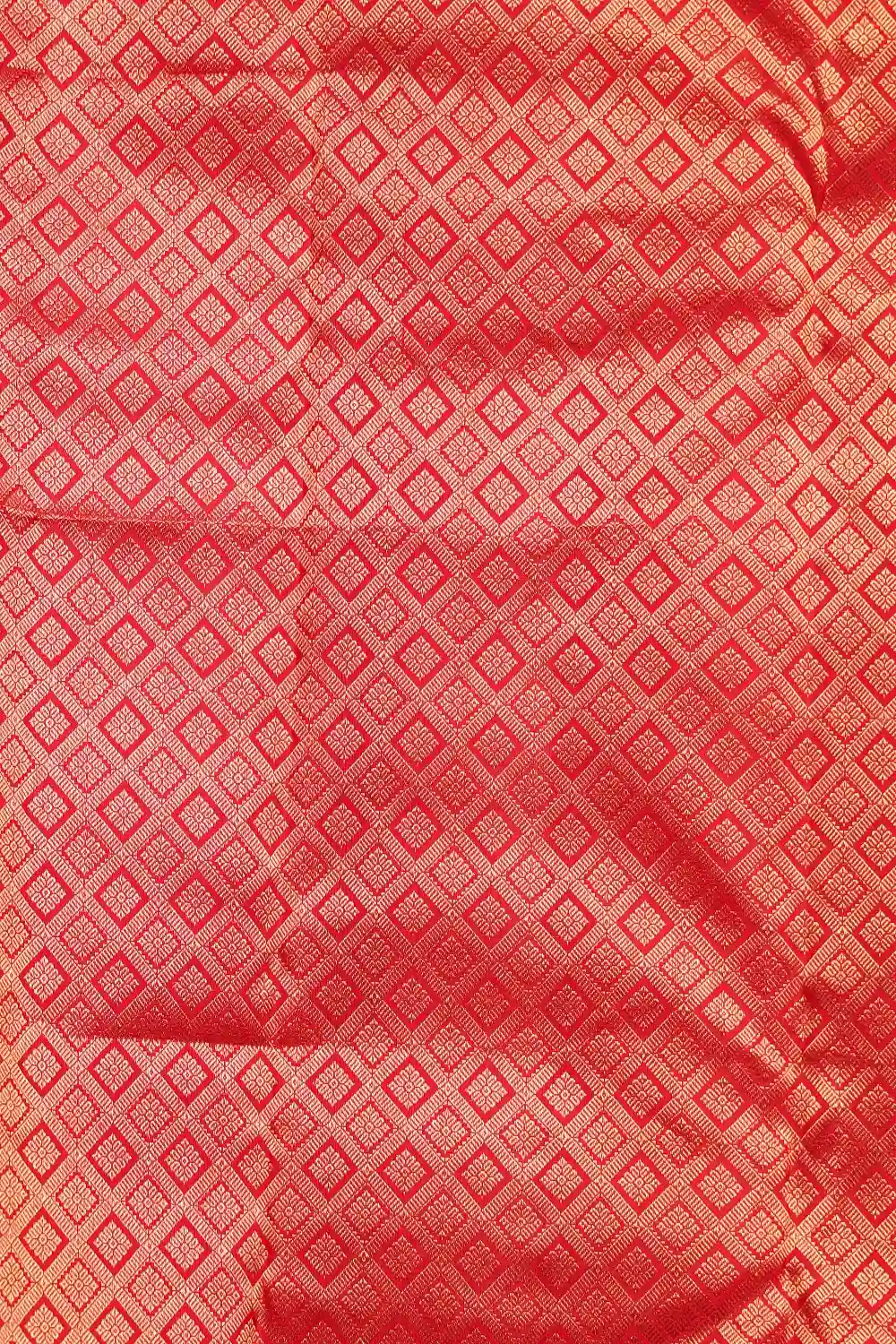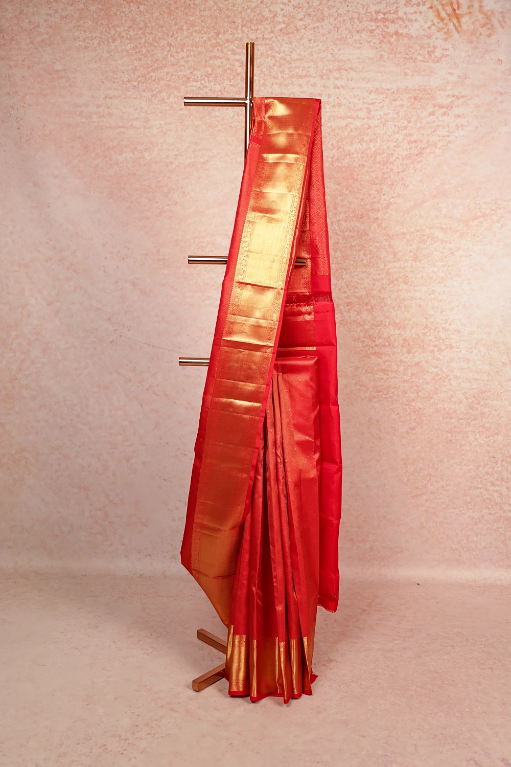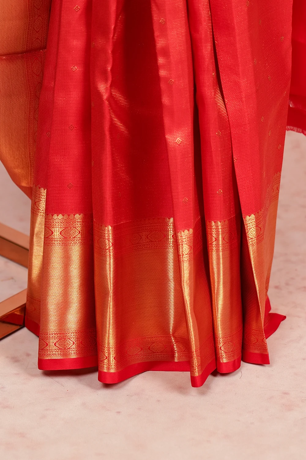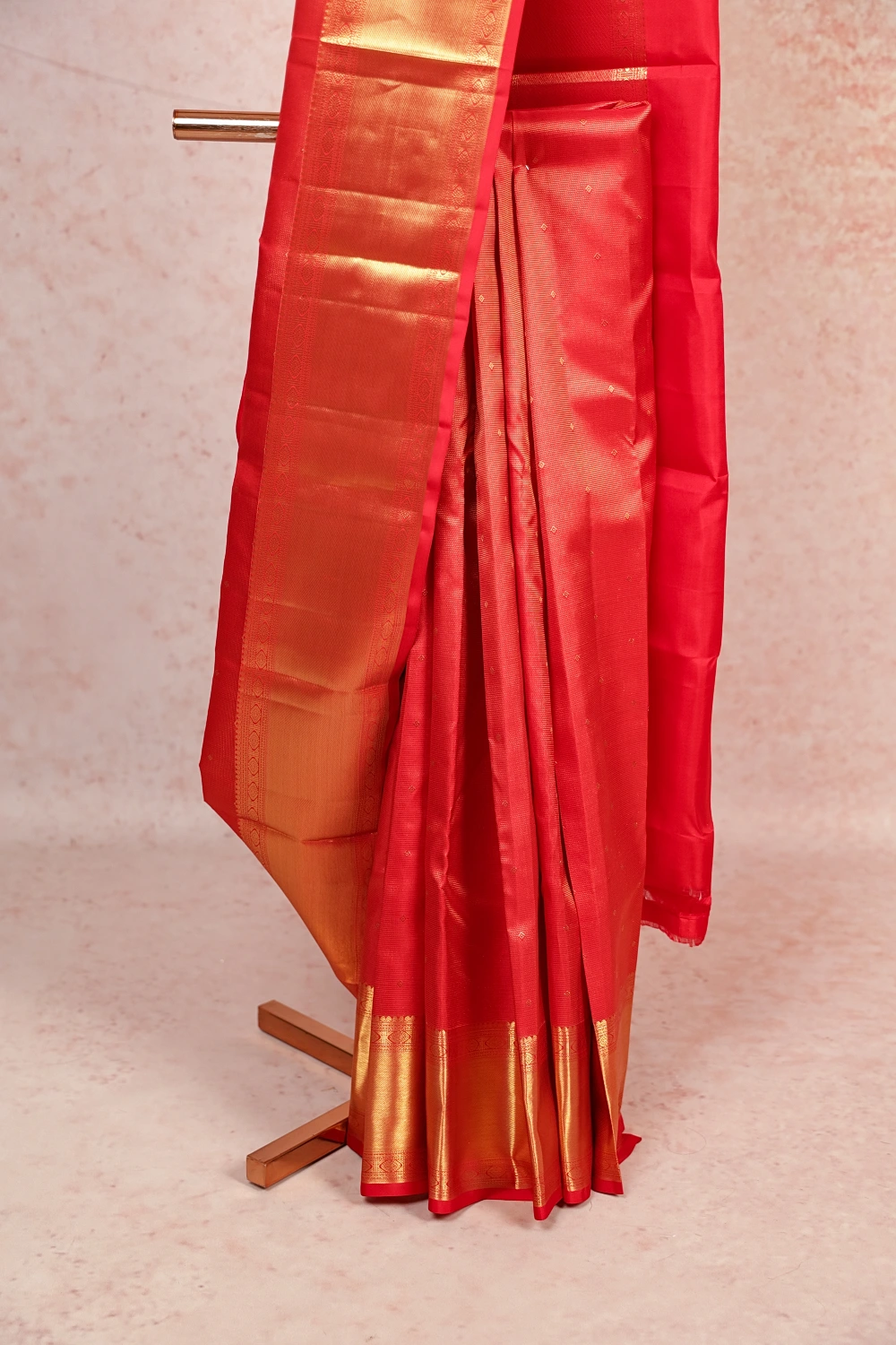 Red Kancheepuram Shimmer Butta Saree with Bavanji Border. Includes Unstitched Blouse