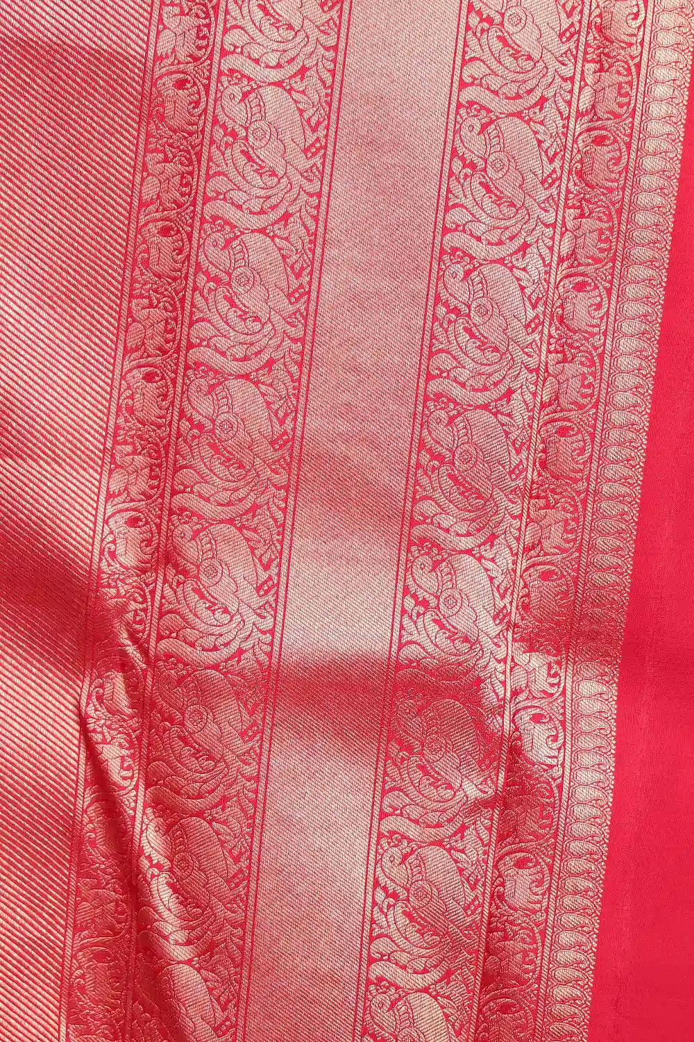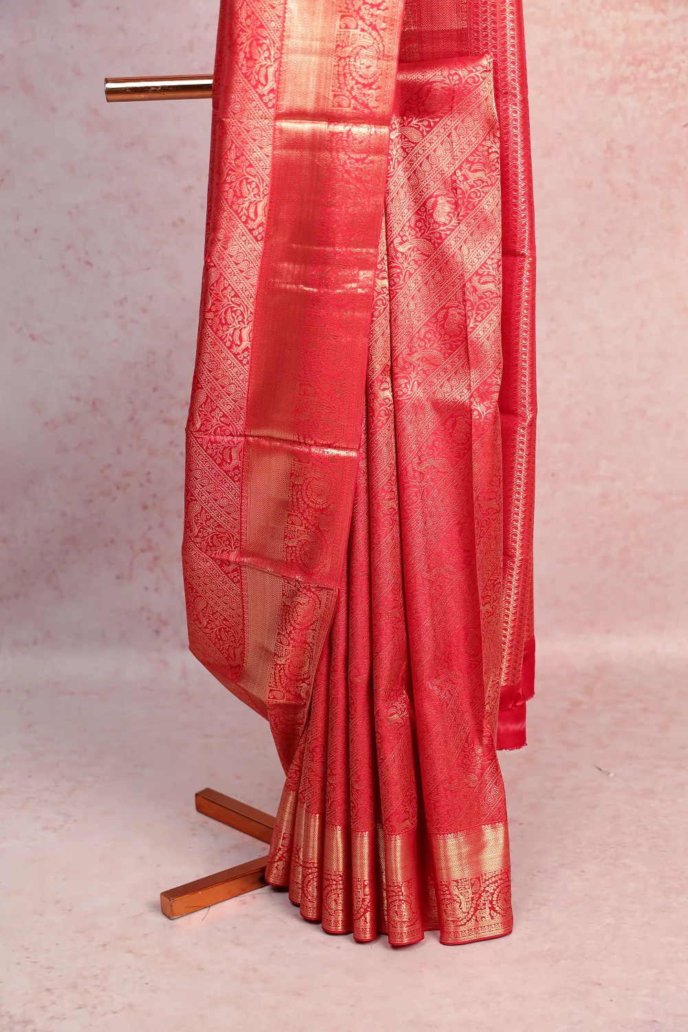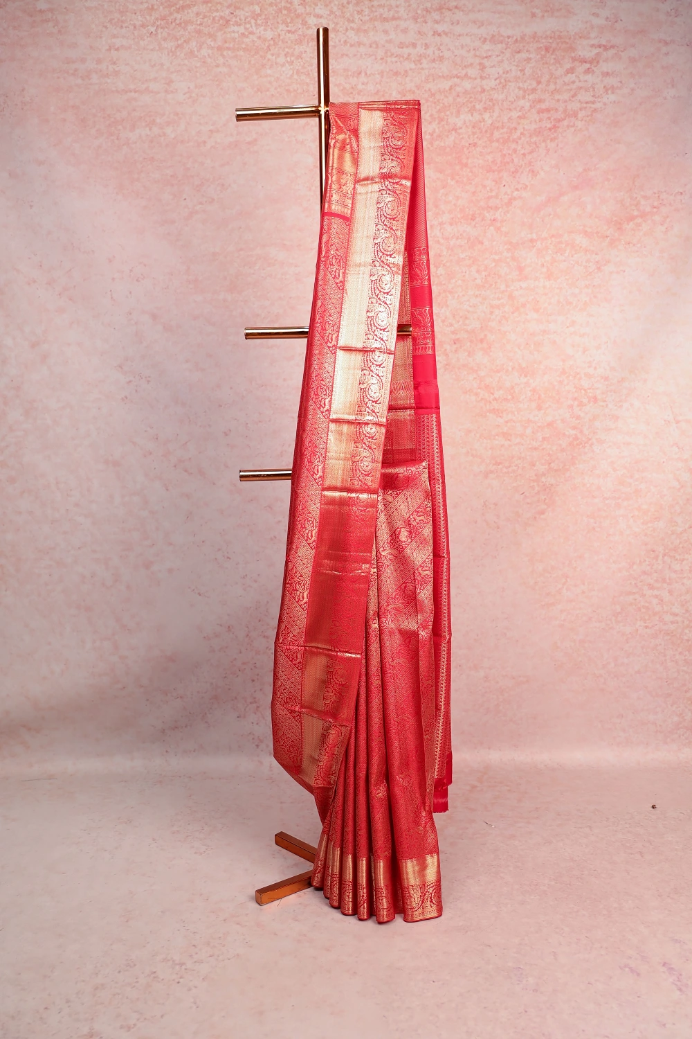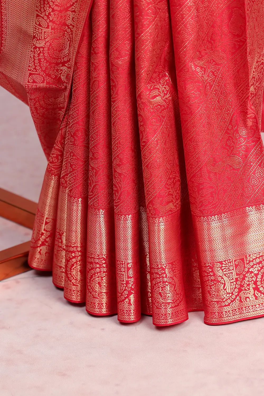 Red Kancheepuram Silk Brocade Saree with Designer Border. Includes Unstitched Blouse