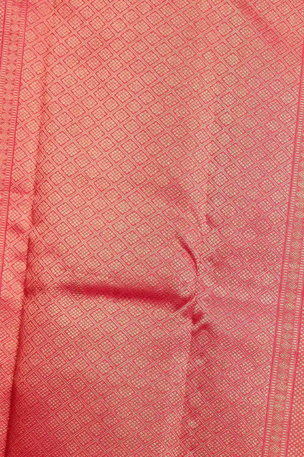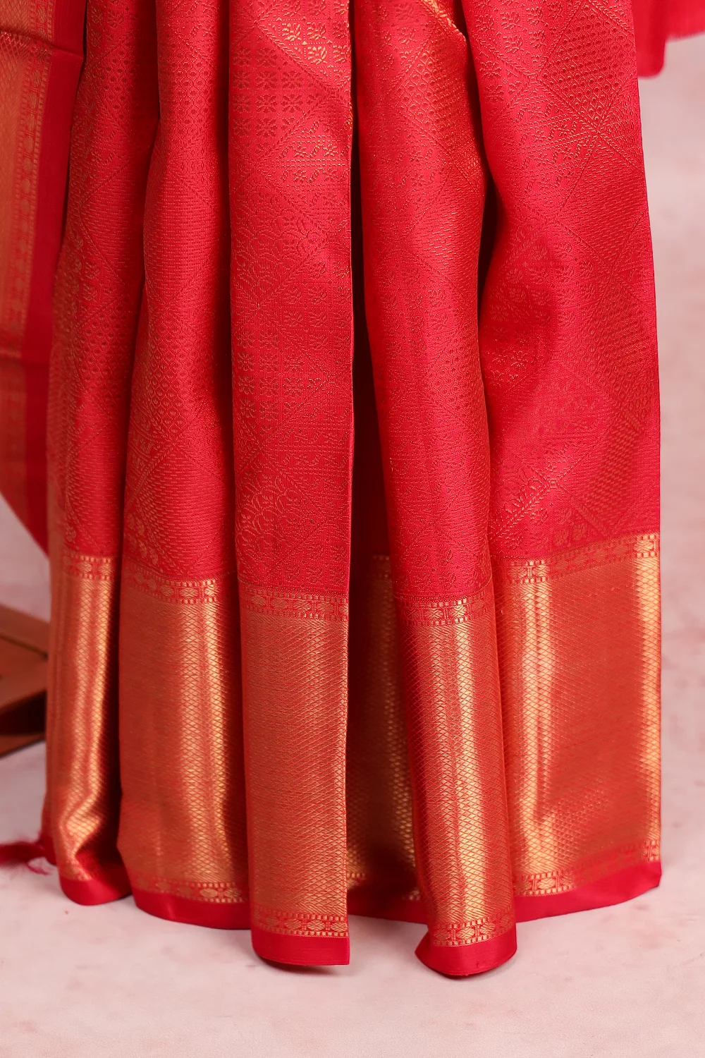 Red Kancheepuram Silk Brocade Saree with Designer Border. Includes Unstitched Blouse