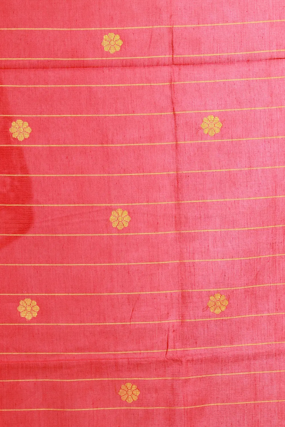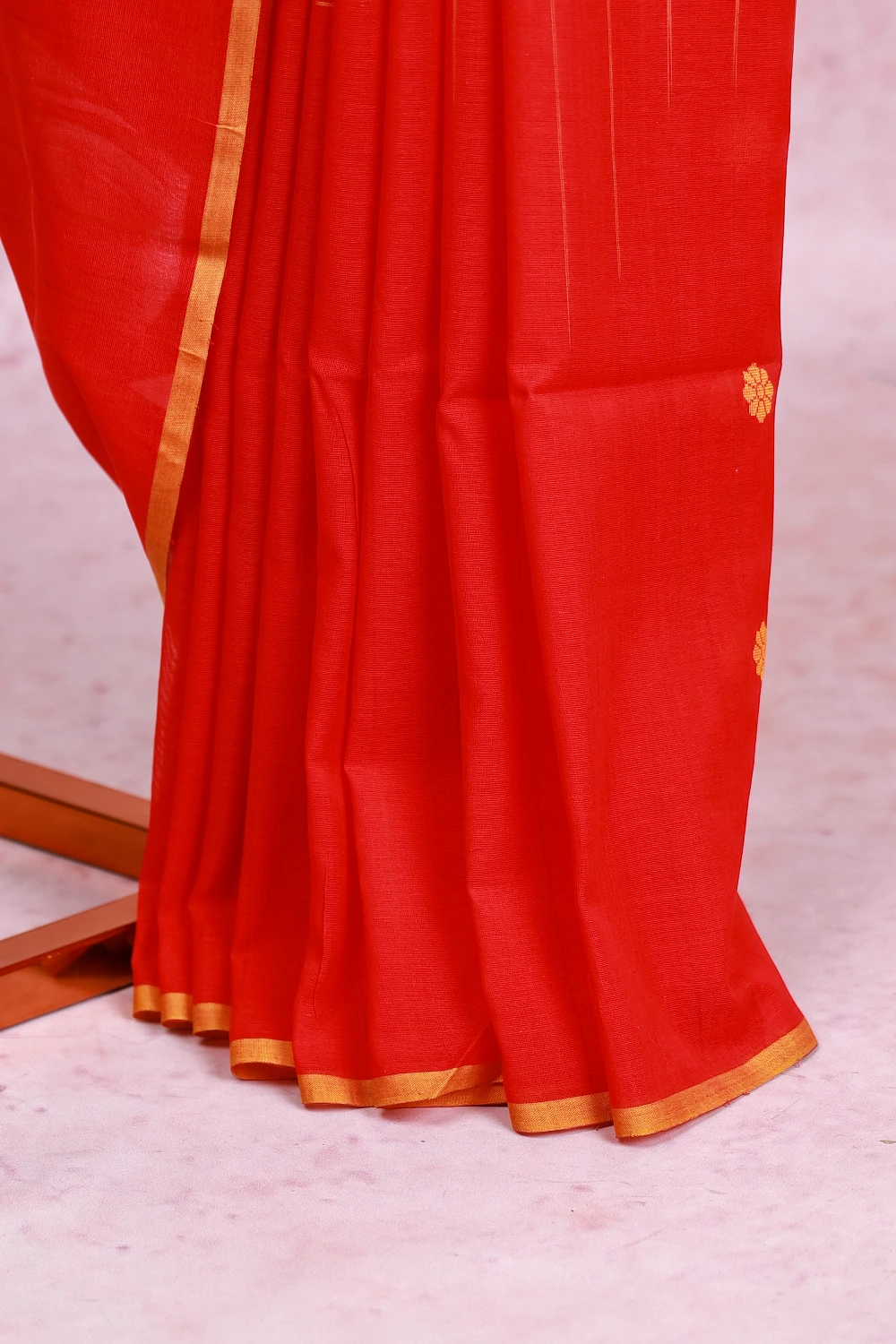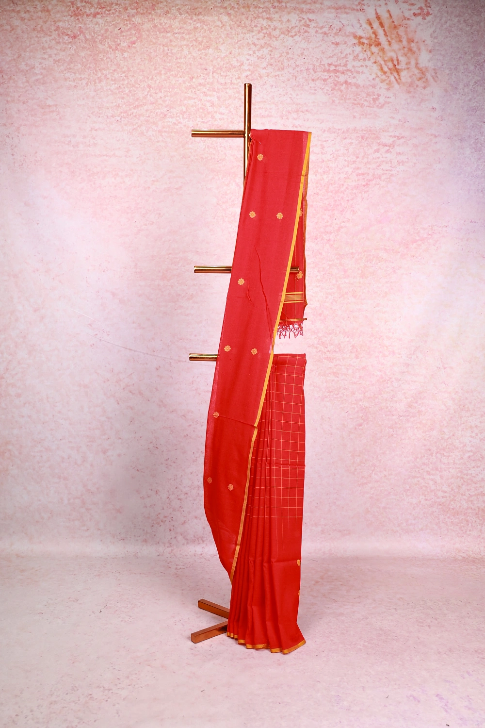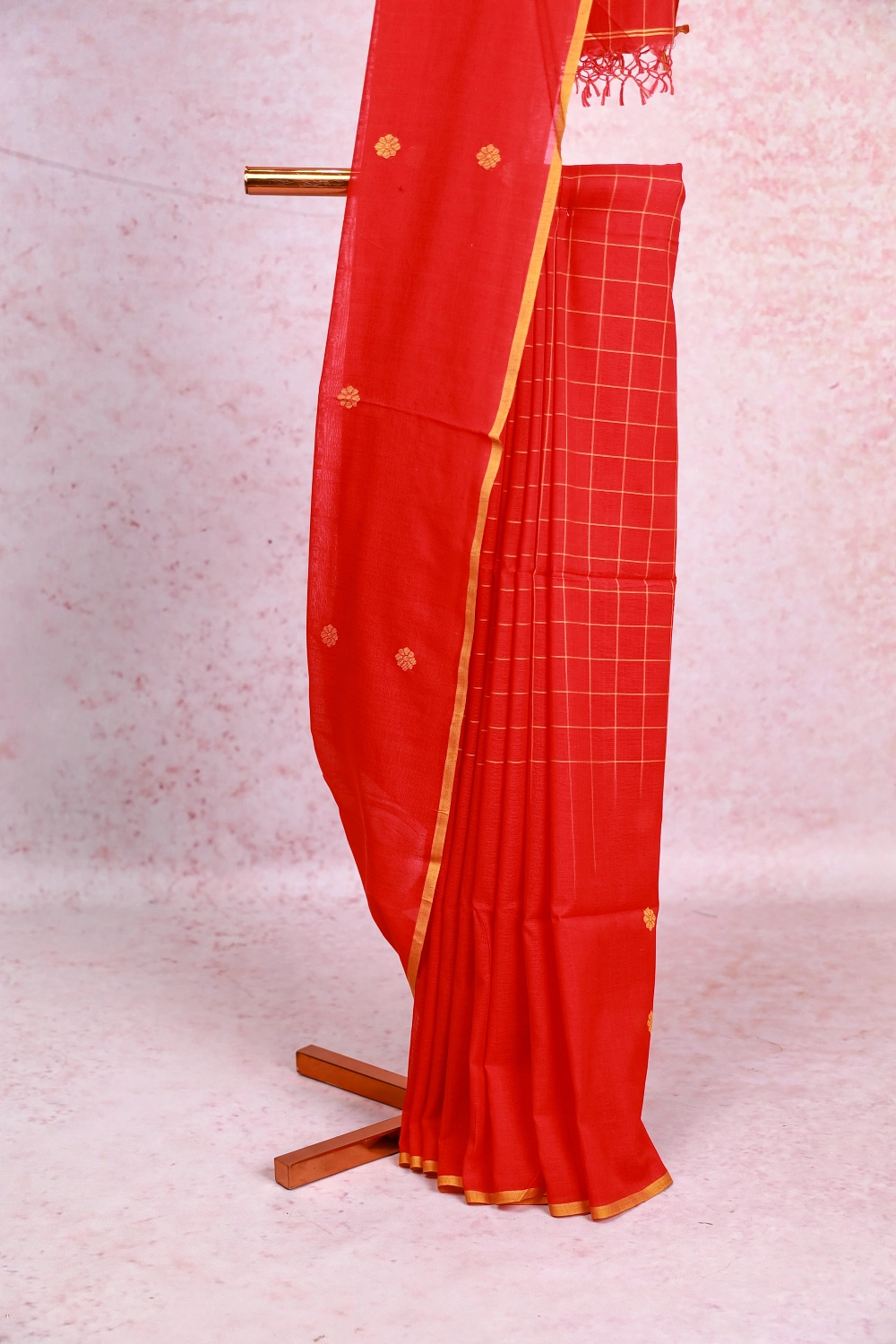 Red Mul Cotton Check With Butta Saree With Small Border. Includes Unstitched Blouse