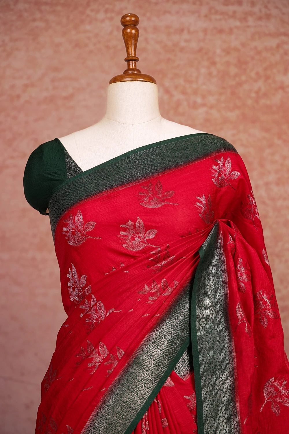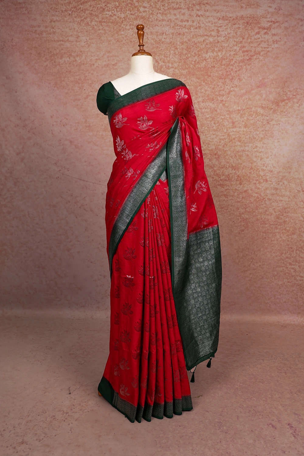 Red Semi Banarasi, Banarasi Design Saree With Banarasi Border. Includes Unstitched Blouse