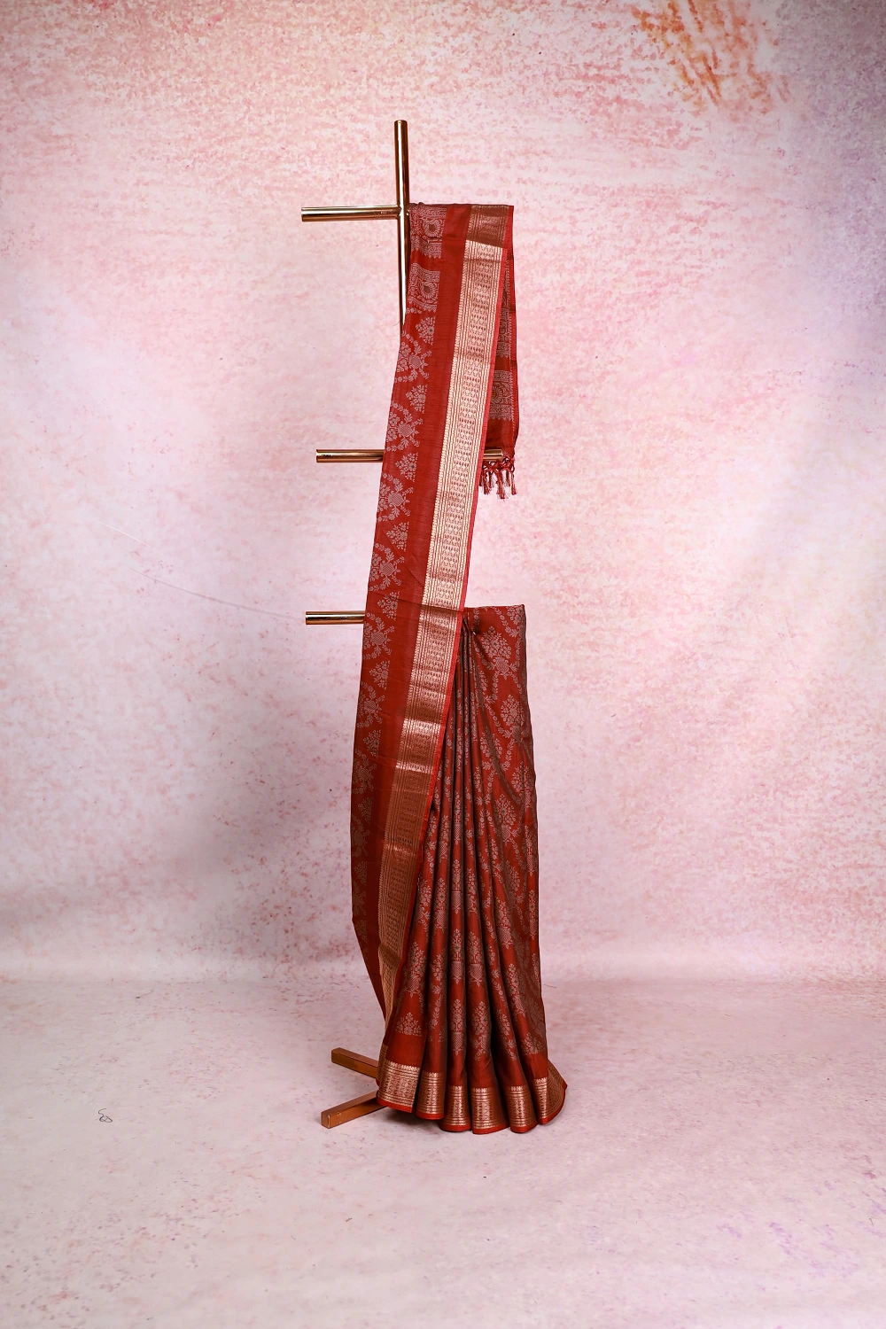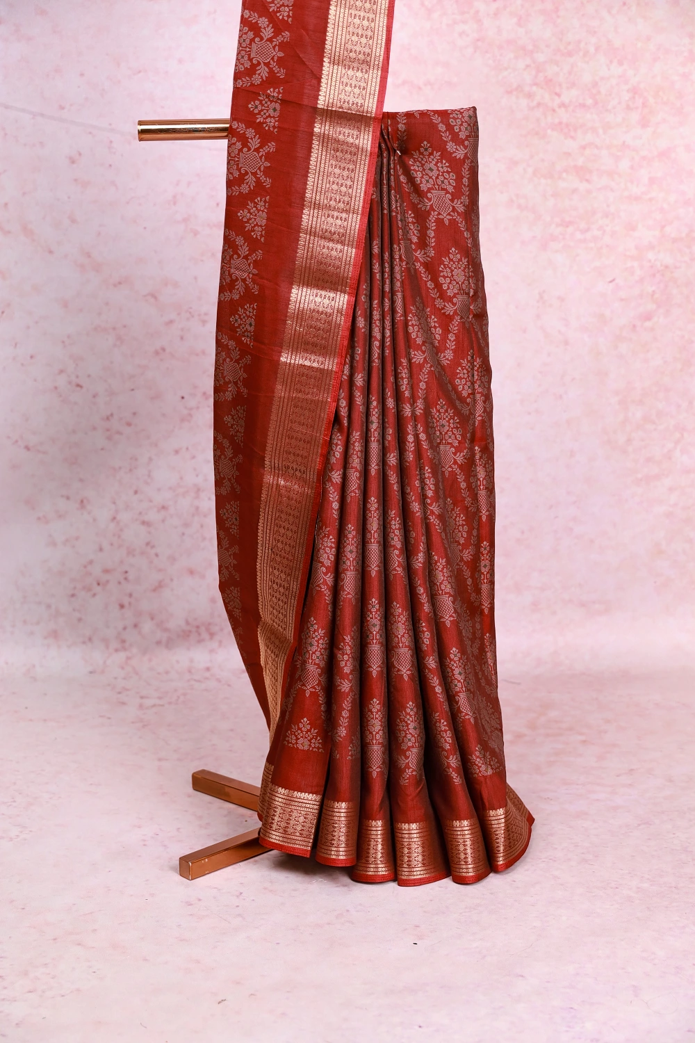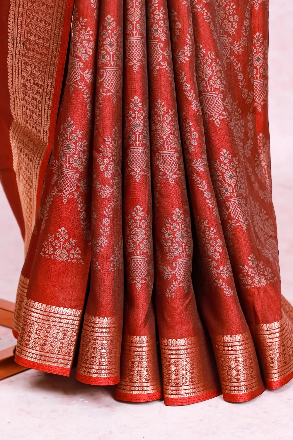 Red Semi Chanderi Printed Saree with Zari Border. Includes Unstitched Blouse