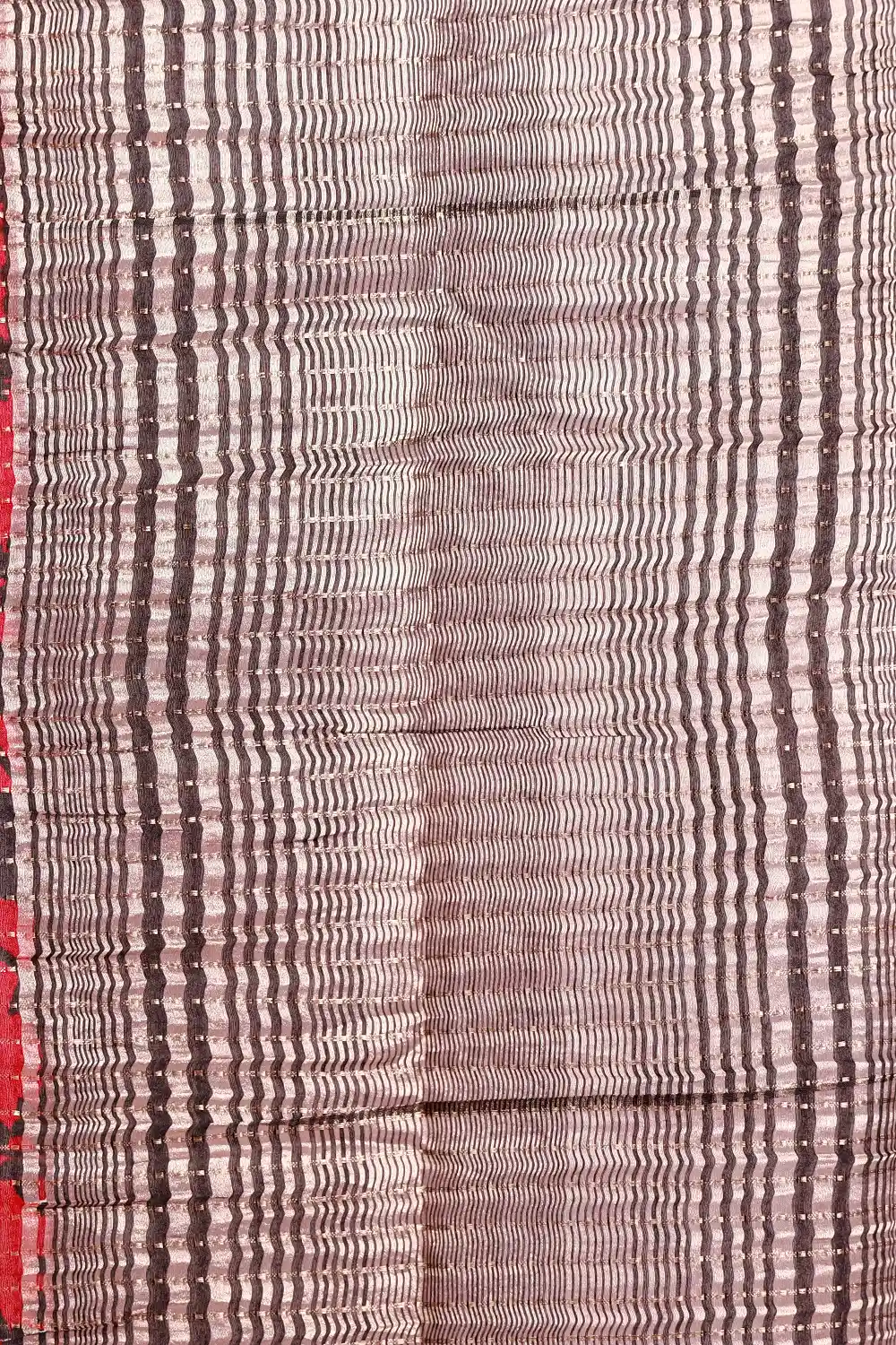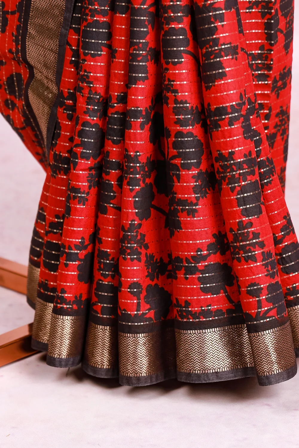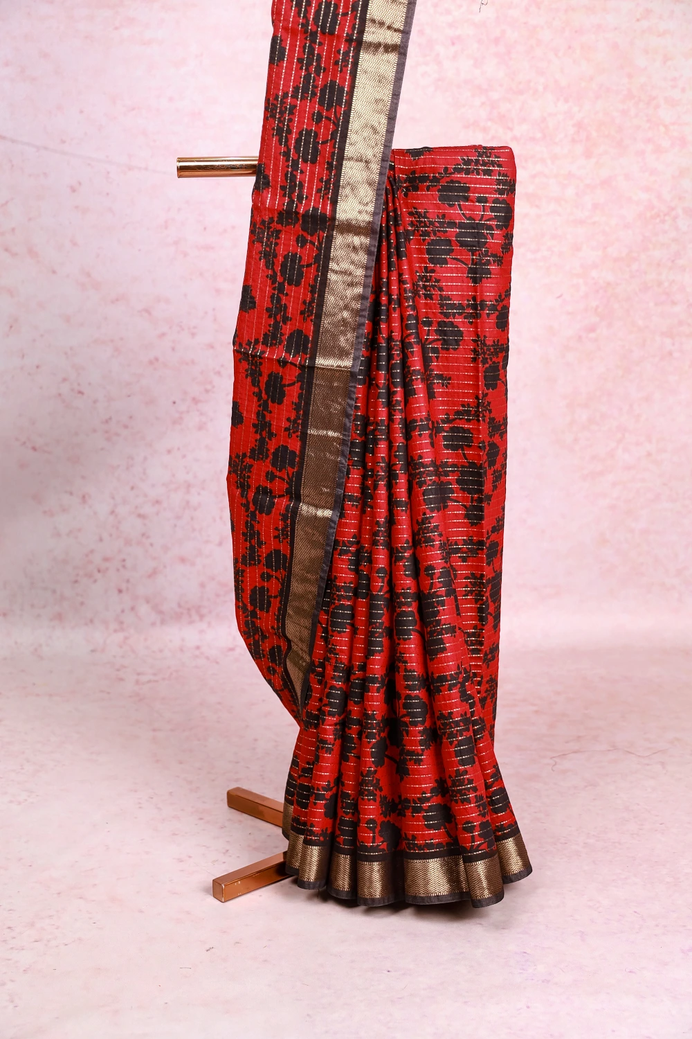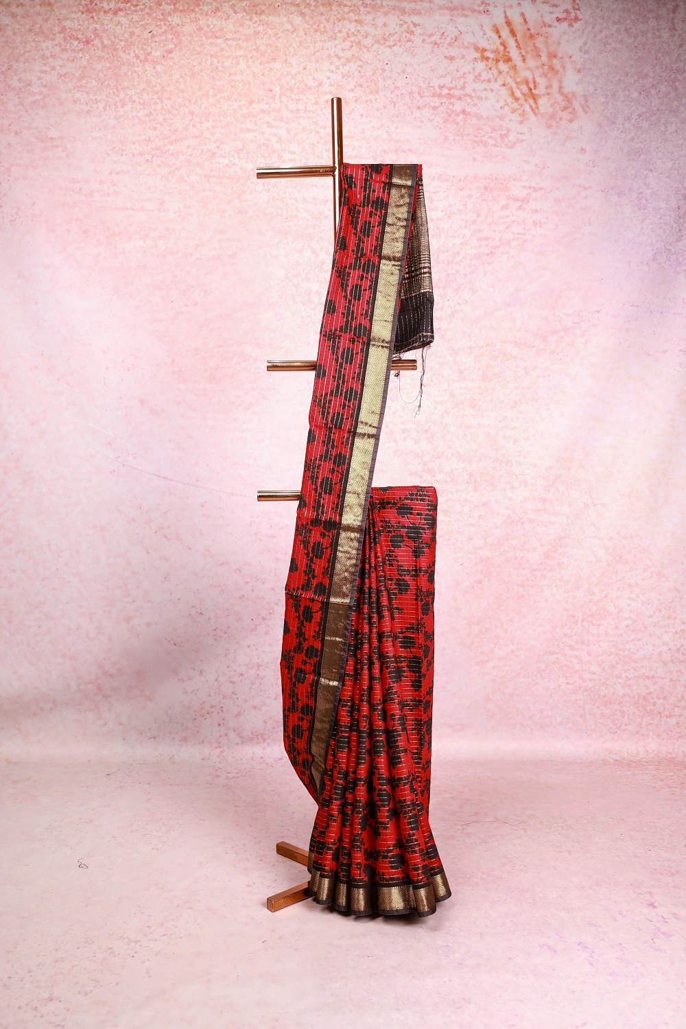 Red Semi Chanderi Printed Saree with Golden Border. Includes Unstitched Blouse