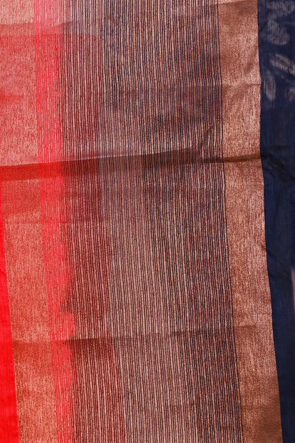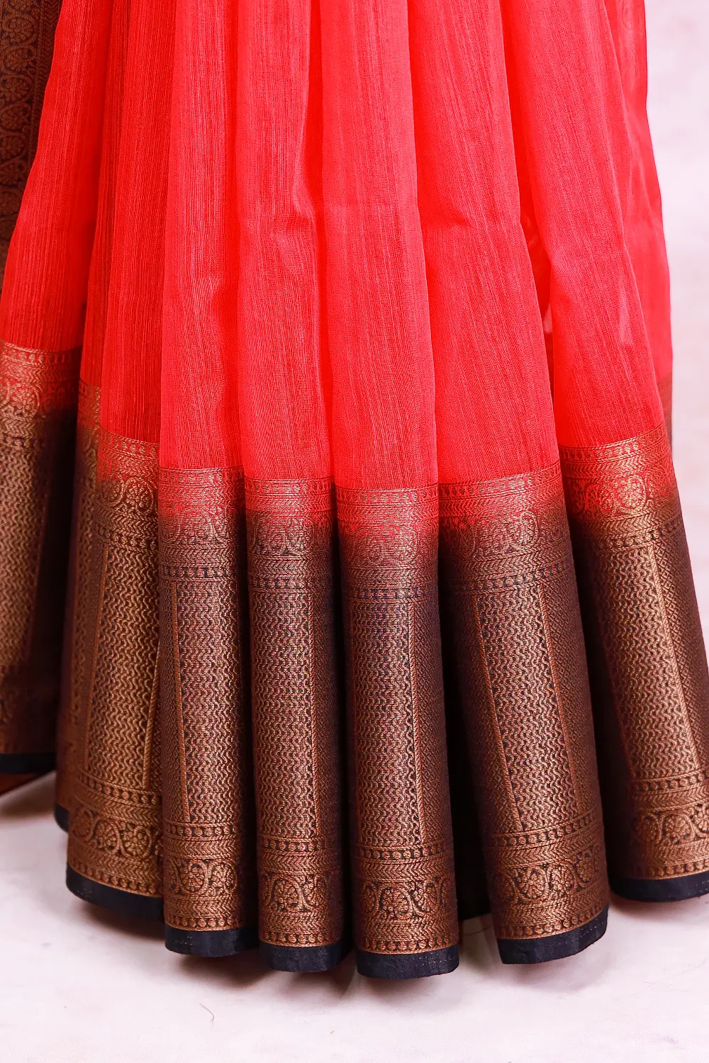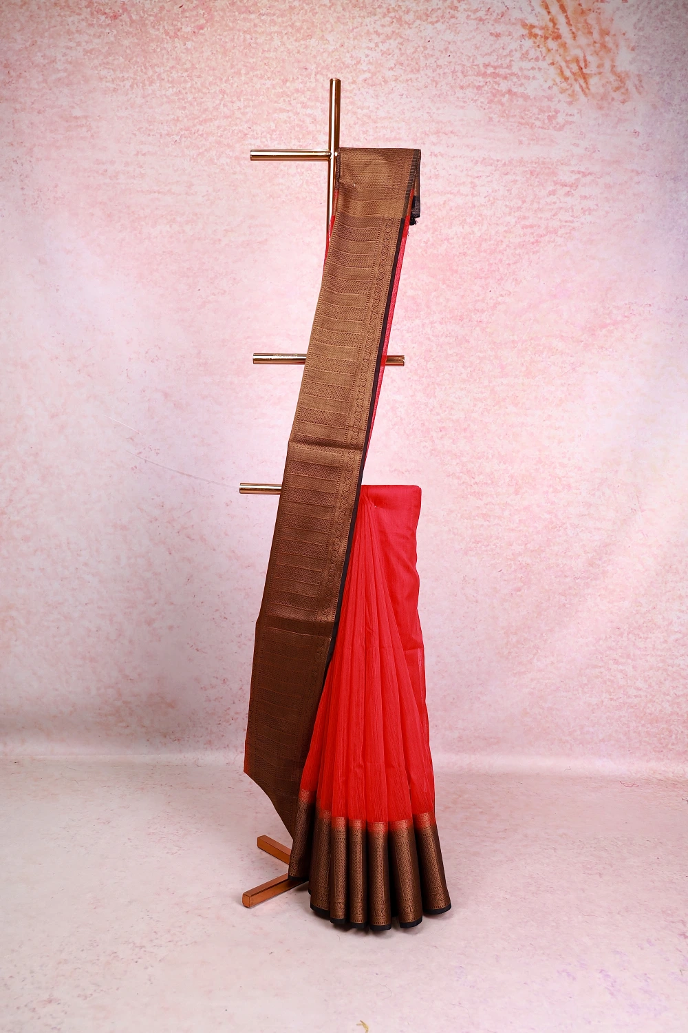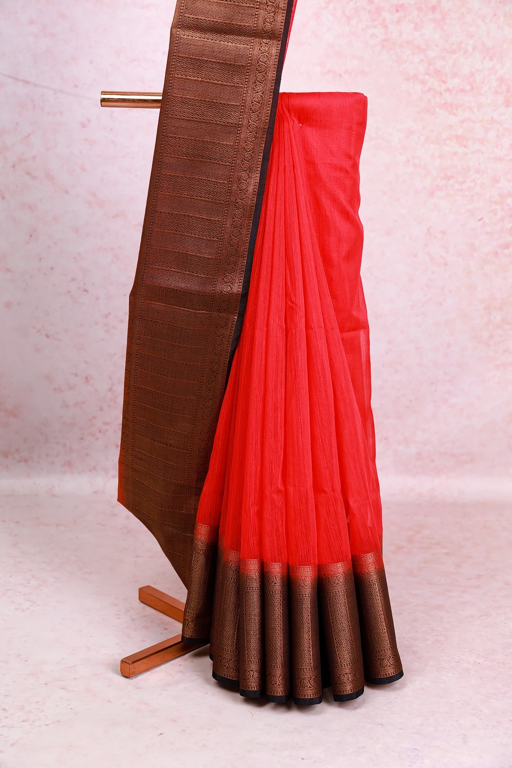 Red Semi Jute Plain Body Saree with Copper Border. Includes Unstitched Blouse