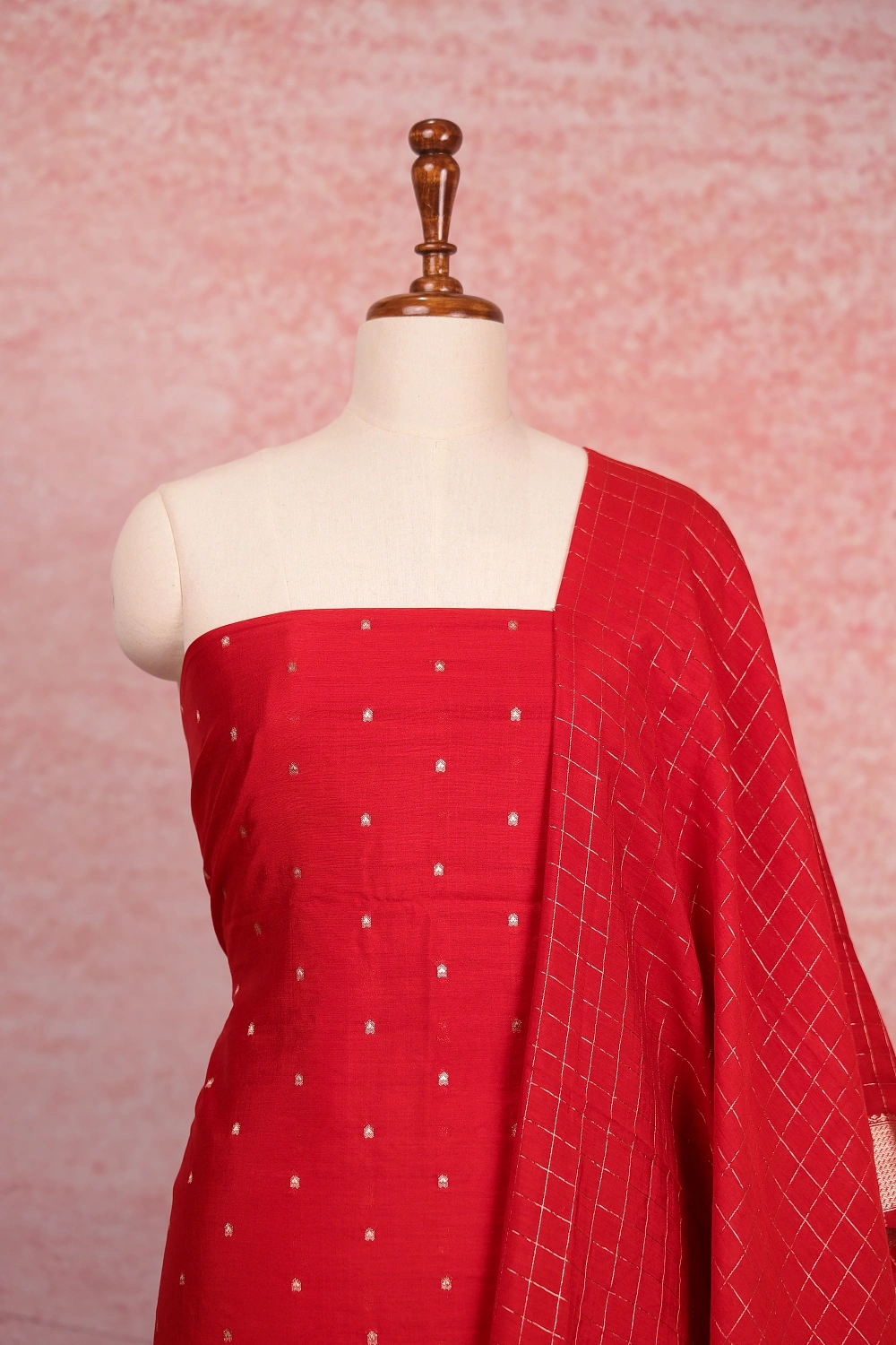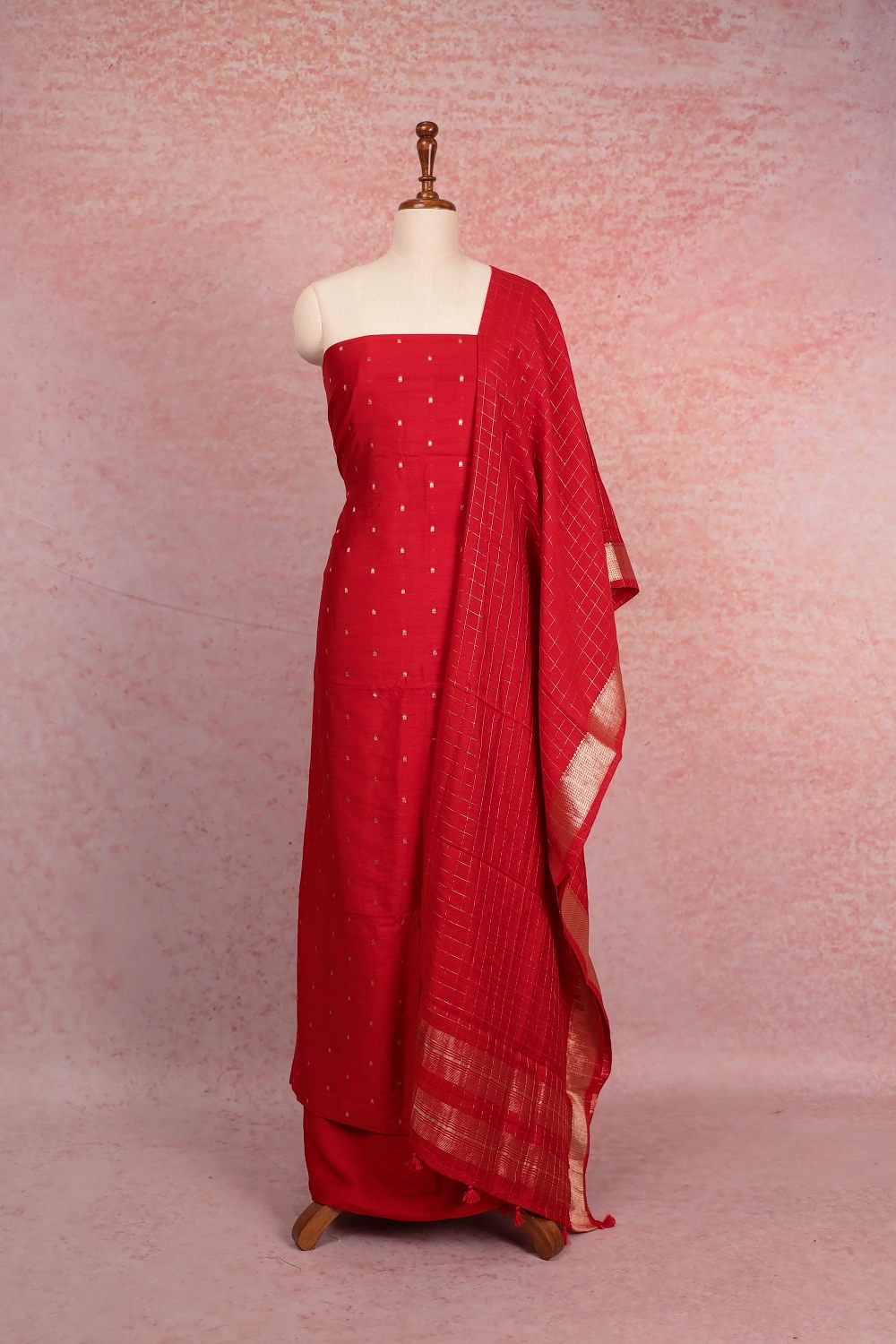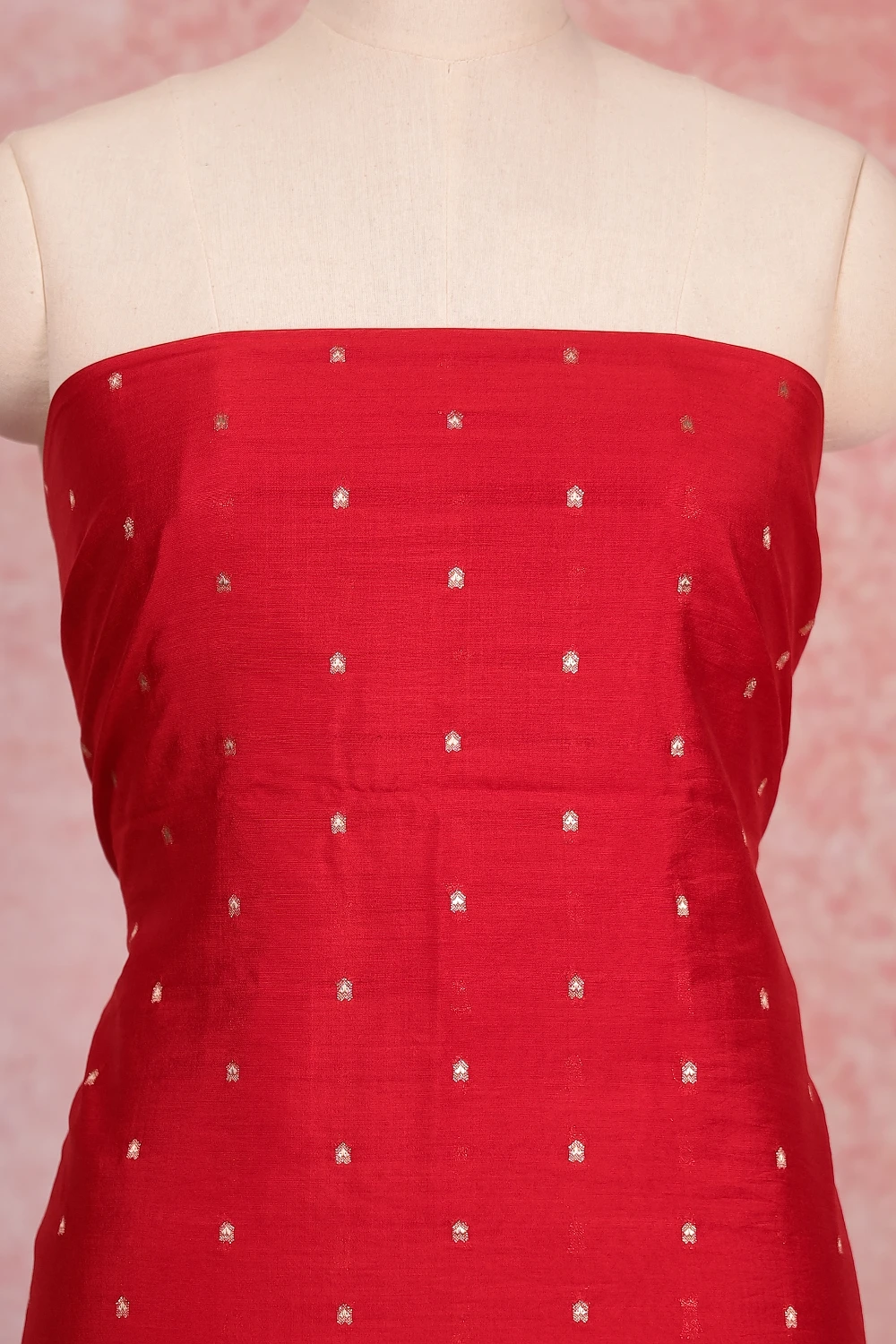 Red Semi Silk Banarasi Design Unstitched Churidar Material. Includes Dupatta.