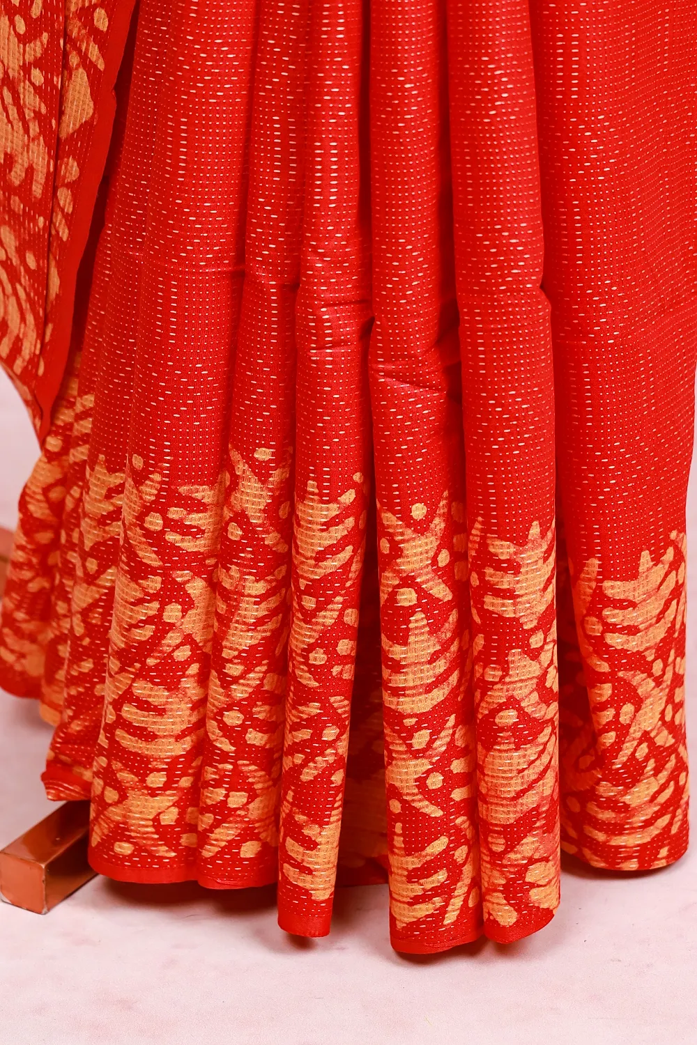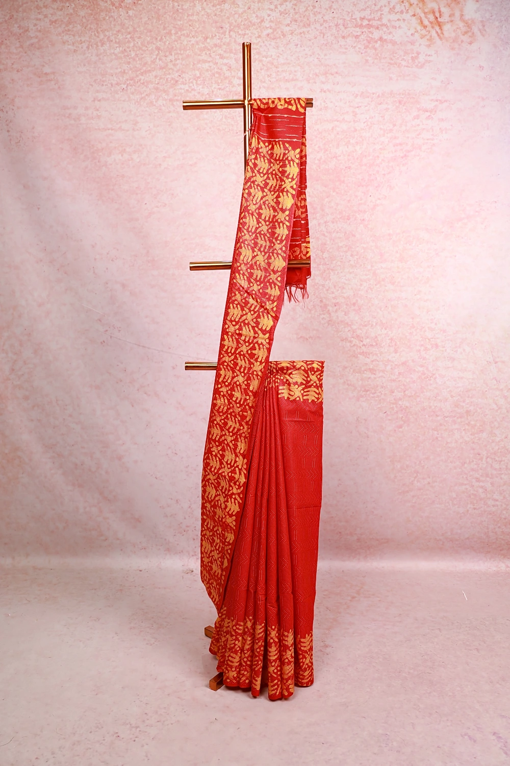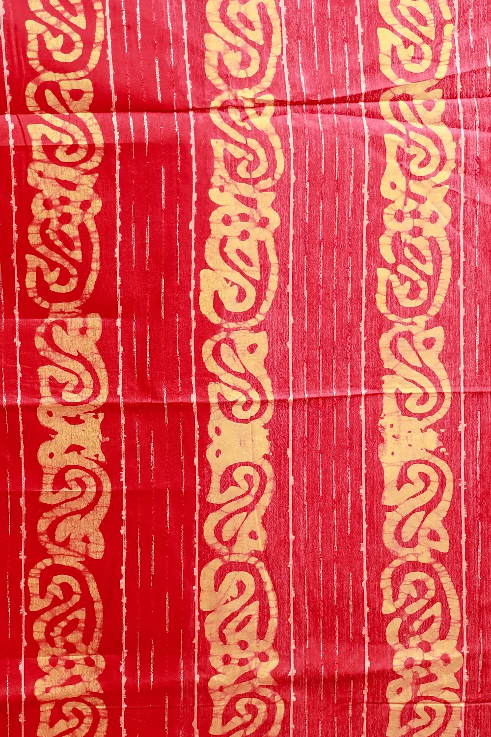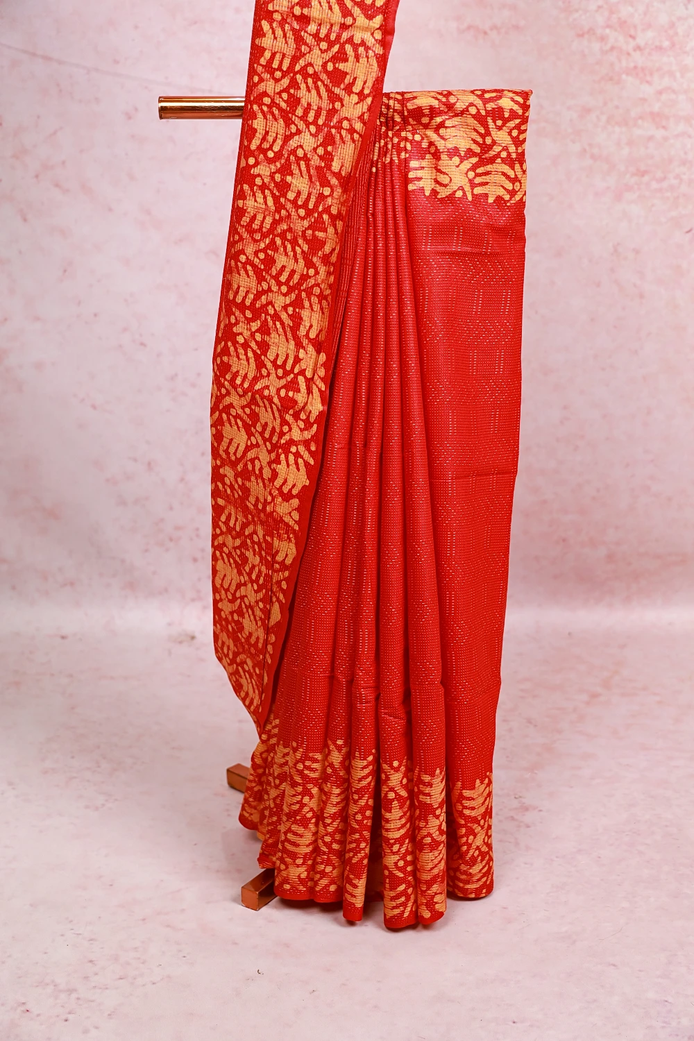 Red Semi Tussar Thread Design Saree With Bathik Border. Includes Unstitched Blouse