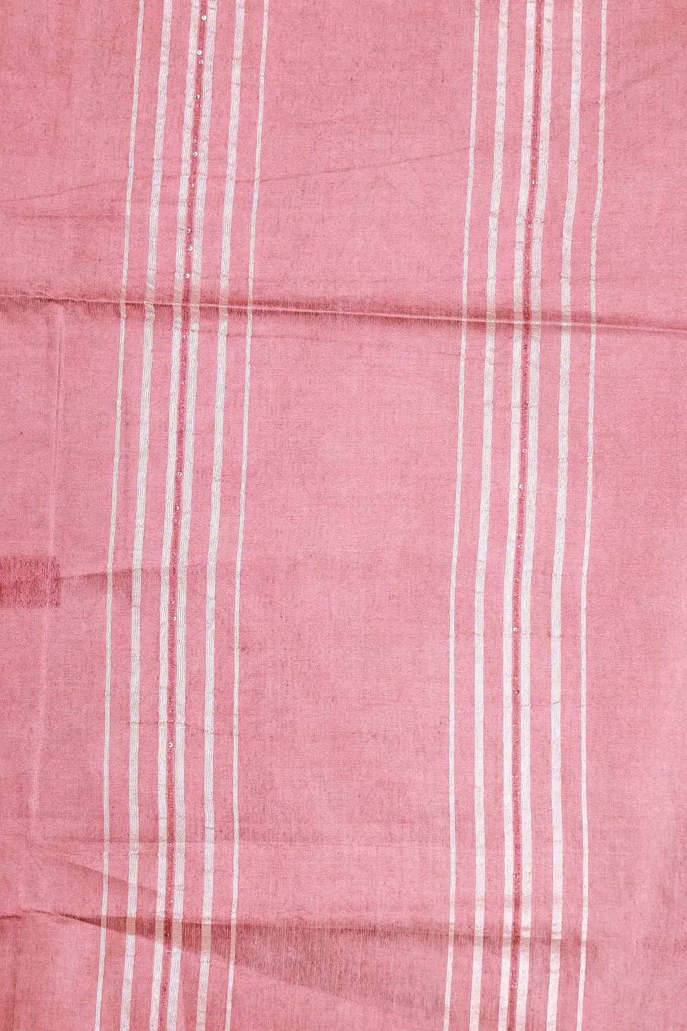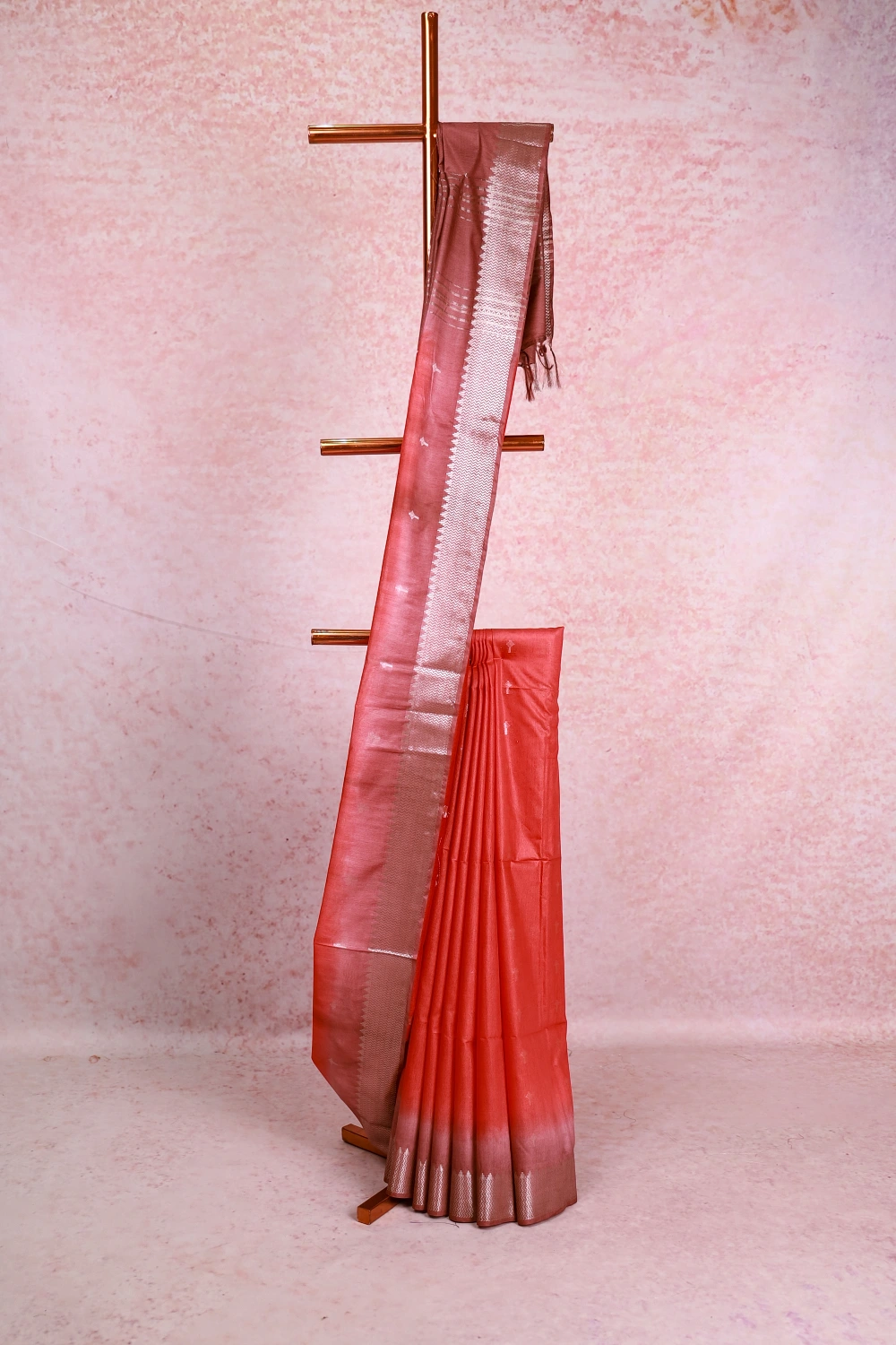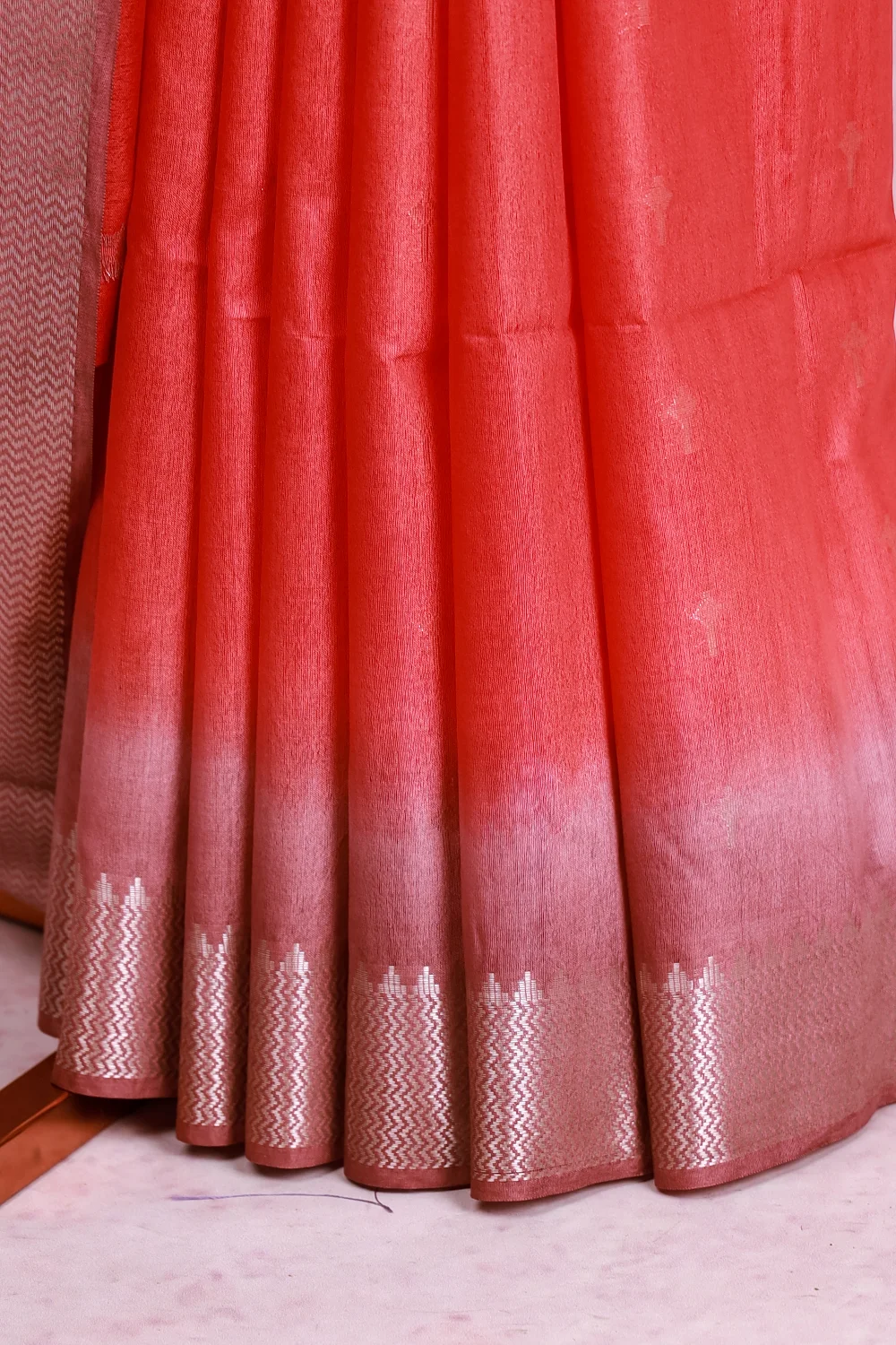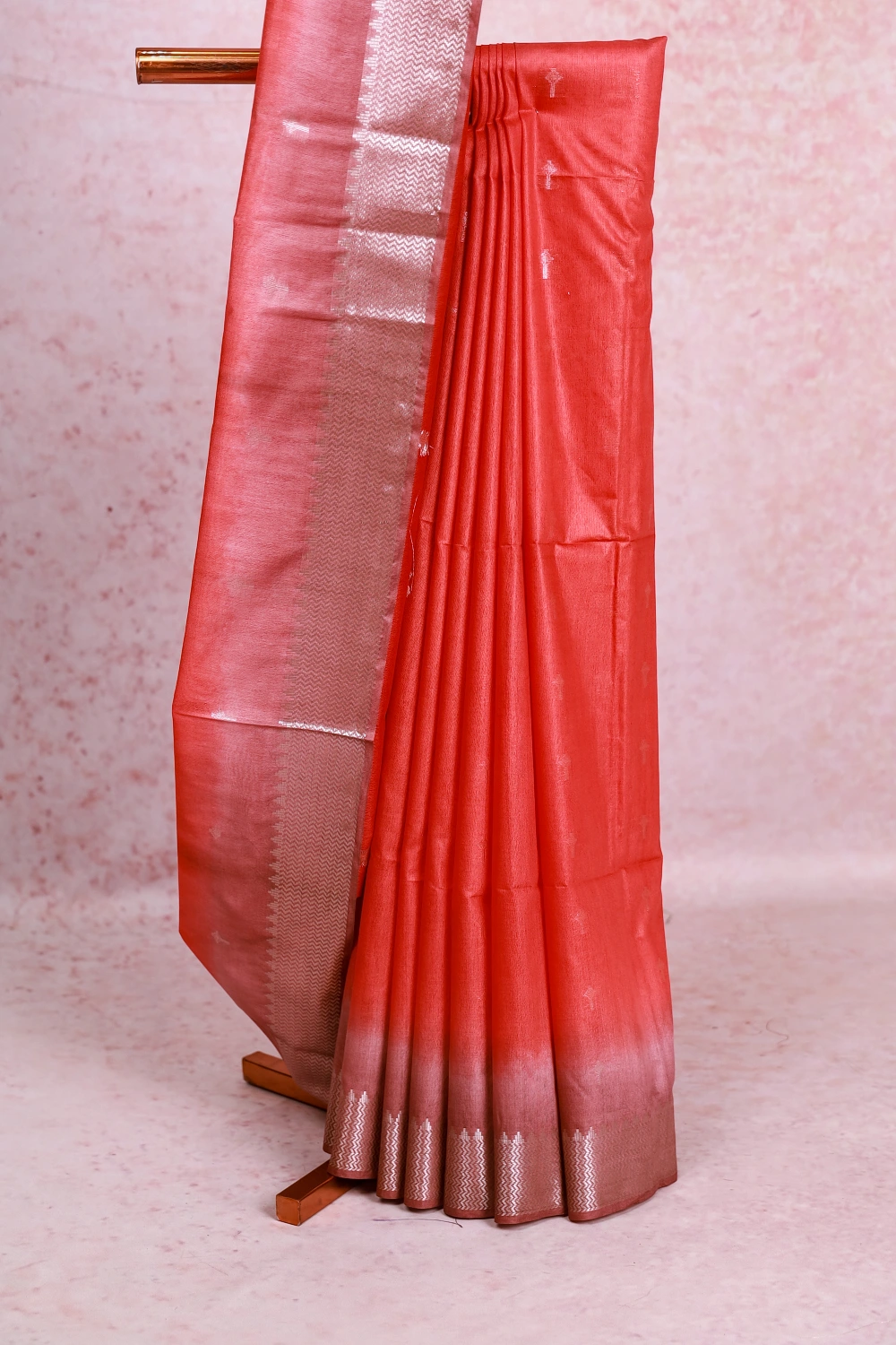 Reddish Orange Semi Tussar Small Butta Saree SilverBorder. Includes Un Stitched Blouse
