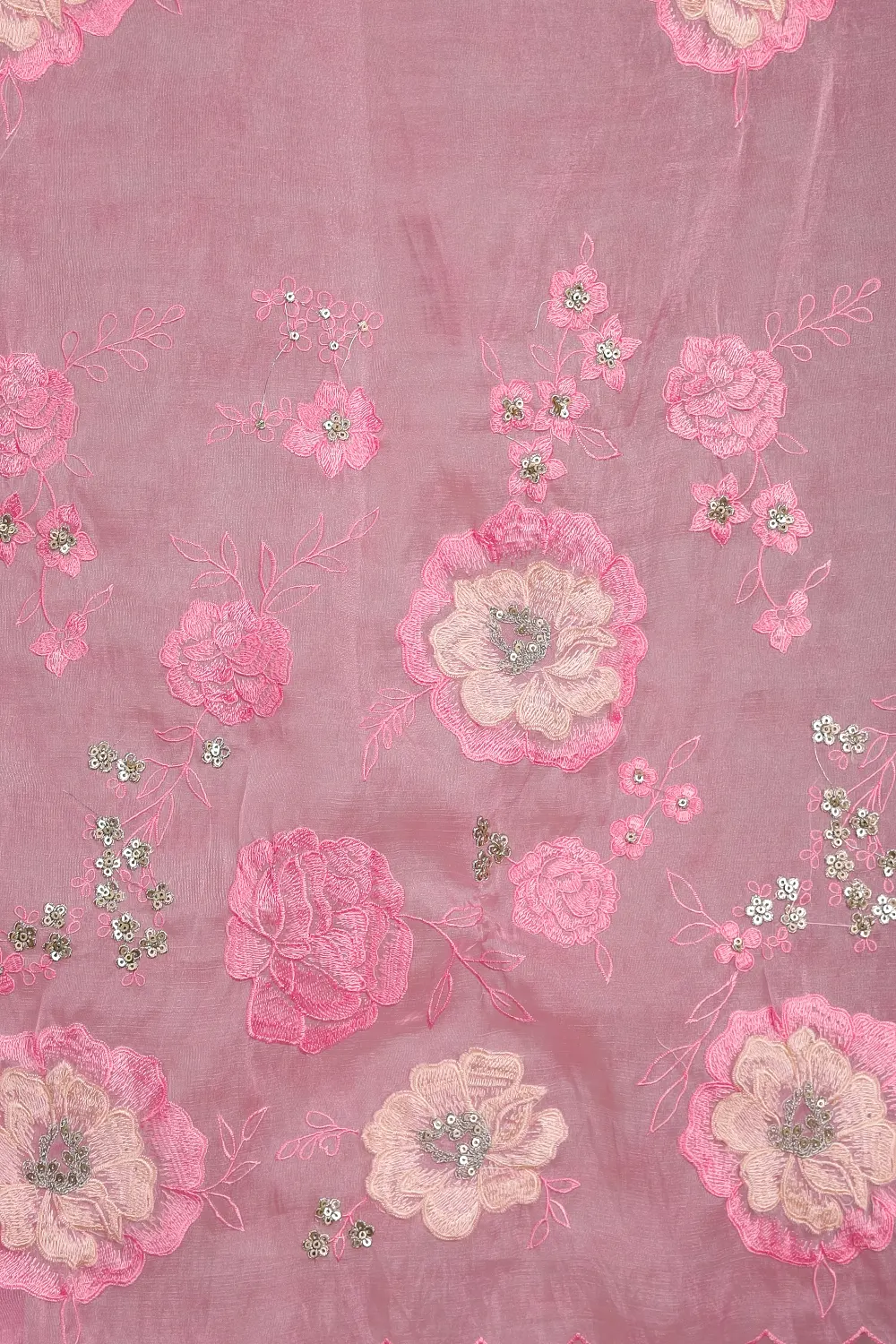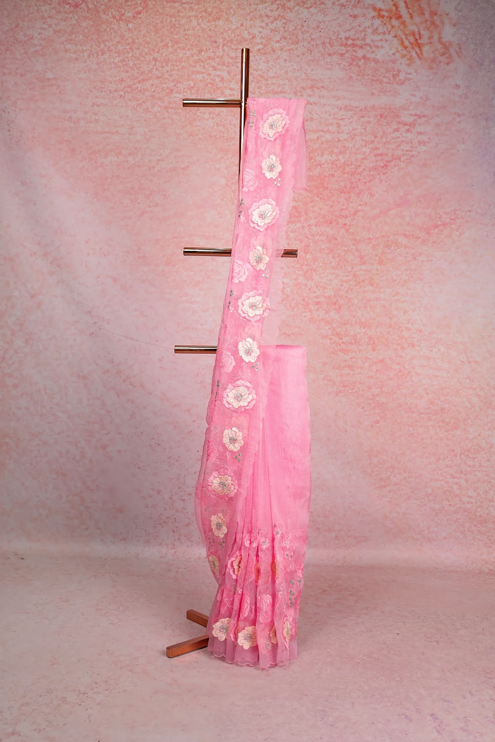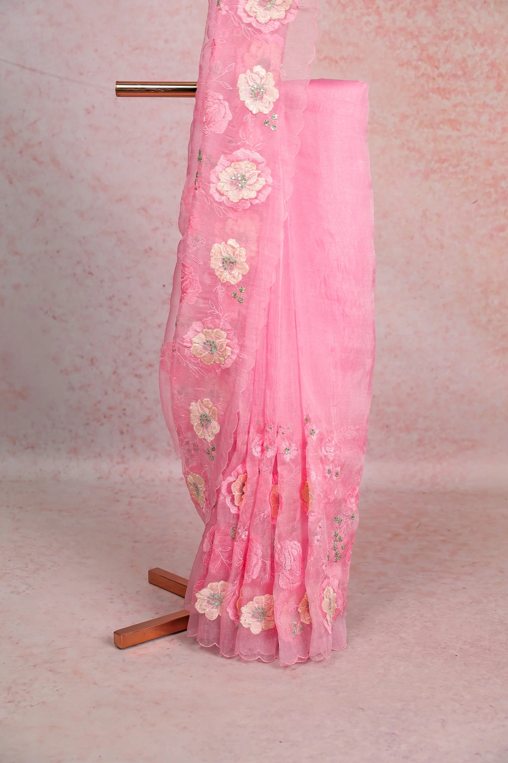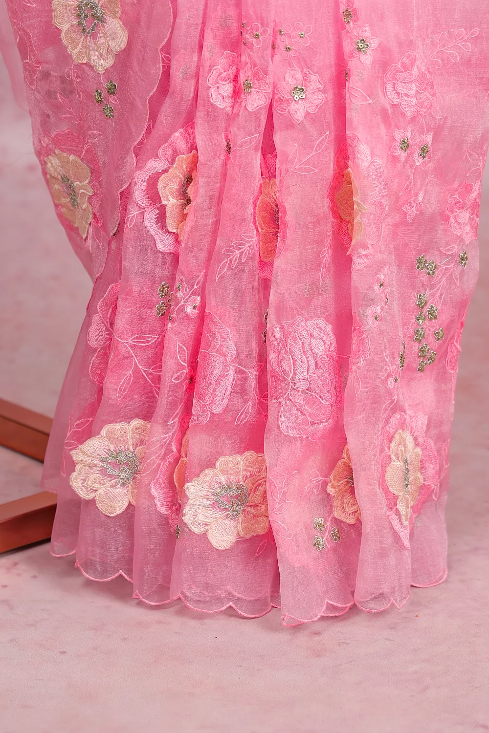Rose Organza Thread And Sequines Work Saree with Scallop Border. Includes Unstitched Blouse