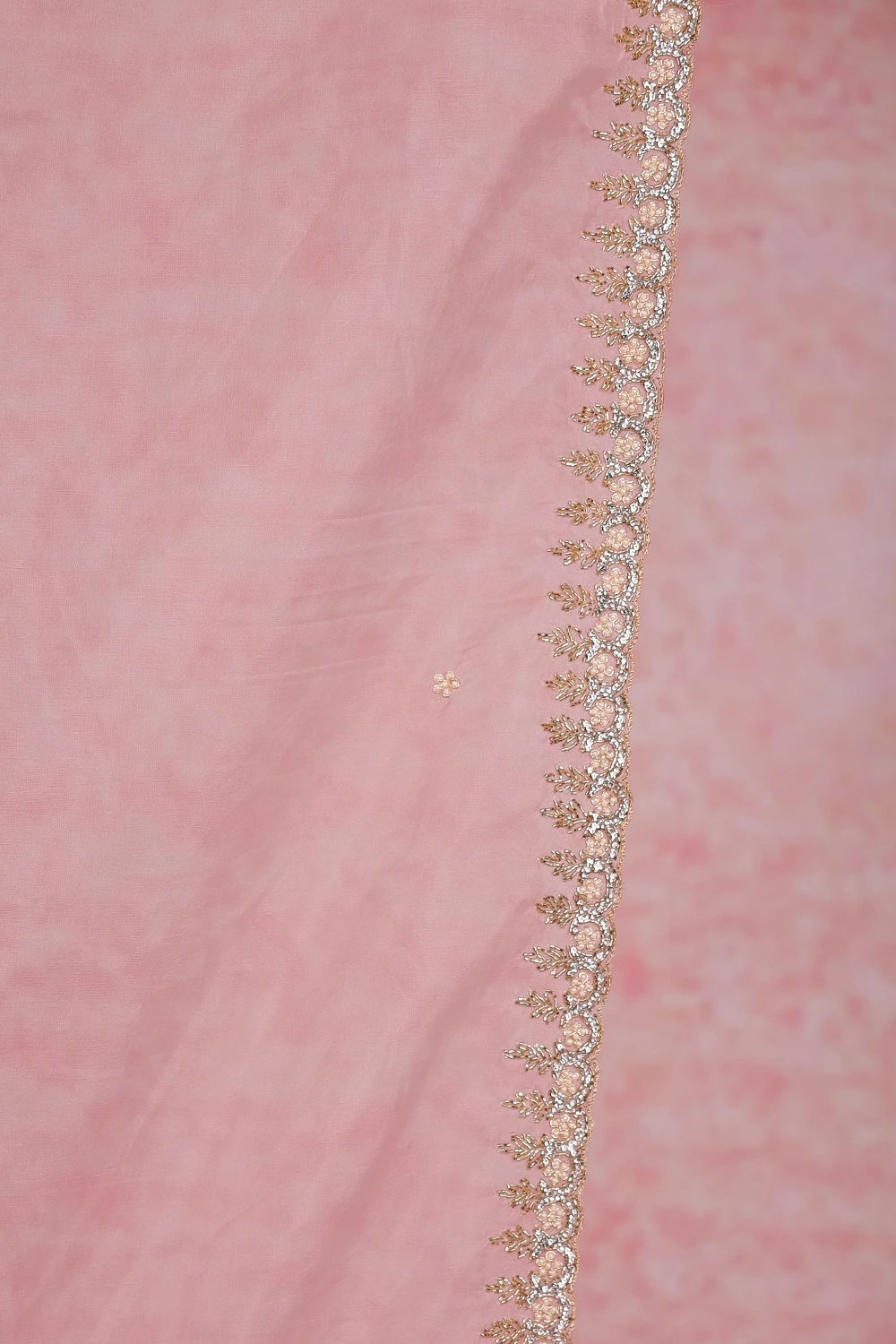 Rose Color Organza Preal Work Saree with Scalp Border. Includes Unstitched Blouse