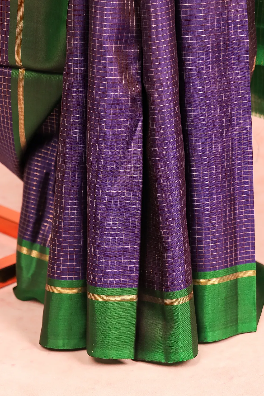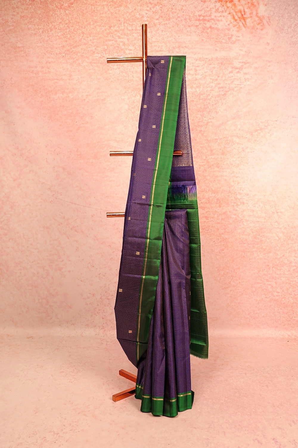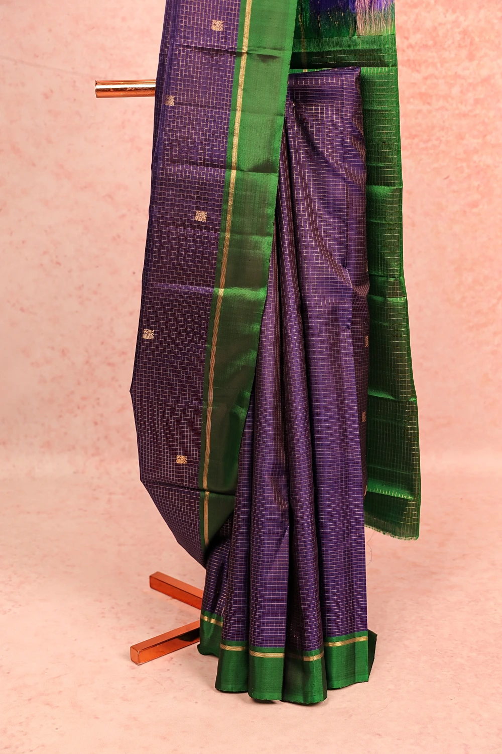 Royal Blue Kancheepuram Check With Butta Saree with Plain Border. Includes Unstitched Blouse