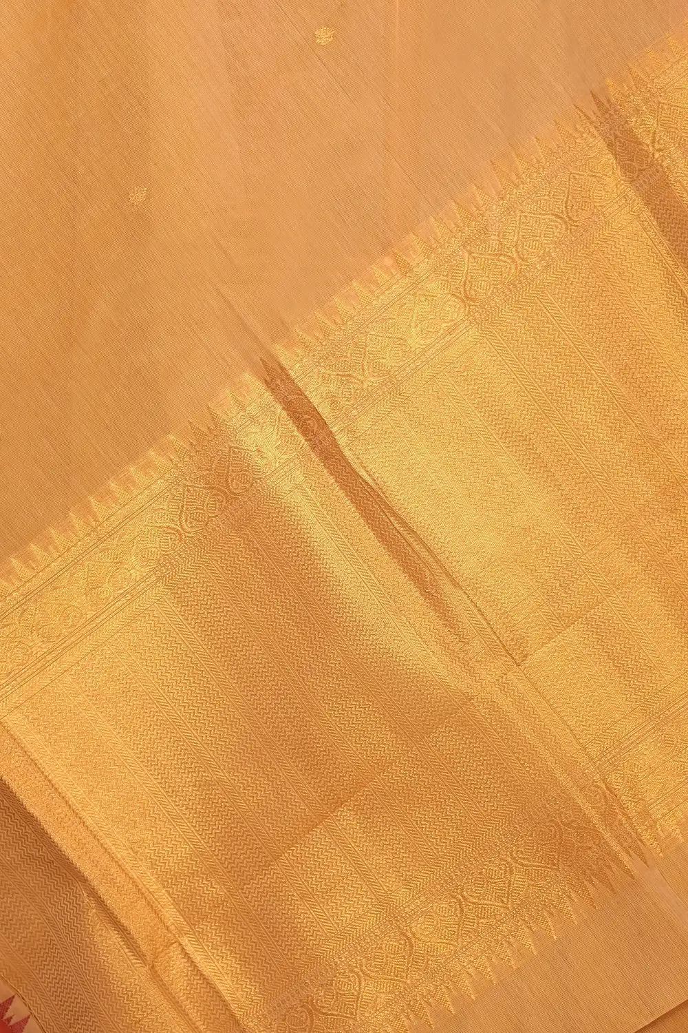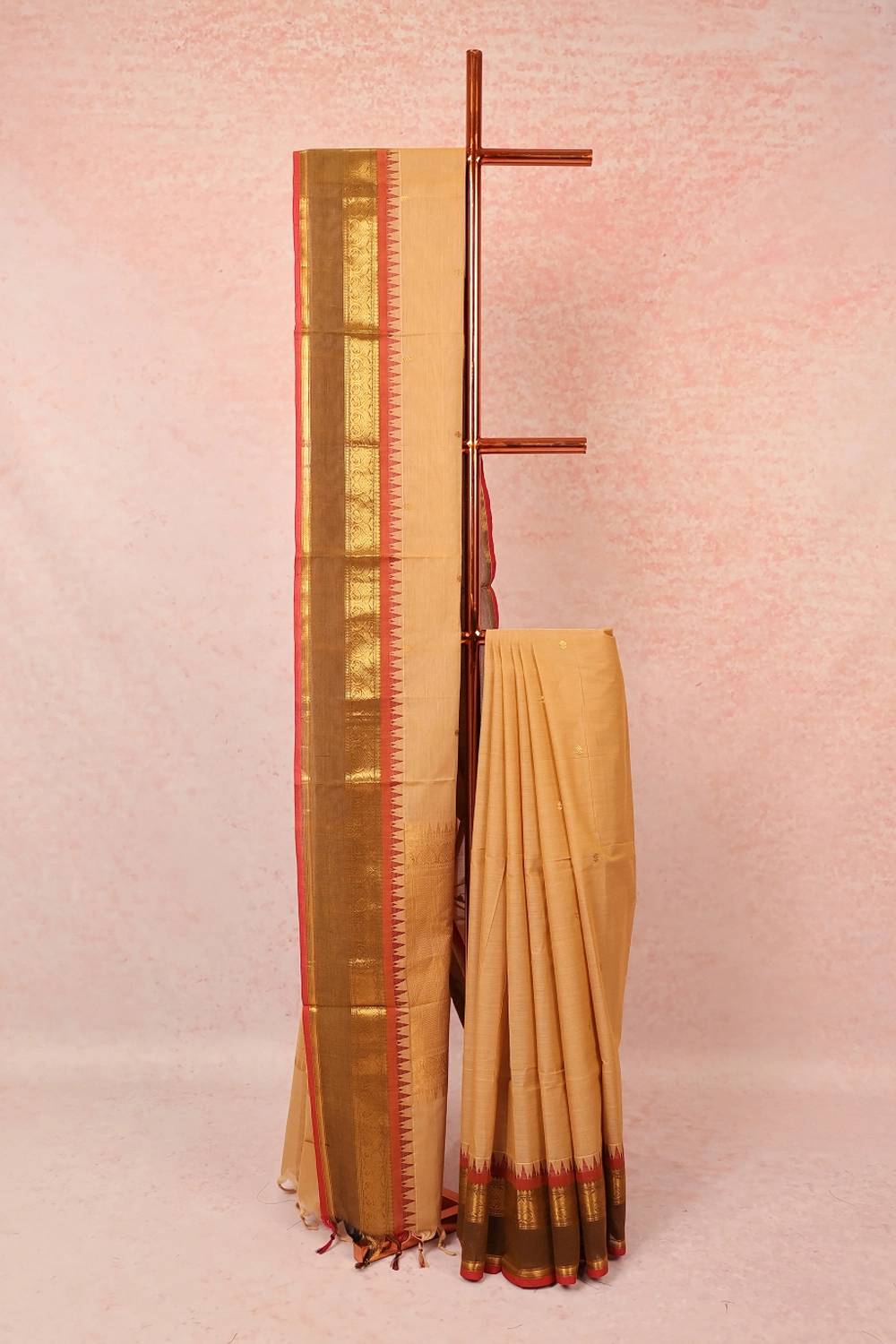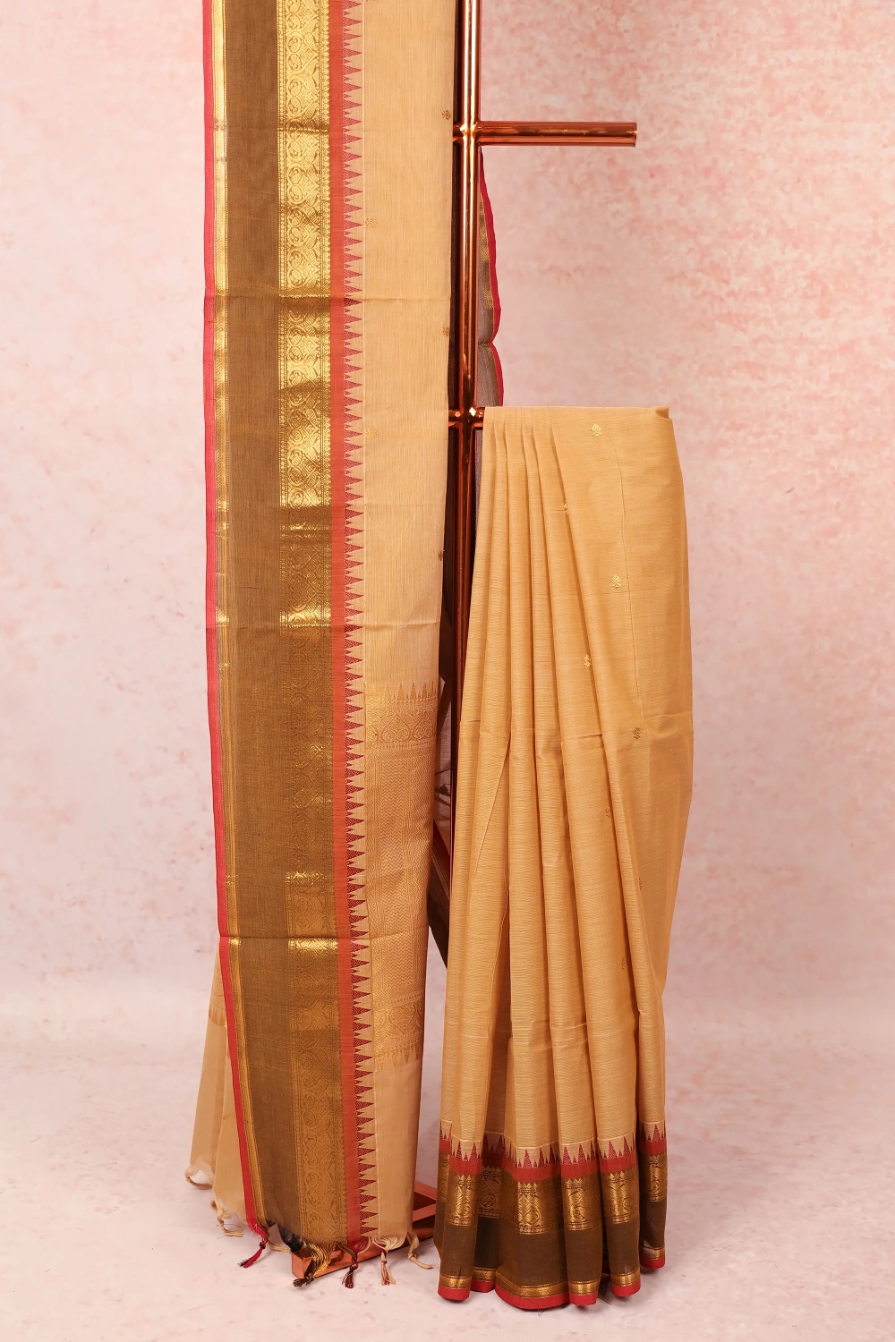Sandal Cotton Butta Saree with Temple border. Includes Un Stitched Blouse