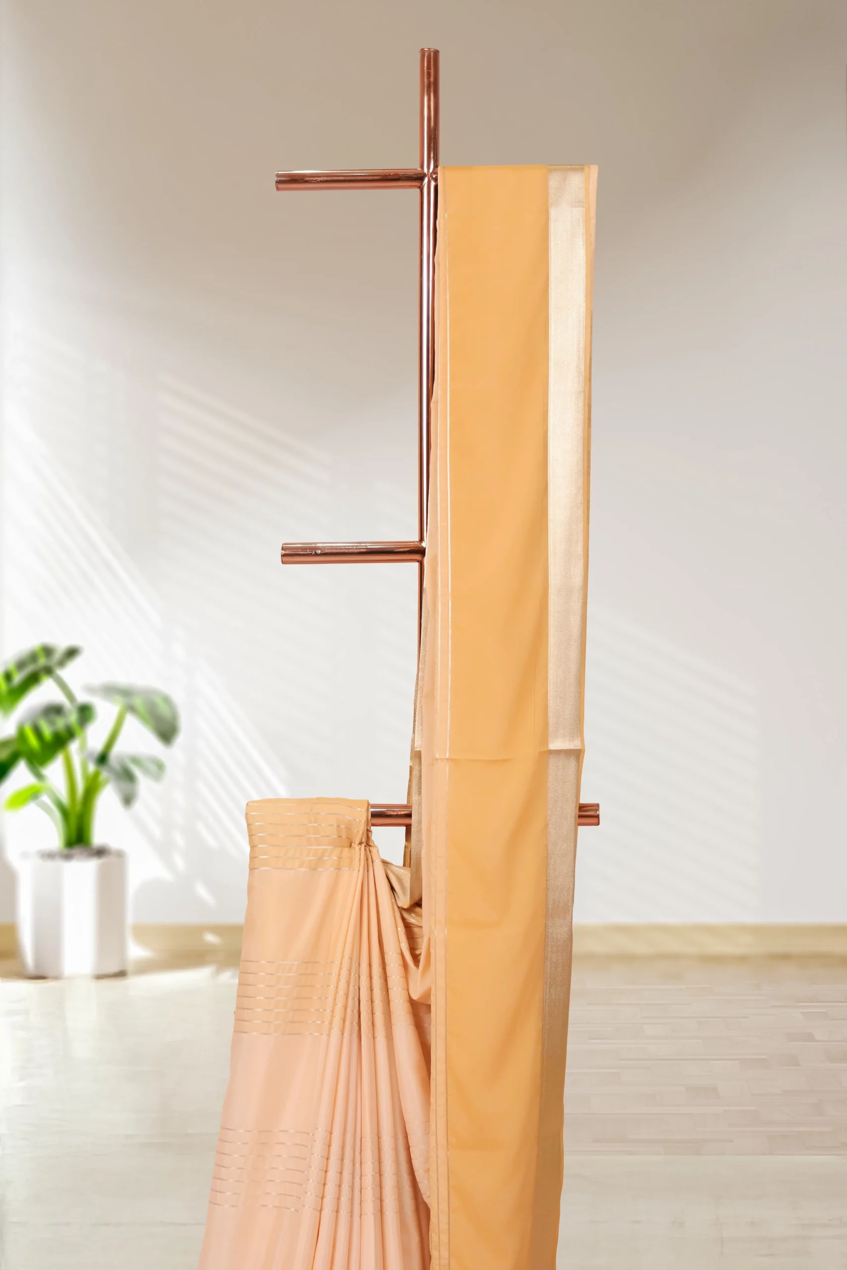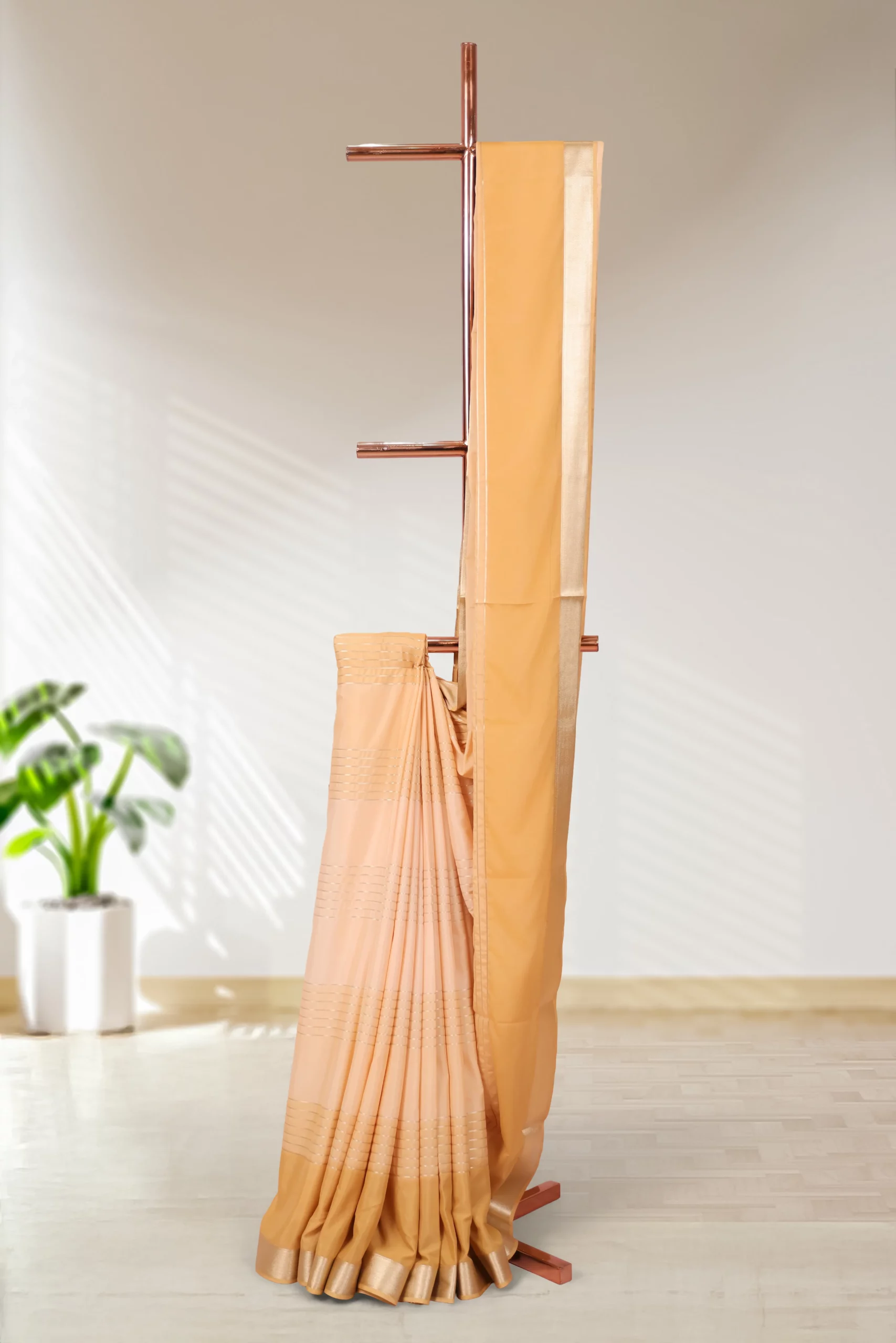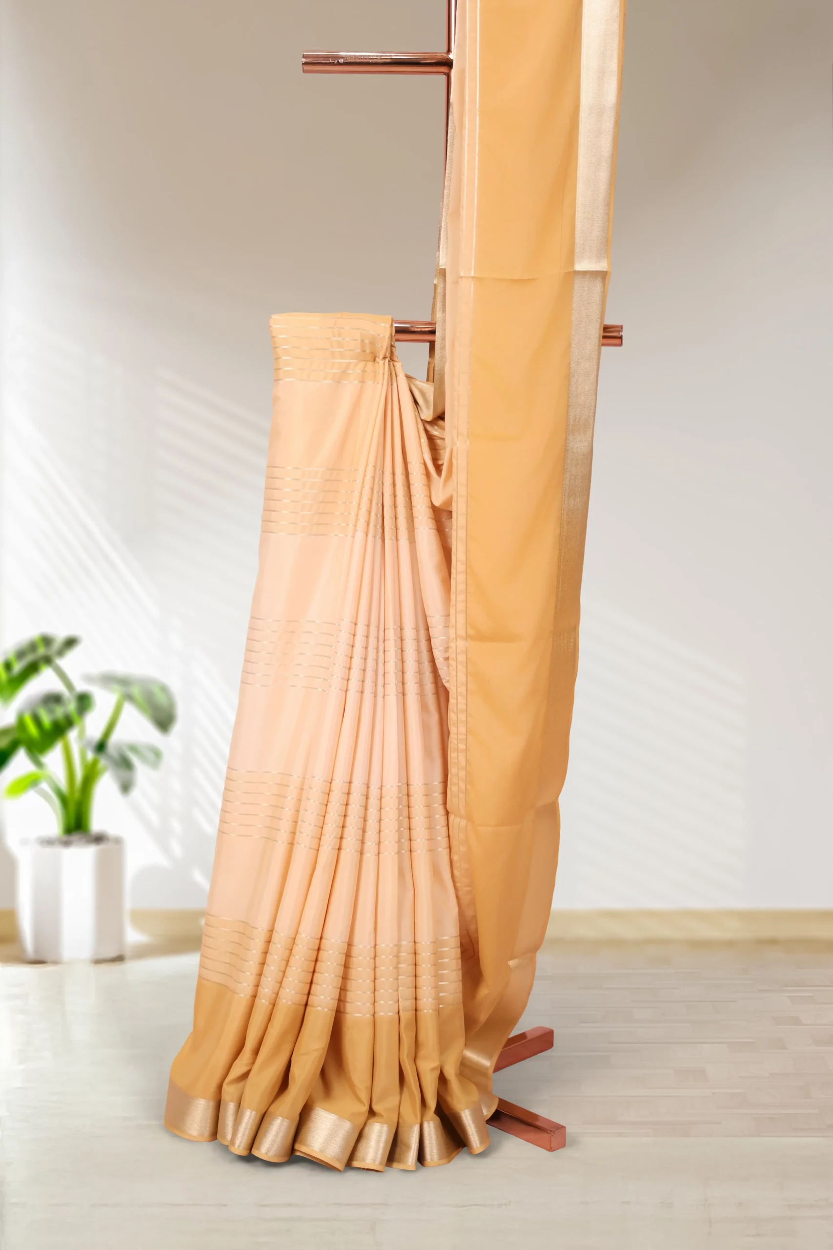Sandal Satin Lines Saree with Golden border. Includes Unstitched Blouse