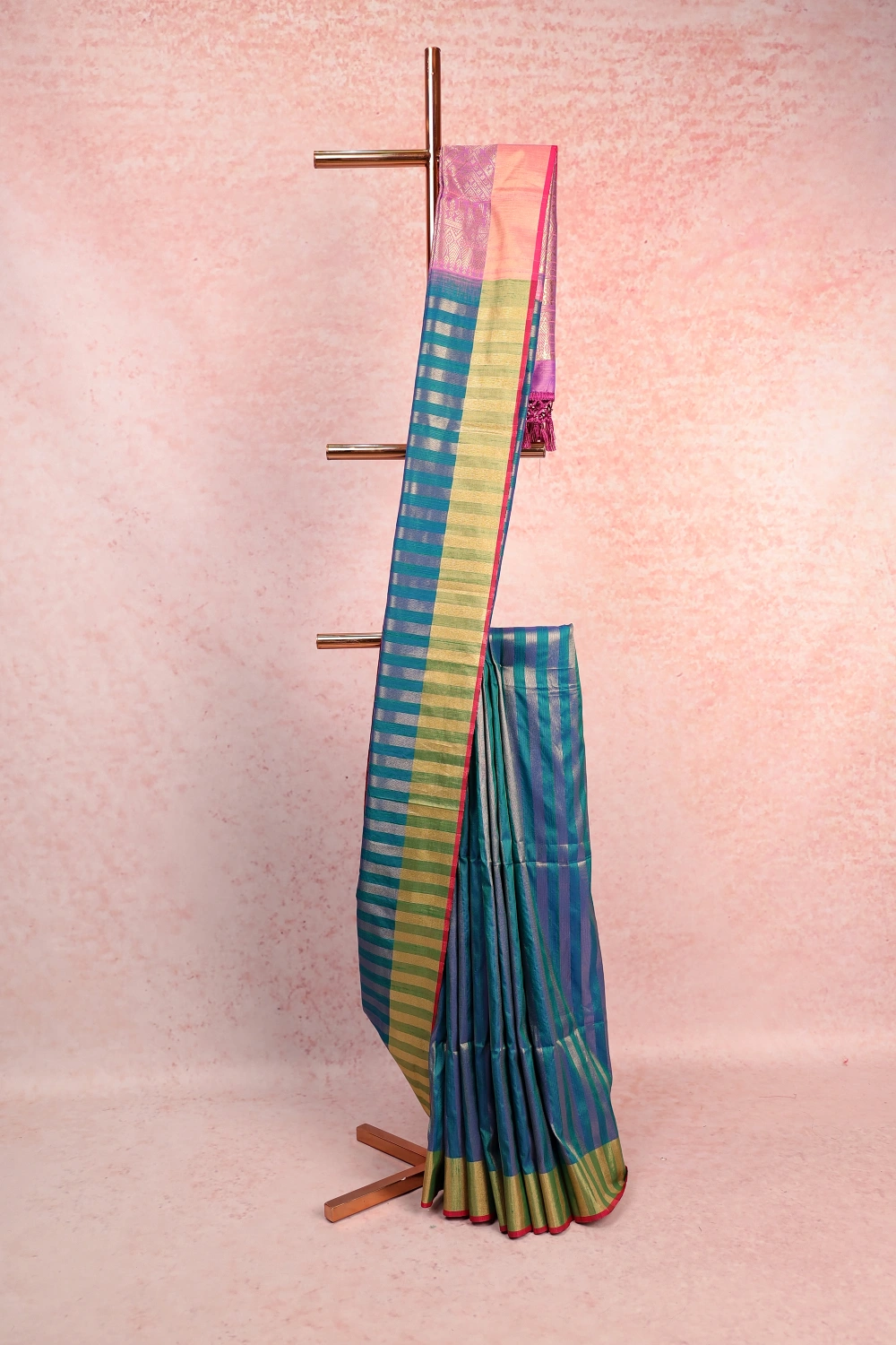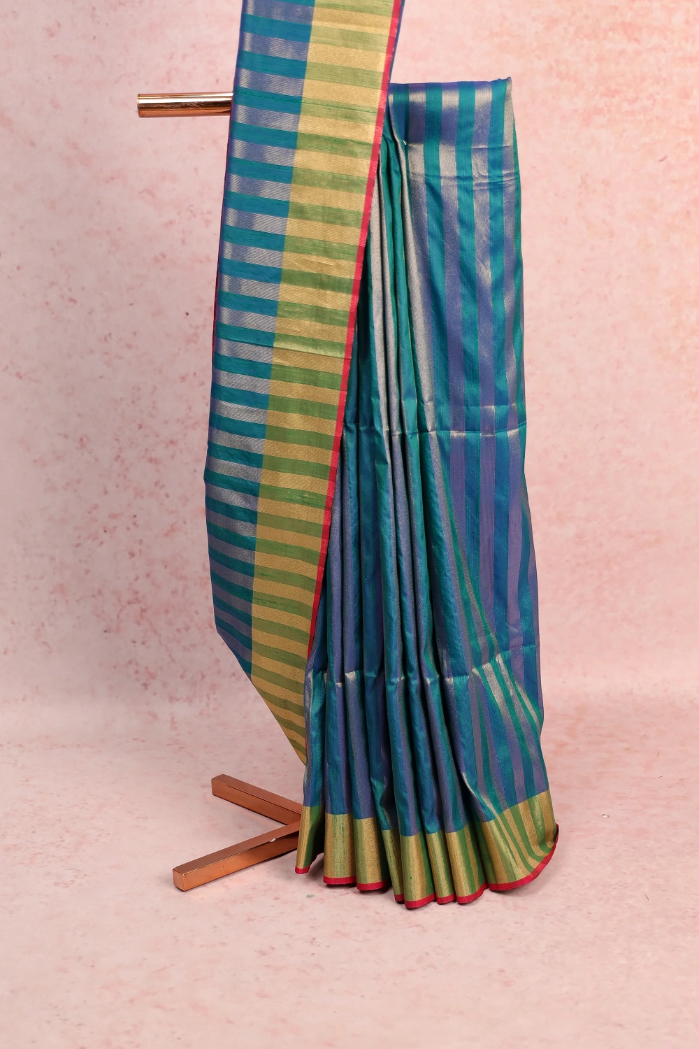 Sapphire Green Semi Jute Stripes Saree with Line Border. Includes Un stitched Blouse