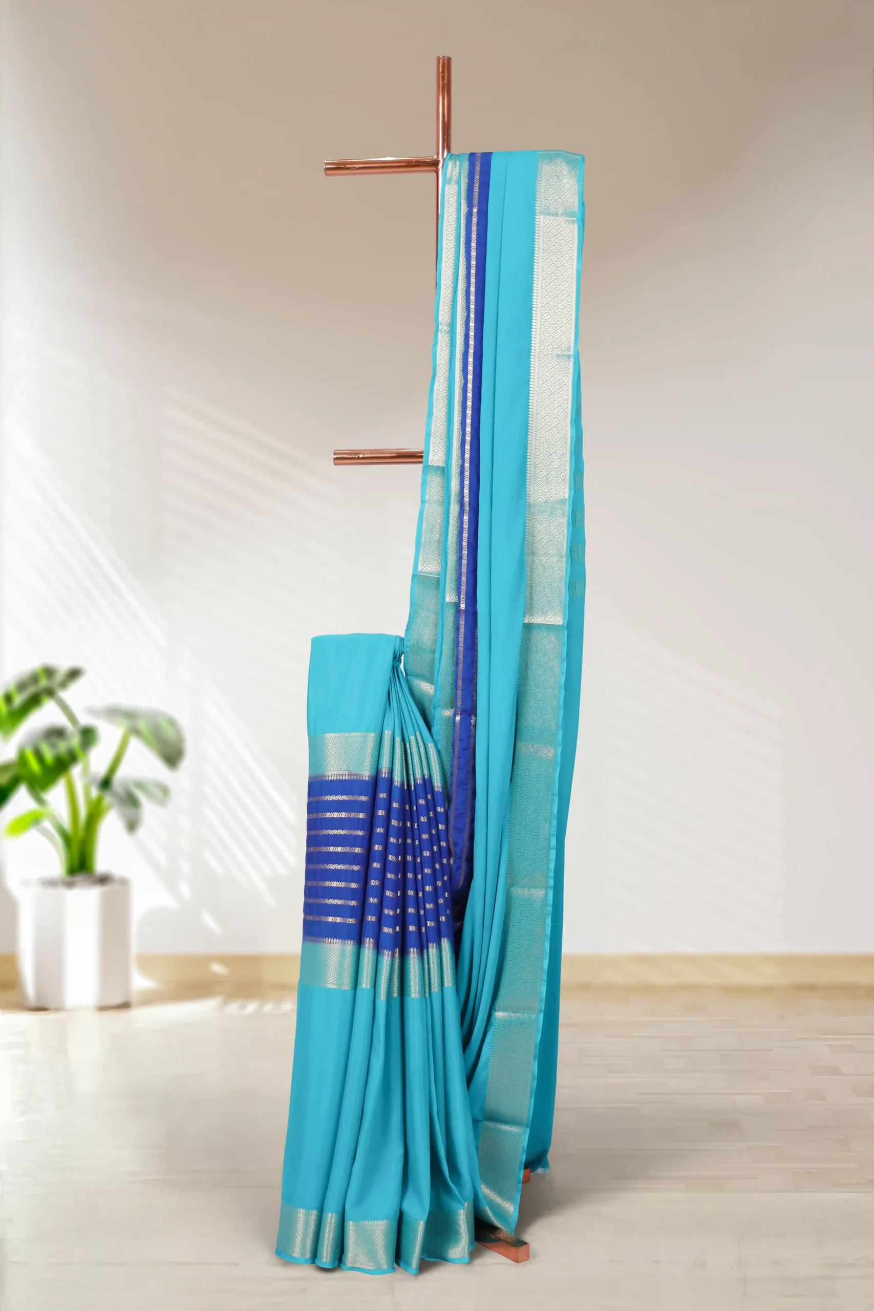 Sea Blue Georgette Lines Saree with Designer border. Includes Unstitched Blouse