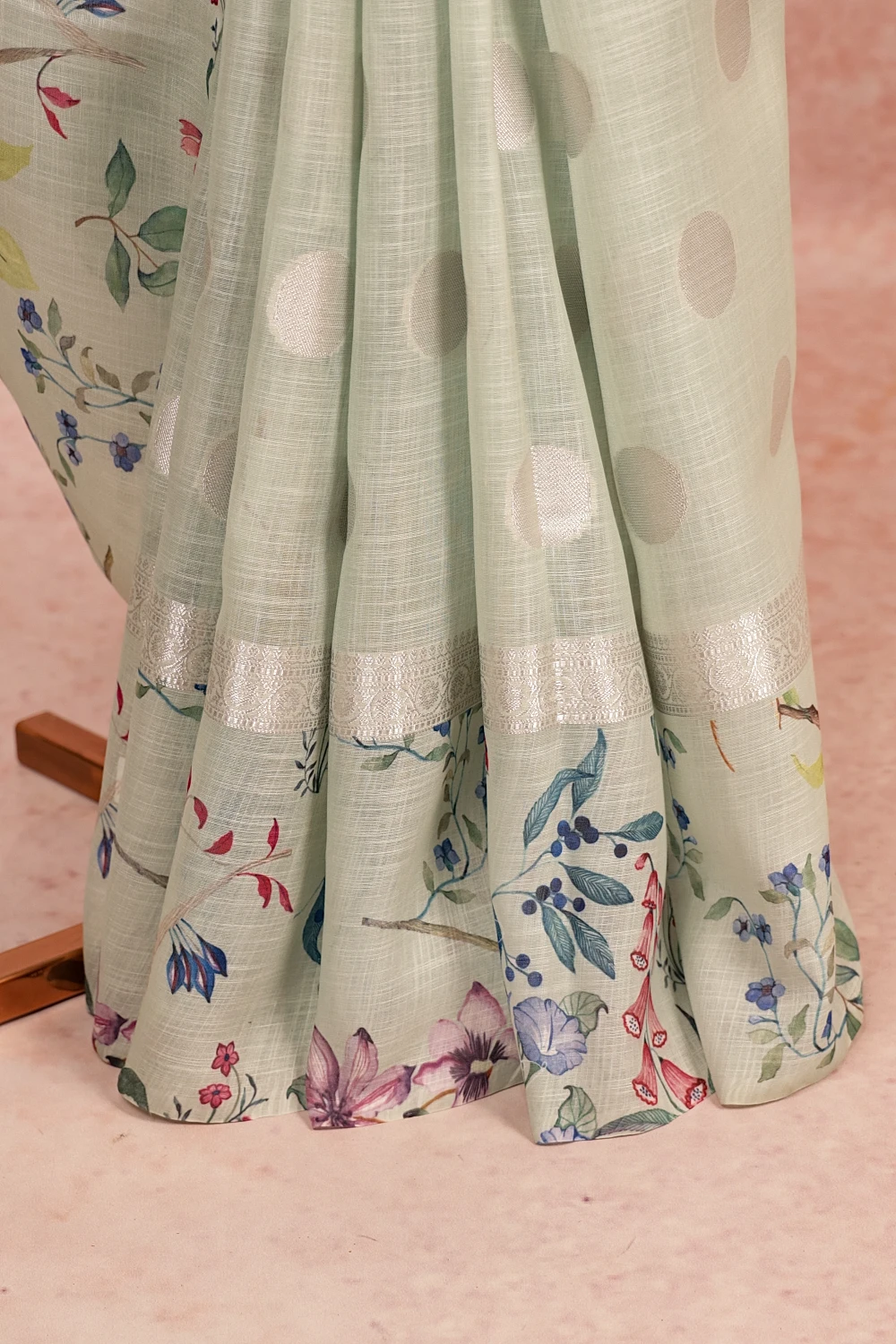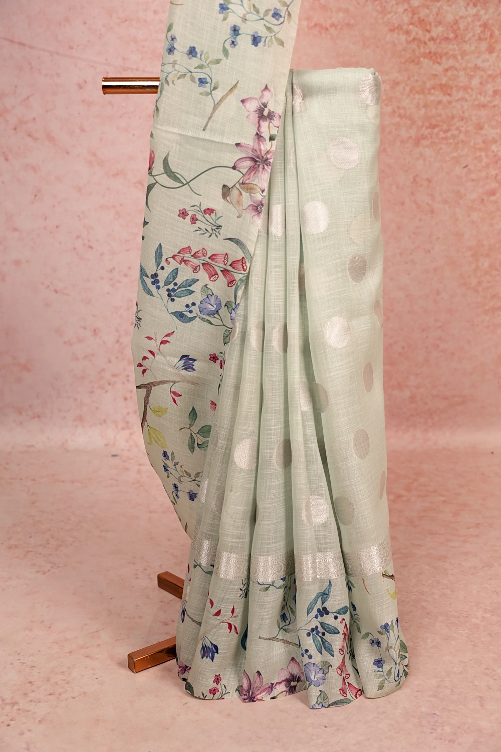 Sea Green Semi Linen Printed Saree with Designer Border. Includes Unstitched Blouse