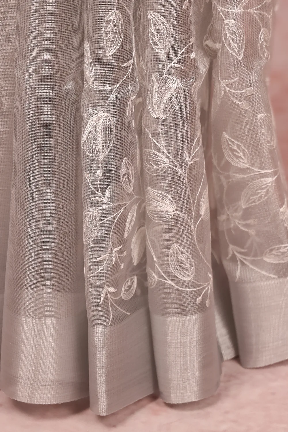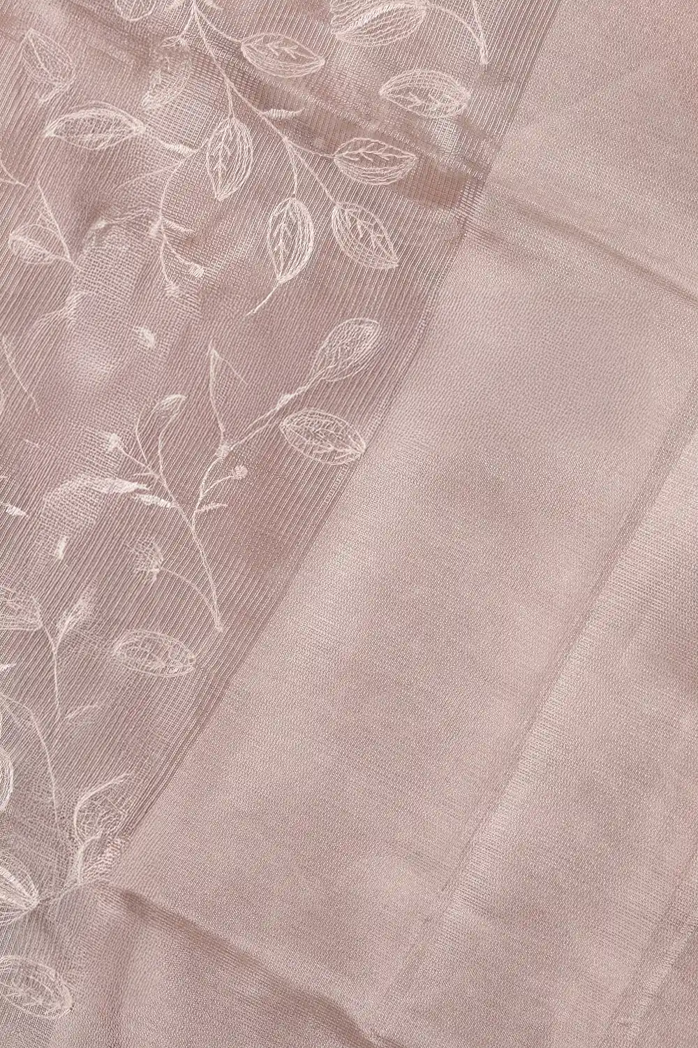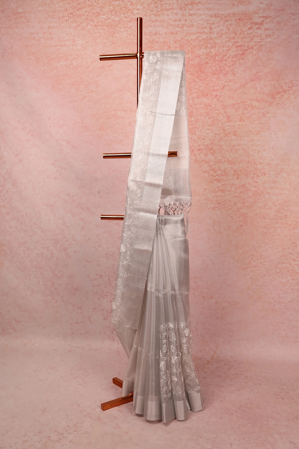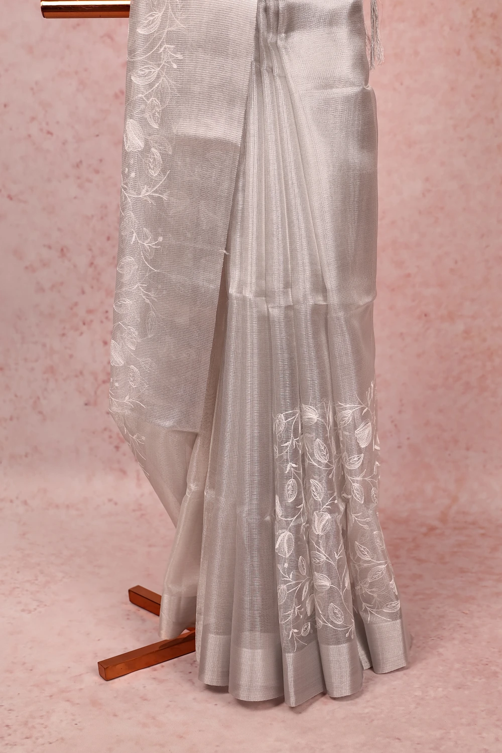Silver Semi Tissue Embroidery Saree with Plain Border. Includes Unstitched Blouse